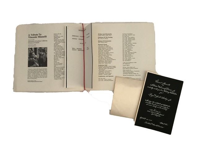 Wedding invitation from Vicente Minnelli and Sammy Davis Jr for Liza Minnelli and Jack Haley Jr September 13, 1974 in excellent condition. Also included is a special program tribute to Vicente Minnelli presented by USC Cinema dated February 6, 1977.