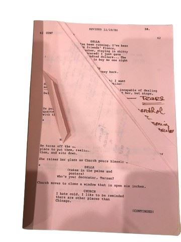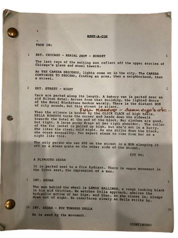 Rent-a-Cop on set used script and 2 days of call sheets for Liza Minnelli, dated 11/18/86 and 11/19/86. The script features handwritten notes for makeup or costume looks she should wear and what to use to make her cry. There are also some turned down pages inside the script.