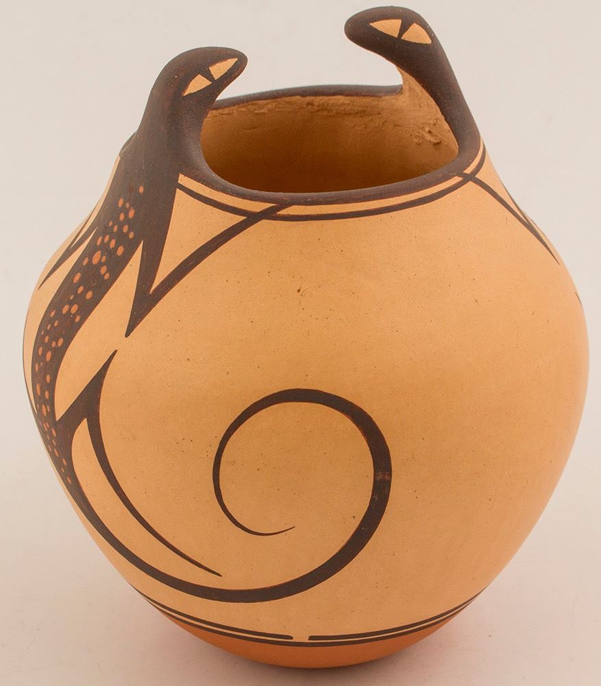 Small lizard jar by Anderson & Avelia Peynetsa. 2 lizards looking over the rim of the pot, 5" h x 4.25" diameter. Anderson Peynetsa of Zuni Pueblo works in collaboration with his wife, Avelia Peynetsa. He has been an active potter since the early 80s. He has exhibited at the Heard Museum, the Museum of Northern Arizona, the Indian Market in Santa Fe and the Eight Northern Indian Pueblos. Date: Location: Zuni Pueblo, New Mexico HWAC # 52742