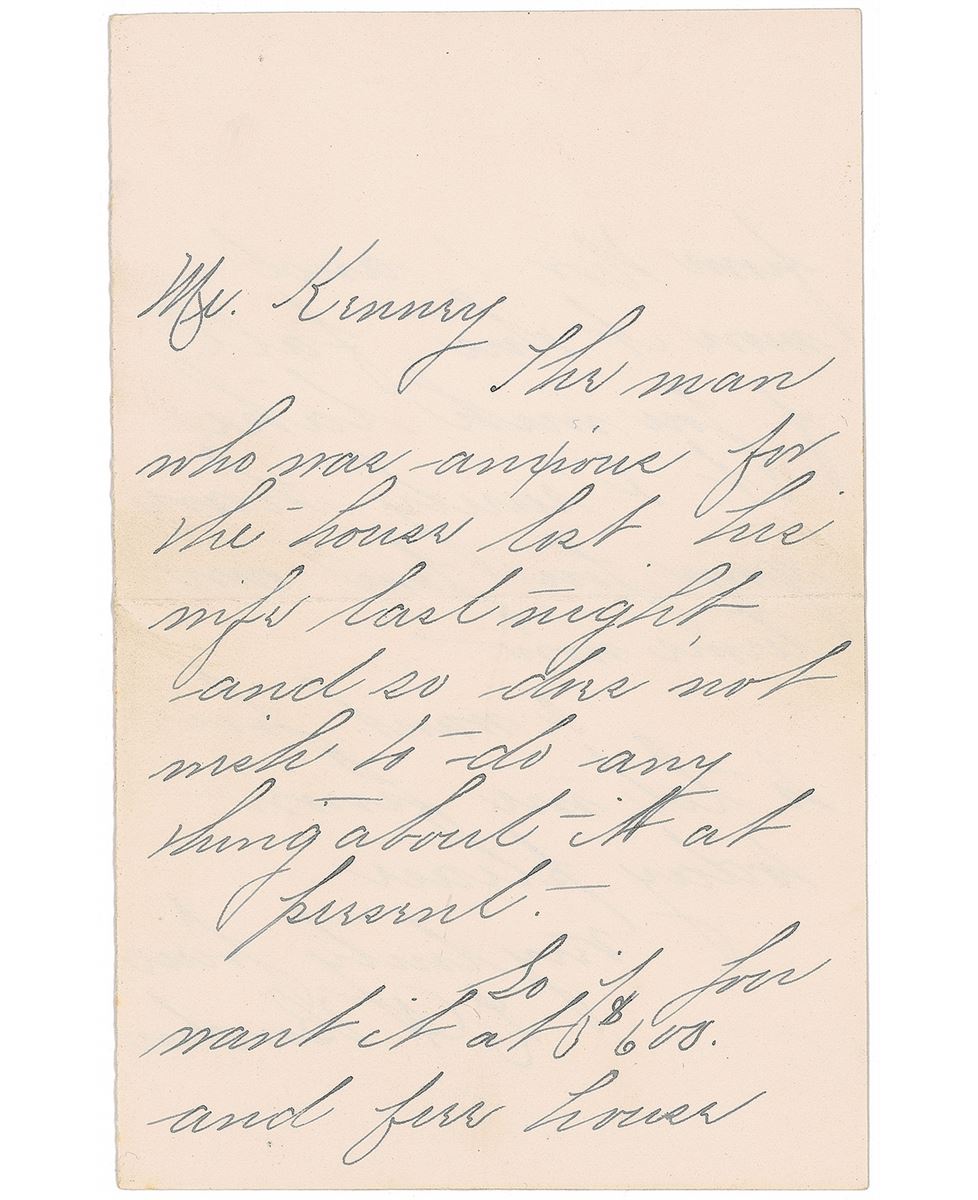 After her acquittal in June of 1893, Lizzie Borden moved to Maplecroft, an enormous Victorian home at 306 French Street in Fall River’s fashionable Highlands neighborhood. Already infamous and unwelcome, she did nothing to gain friends on her new street, frequently throwing loud and lavish parties into the early morning hours, and complaining about other residents’ habits. She was especially antagonistic towards this letter’s recipient, James Kenney, whose property abutted her own; in 1897 she purchased the lot on which he lived, forcing him to relocate his house shortly after. Autographically scarce, items written by the notorious American folk figure are difficult to find and always in demand.