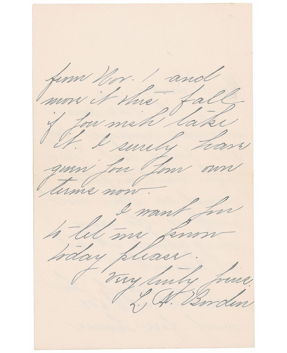 American woman (1860–1927) who was tried and acquitted in the 1892 axe murders of her father and stepmother in Fall River, Massachusetts. The saga ultimately become one of the most celebrated unsolved cases in the history of American crime. ALS signed “L. A. Borden,” one page both sides, 3.75 x 6, no date. Letter to her neighbor James Kenney, in full: “The man who was anxious for the house lost his wife last night, and so does not wish to do anything about it at present. So if you want it at $600 and free house from Nov. 1 and move it this fall if you wish take it. I surely have given you your own terms now. I want you to let me know today please.” In fine condition.