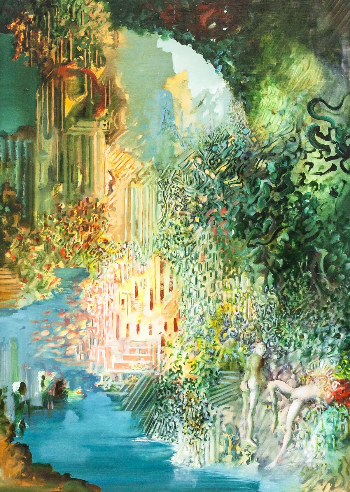 Oil on canvas, framed. Featuring fantastical and surrealist composition. "2 Les grottes des desirs Ljuba Paris 1987" inscribed on verso. Ljuba Papovic (1934-2016, Serbian). 73 x 54 cm (28.75 x 21.25 in), Frame: 75 x 55.5 cm (29.5 x 22 in). Provenance: Private Collection New York City