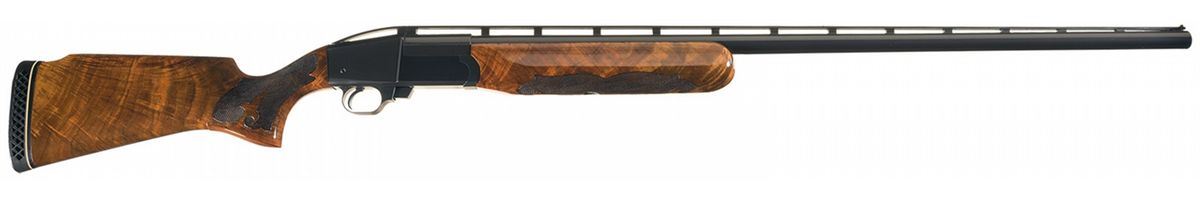 This example has two white bead sights, is choked .035 with wad catching rings and a 2 3/4 inch chamber with an ejector. Mounted on a beautifully figured, hand checkered walnut forearm and pistol grip stock with contrasting grip cap, raised comb and Pachmayr recoil pad.