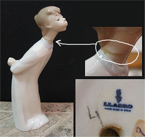 Lladro #4869 "Boy Blowing" Height 7.75", open issue, retired. Issued in 1974. Last yr. available 1997. No chips or cracks, neck has been broken and re-glued. No box