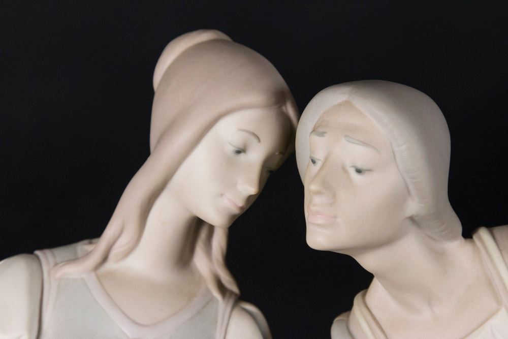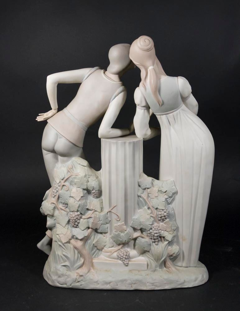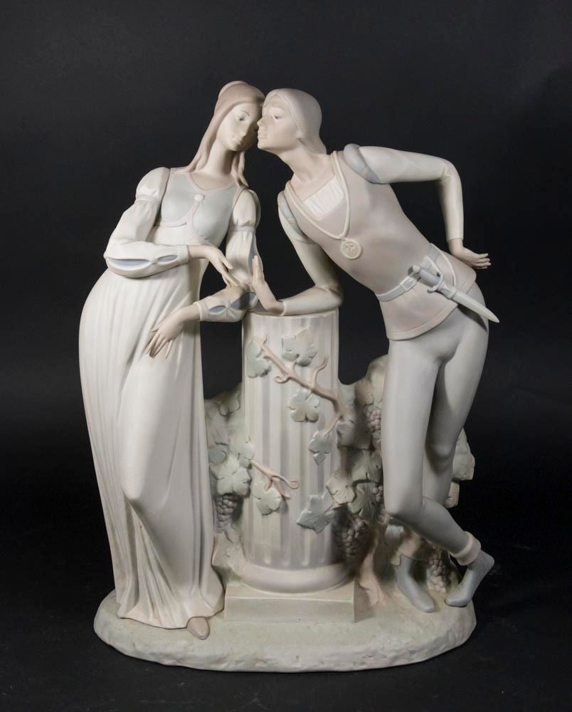 Bisque/matte. Romeo & Juliet leaning into each other. Pale green, tan, and beige. Approx. 17 3/4" H x 13" W. (6072) Excellent condition.