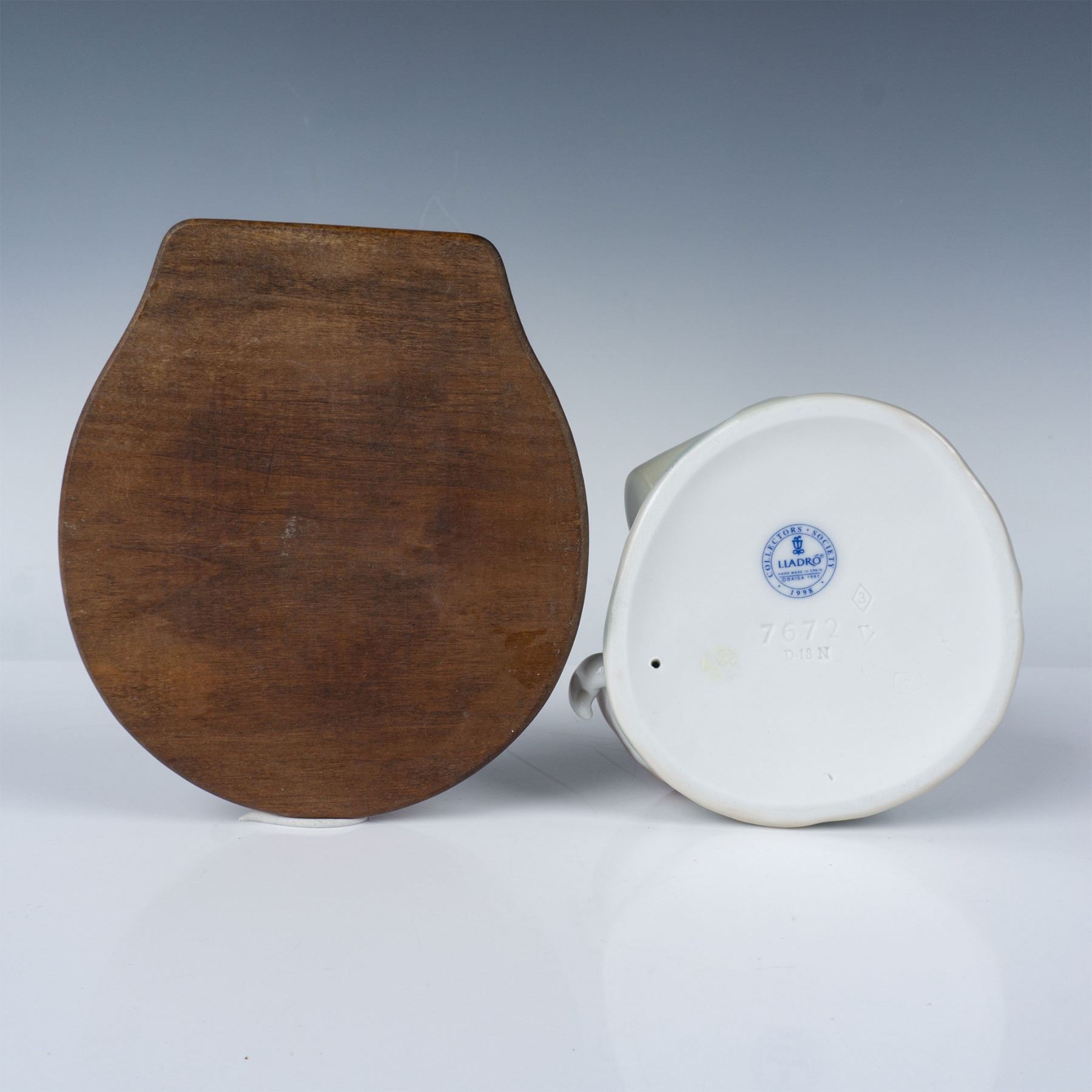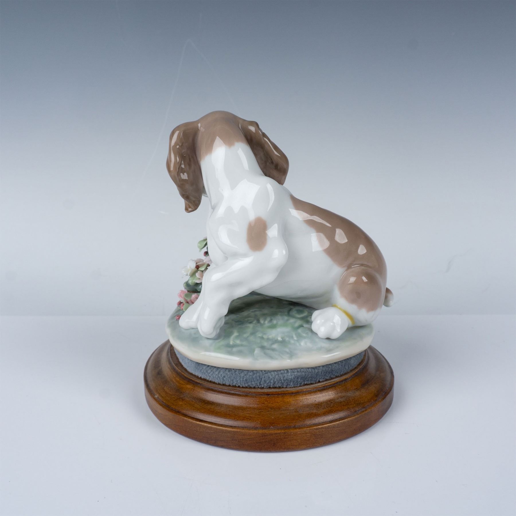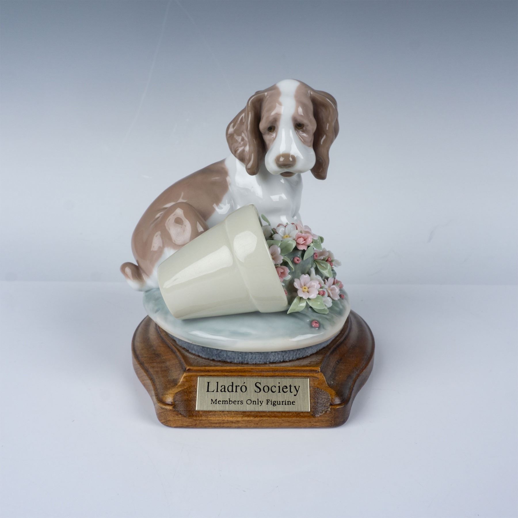 This Lladro porcelain figurine depicts an endearing puppy alongside an overturned flower pot filled with delicate pastel-colored flowers. Created with exquisite attention to detail, this piece captures the charm and playfulness of the scene, highlighting Lladro's mastery in porcelain artistry. This item has a Lladro Society base included.