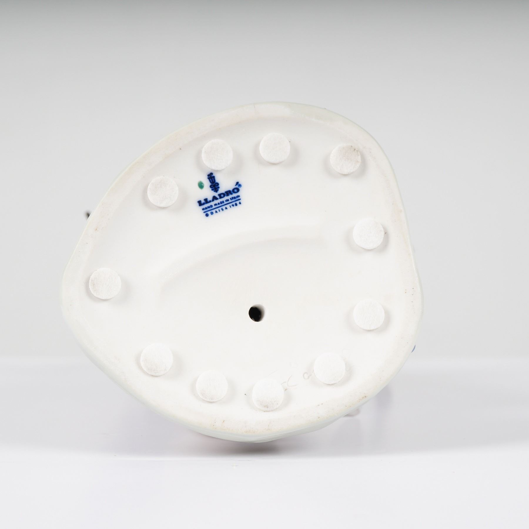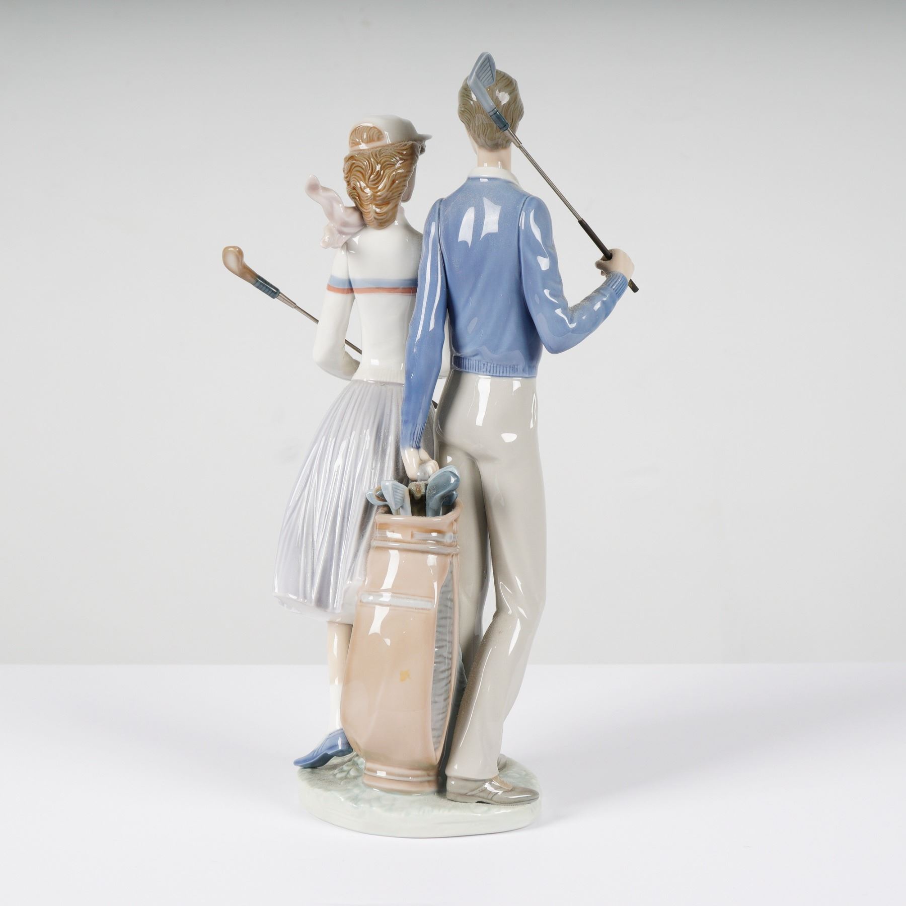This Lladro porcelain figurine, titled Golfing Couple (model 1001453), was designed by sculptor Jose Puche and issued in 1983. The high-gloss glazed piece depicts a young man and woman in vintage-style golf attire. The male figure is dressed in a blue V-neck sweater and tan trousers, while the female figure wears a white sweater with red and blue stripes, a lavender pleated skirt, and a white visor. The underside features the blue underglaze Lladro factory mark with the bellflower logo, LLADRO, HAND MADE IN SPAIN, and (c) DAISA 1984. It also includes an incised mark and a hand-painted green decorator dot. The figurine includes two separate mixed-material golf club accessories. Height: 13.75 inches.