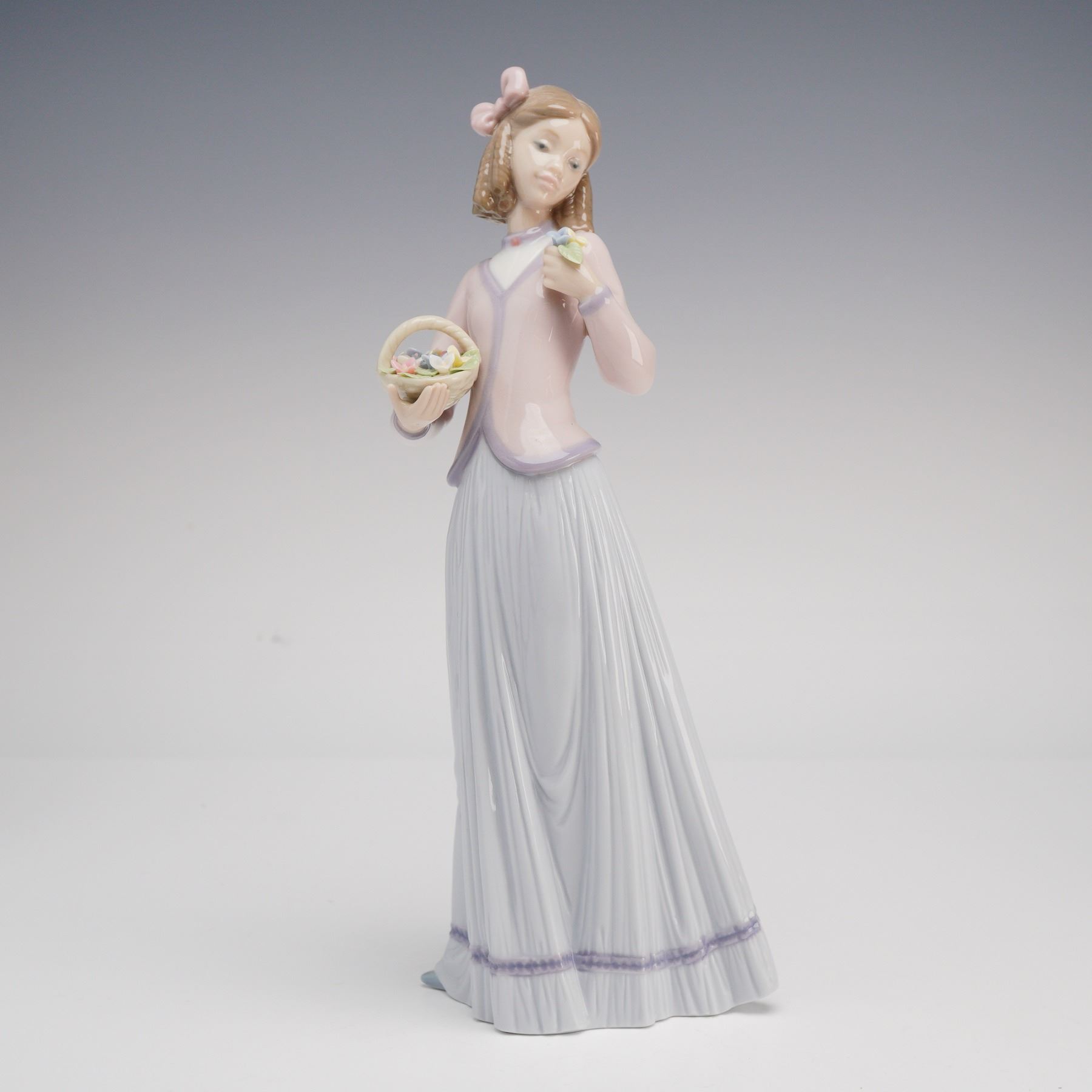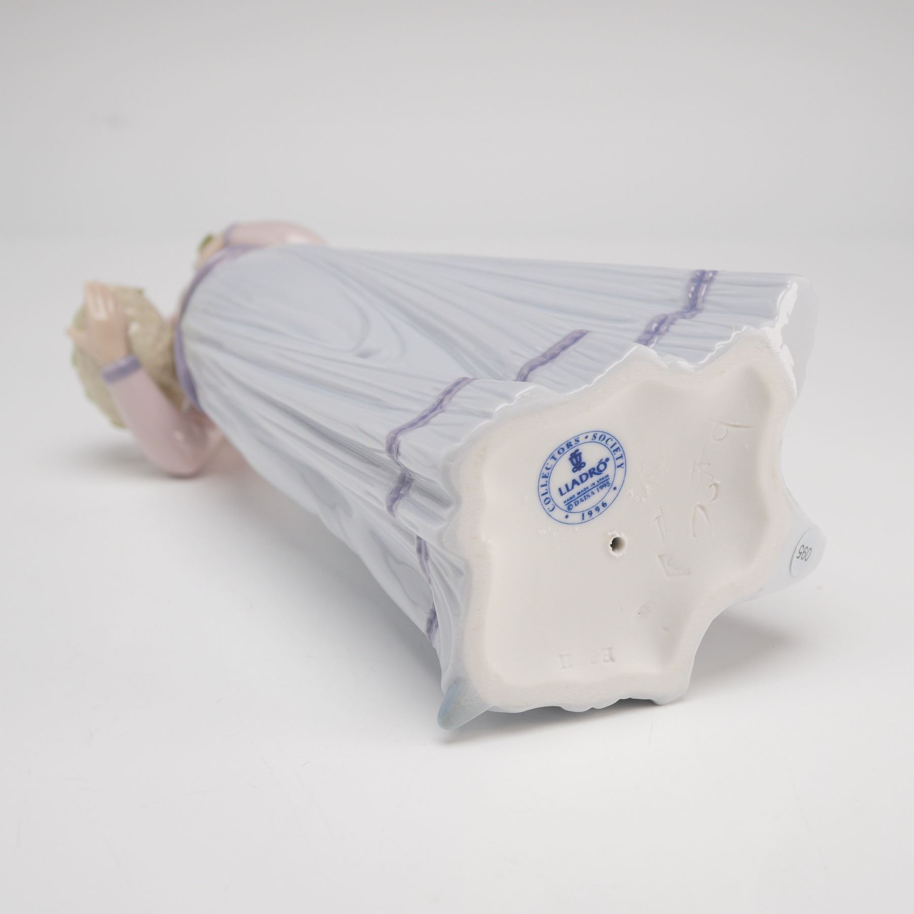 This Lladro glazed porcelain figurine is titled Innocence in Bloom (model number 7644) and was issued as the Collectors Society annual piece for 1996. The figurine depicts a graceful young woman in a pensive pose, wearing a full-length, pleated pale lavender skirt with a dark purple trim near the hem and a soft pink jacket with purple edging over a white high-necked blouse. Her hair is styled with a large pink ribbon, and she holds a basket filled with delicate, multi-colored flowers in her right hand while cradling a single blossom in her left. The underside of the base features the blue Lladro factory stamp: LLADR"o HAND MADE IN SPAIN (c) DAISA 1995, and bears the specific COLLECTORS SOCIETY 1996 circular logo. The model number 7644 is incised into the porcelain on the base alongside various hand-painted and incised artisan marks. Height: 9.75 inches.