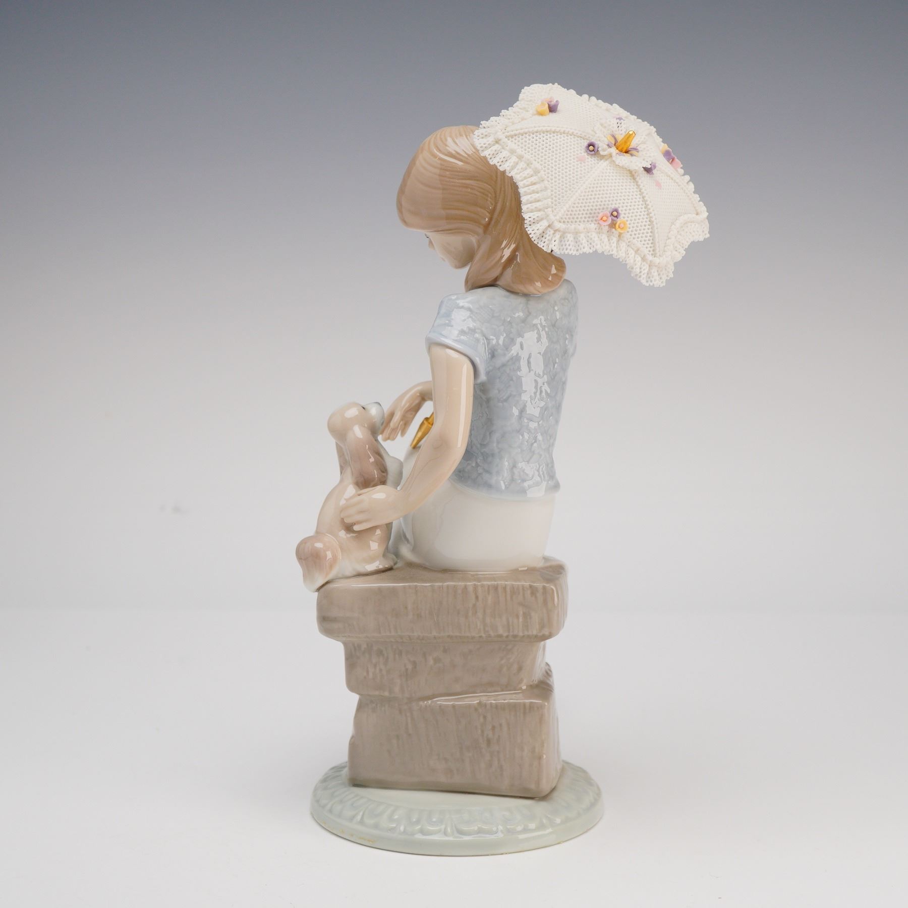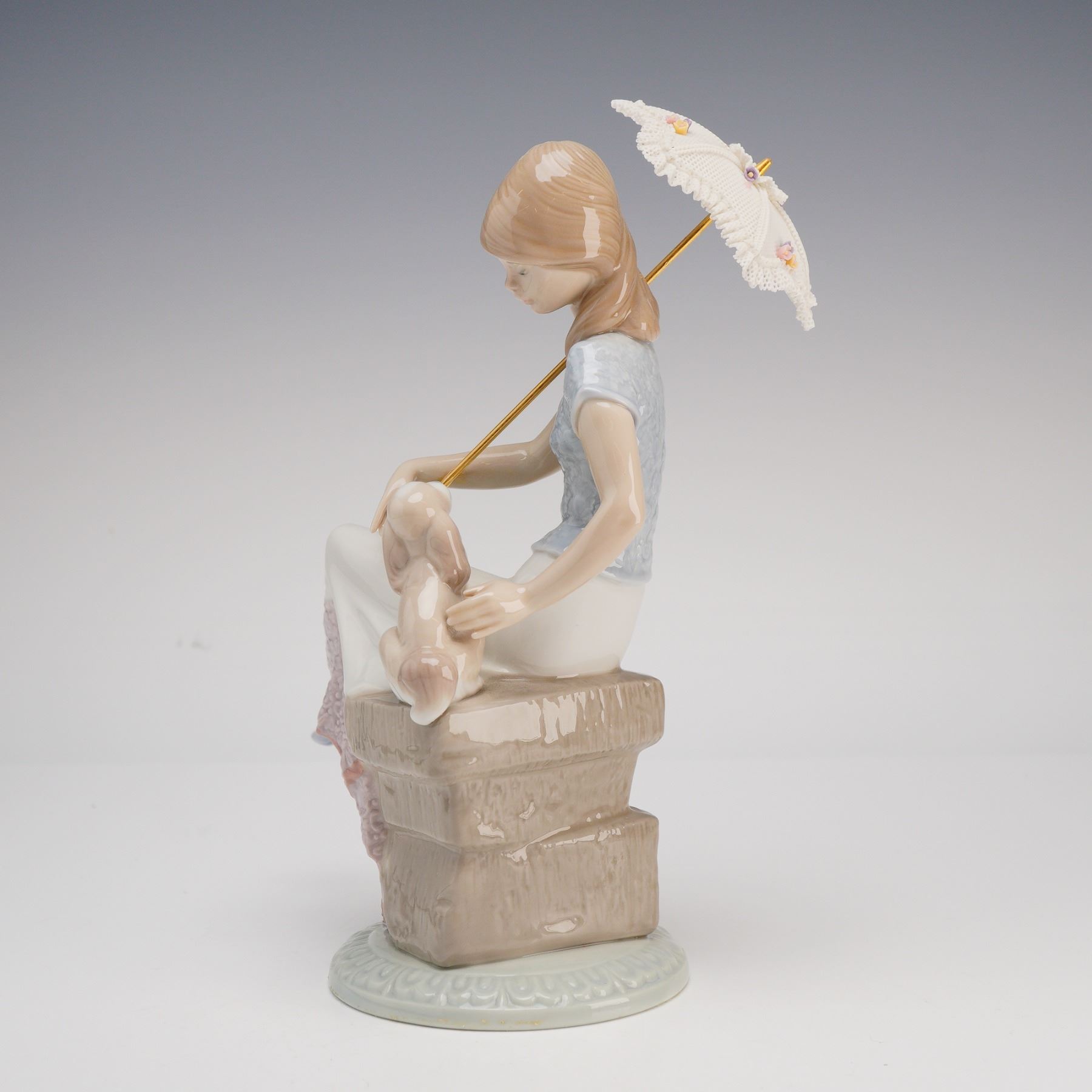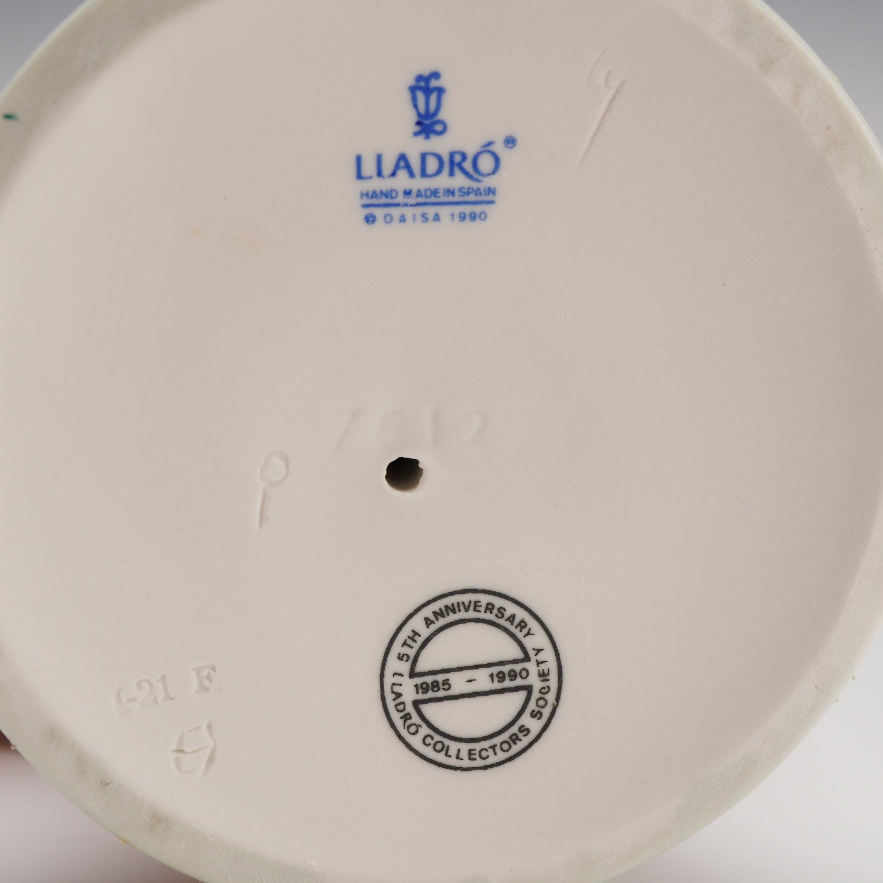 This Lladro porcelain figurine, titled Picture Perfect (model number 7612), was issued as a commemorative piece for the 5th Anniversary of the Lladro Collectors Society. The hand-painted glazed figurine depicts a young woman seated on a weathered stone pedestal, holding a delicate white parasol with a gilded stem and applied pastel flowers. She is shown leaning forward to pet a small tan and white puppy standing on its hind legs. She wears a textured light blue short-sleeved top and a long white skirt with a pale pink lace-patterned overlay and ruffled hem. The underside bears the official blue Lladro bell logo, Hand Made in Spain, (c) DAISA 1990, and the incised model number 7612. It also features the special edition circular black stamp for the 5th Anniversary Lladro Collectors Society 1985 - 1990 along with various artisan production marks including L-21 F and P. Height: 8.25 inches.