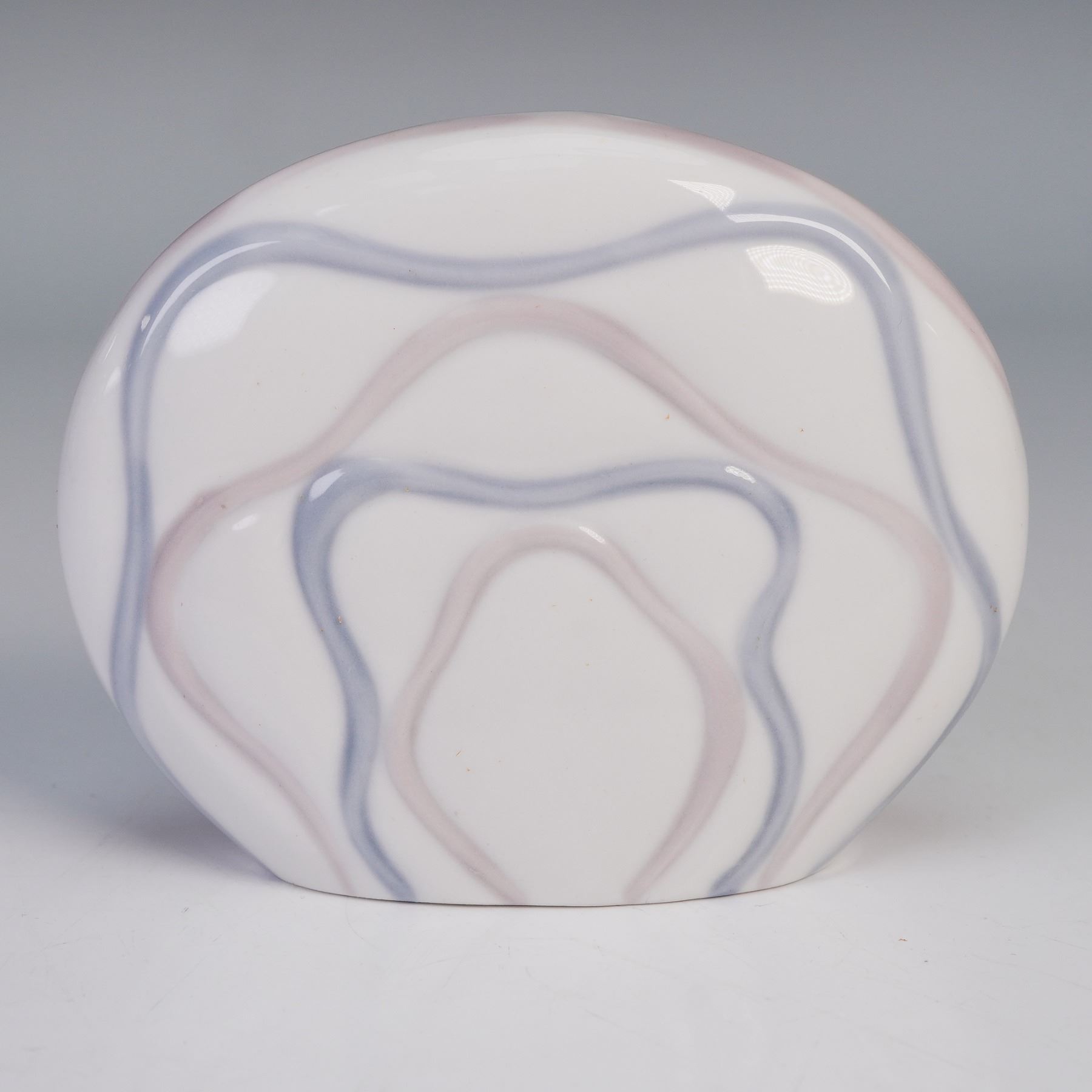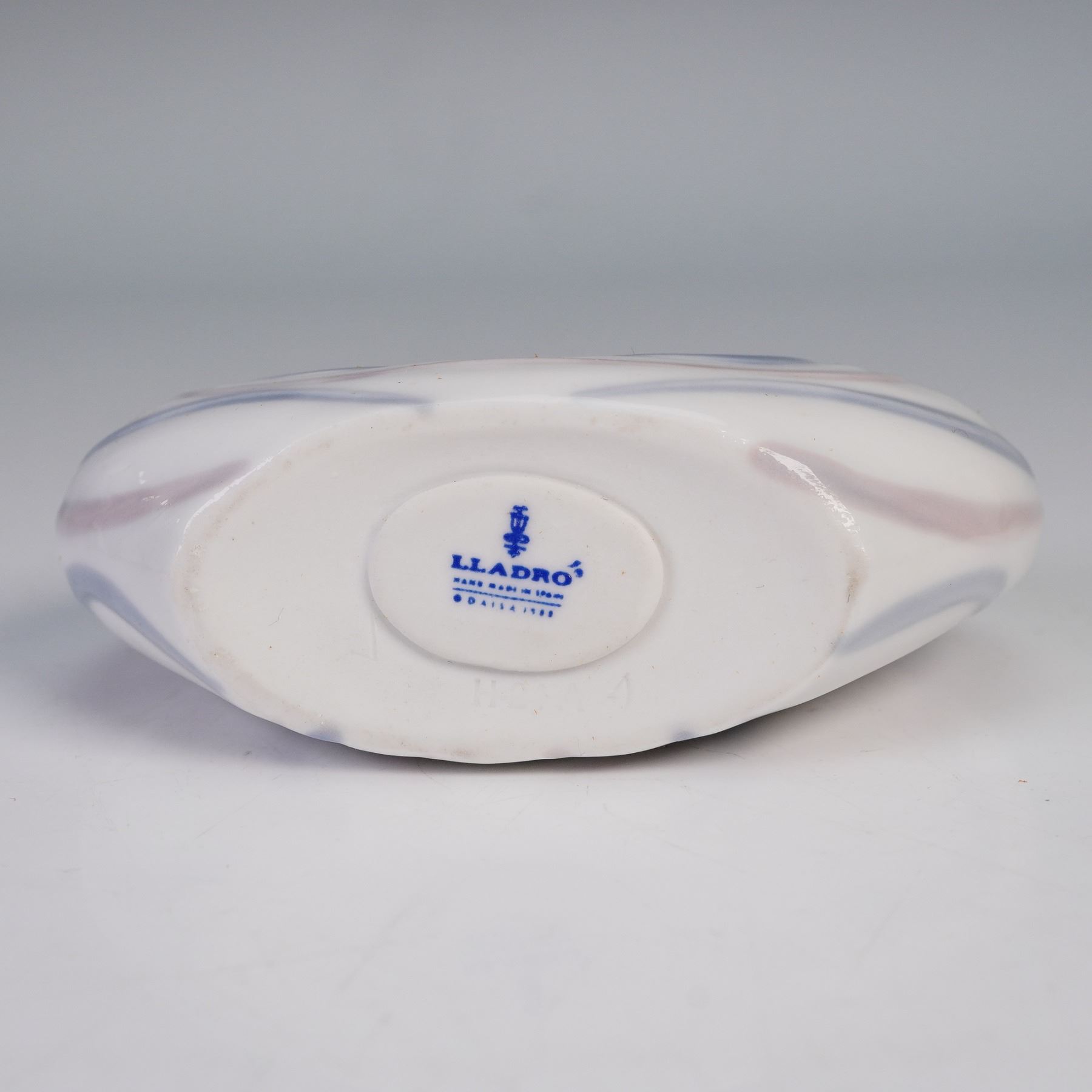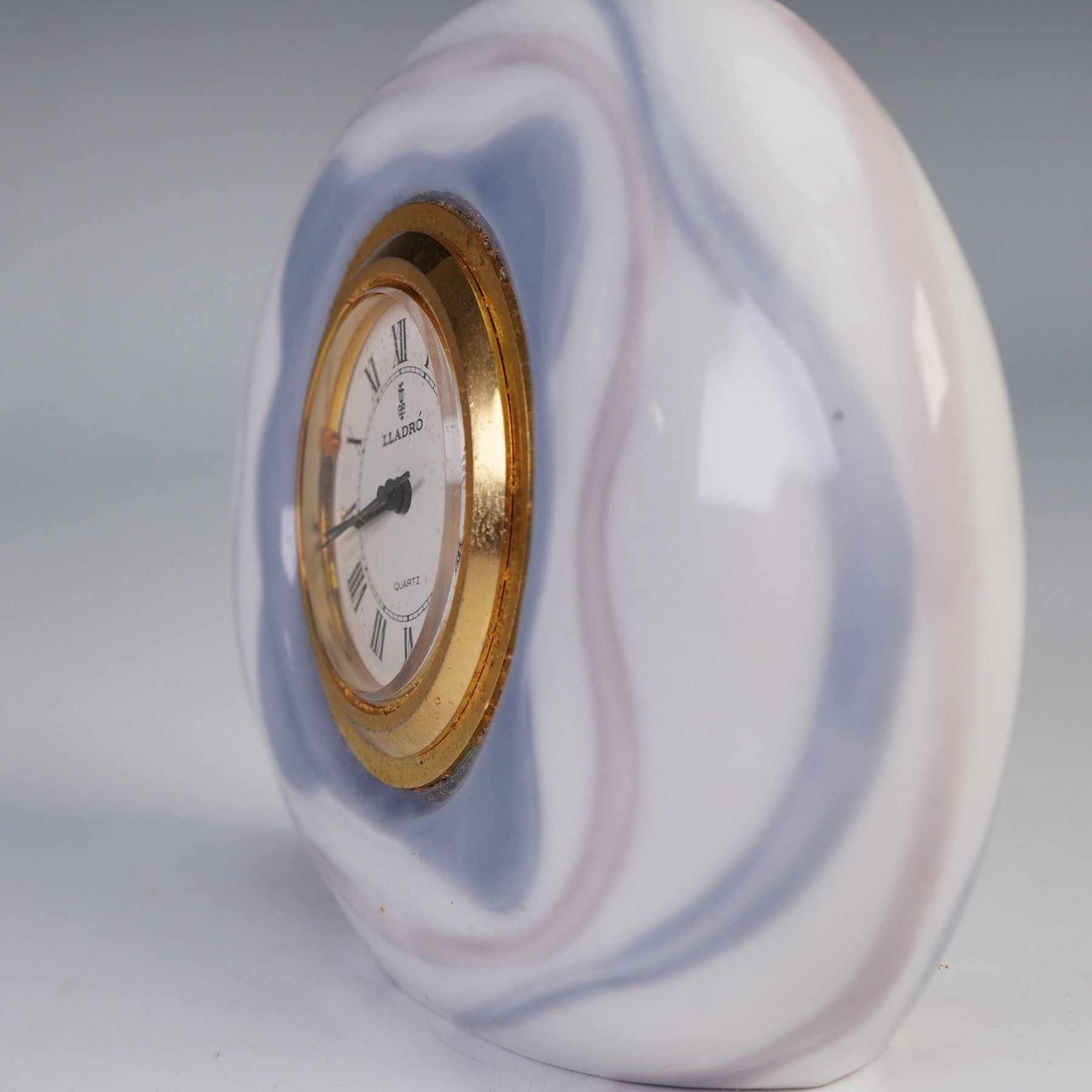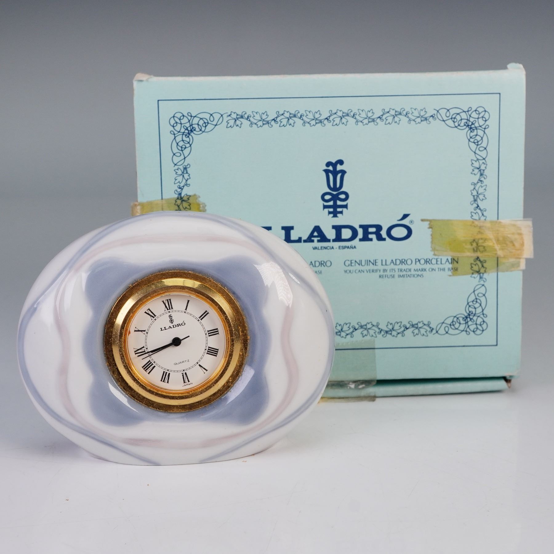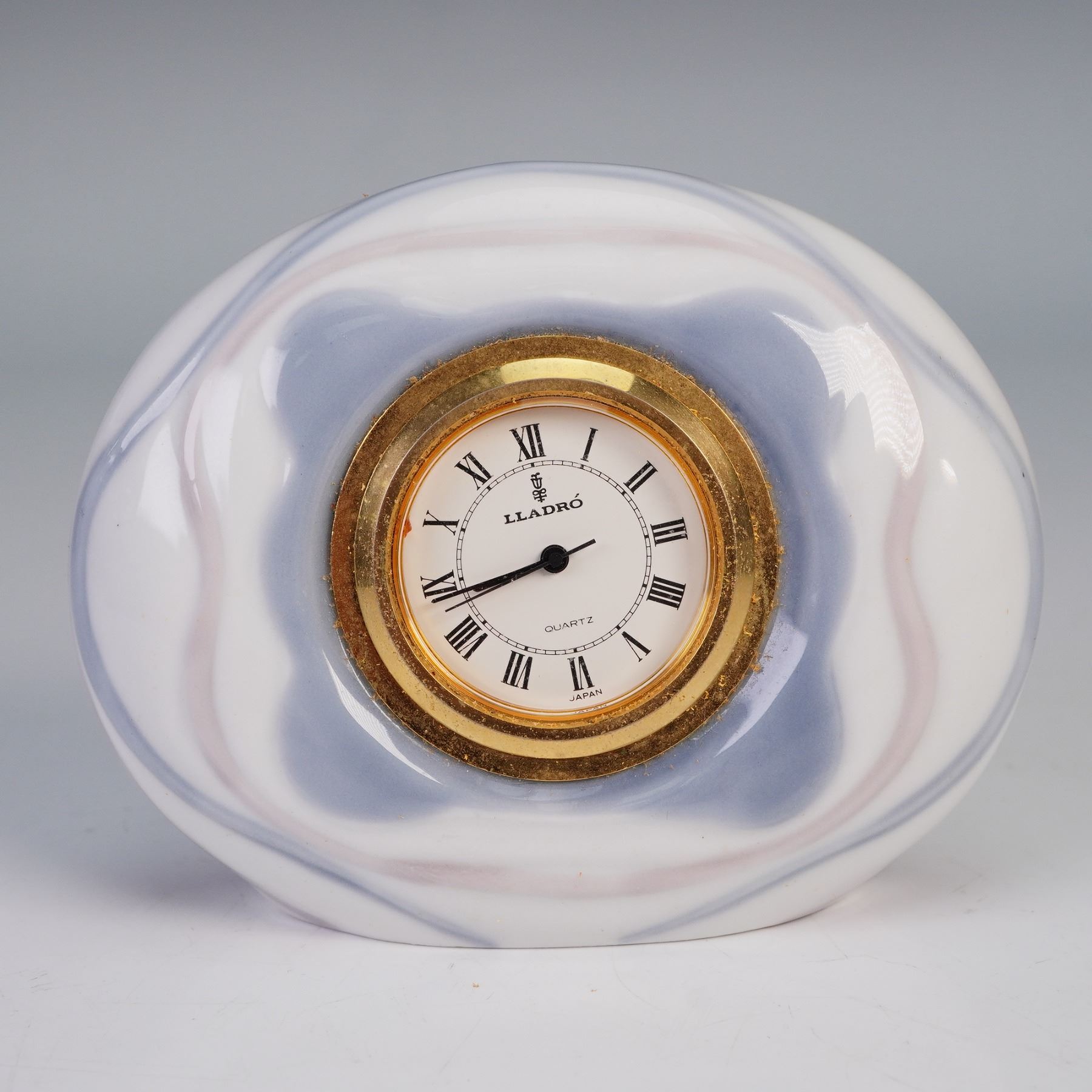 A refined Lladro porcelain Avila clock, model number 1005653. Issued in 1989, this piece features a gently rounded form with flowing pastel bands in lavender and rose tones, framing a gold-rimmed quartz clock with Roman numerals. The porcelain case is finished with a glossy glaze and marked on the underside with the official Lladro backstamp. This example is offered complete with its original box.