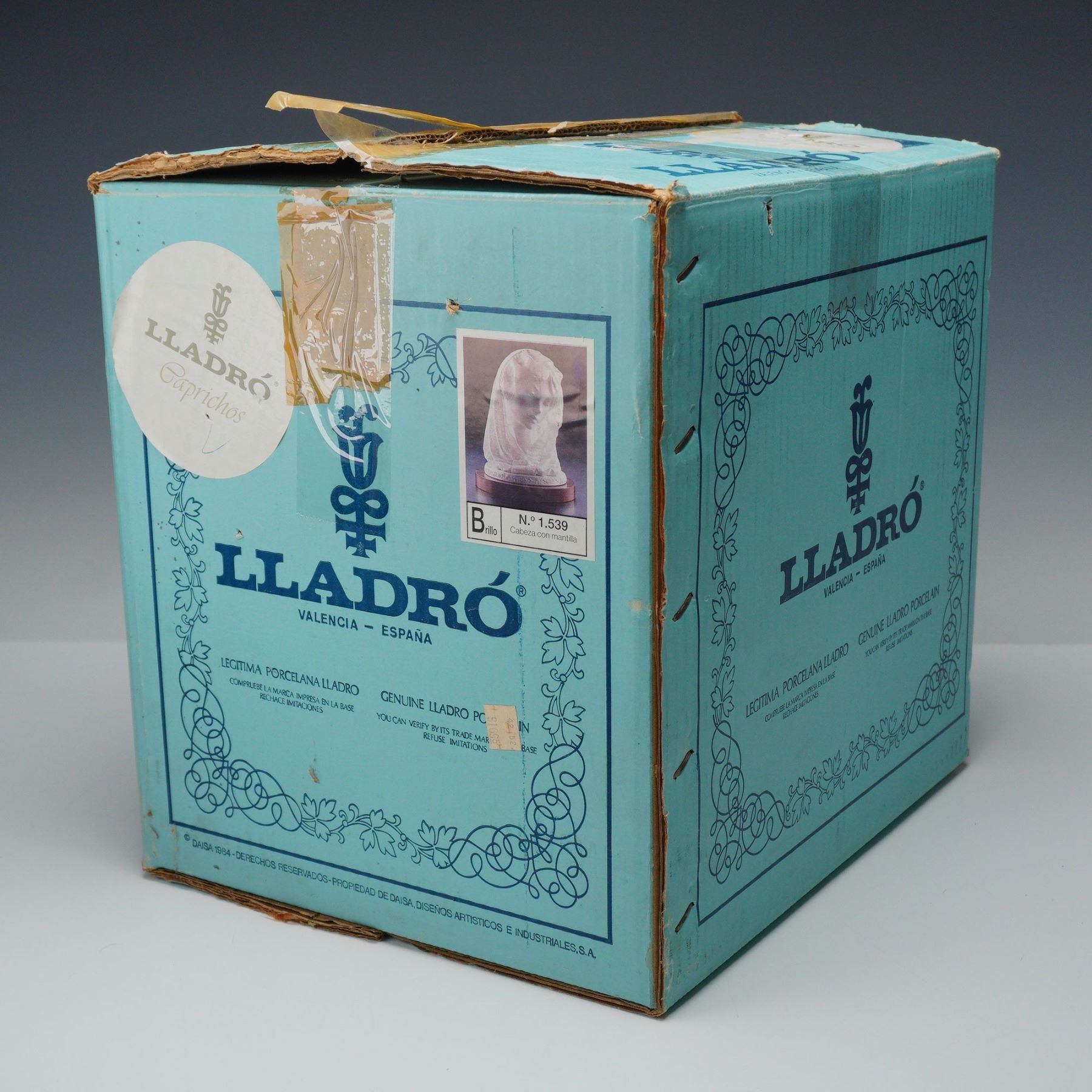 Elegant Lladro porcelain bust titled Small Bust with Veil (01011539), featuring a serene young woman draped in a delicate lace-textured veil. The pure white matte finish enhances the sculptural grace and quiet emotion of the figure, showcasing Lladro's mastery of subtle realism and detail. Presented on a polished wood base and marked with the Lladro blue backstamp on the underside. This sculpture is part of the Caprichos collection, celebrated for its refined expression and soft aesthetic, reminiscent of neoclassical portraiture. Includes the original Lladro box with matching label.