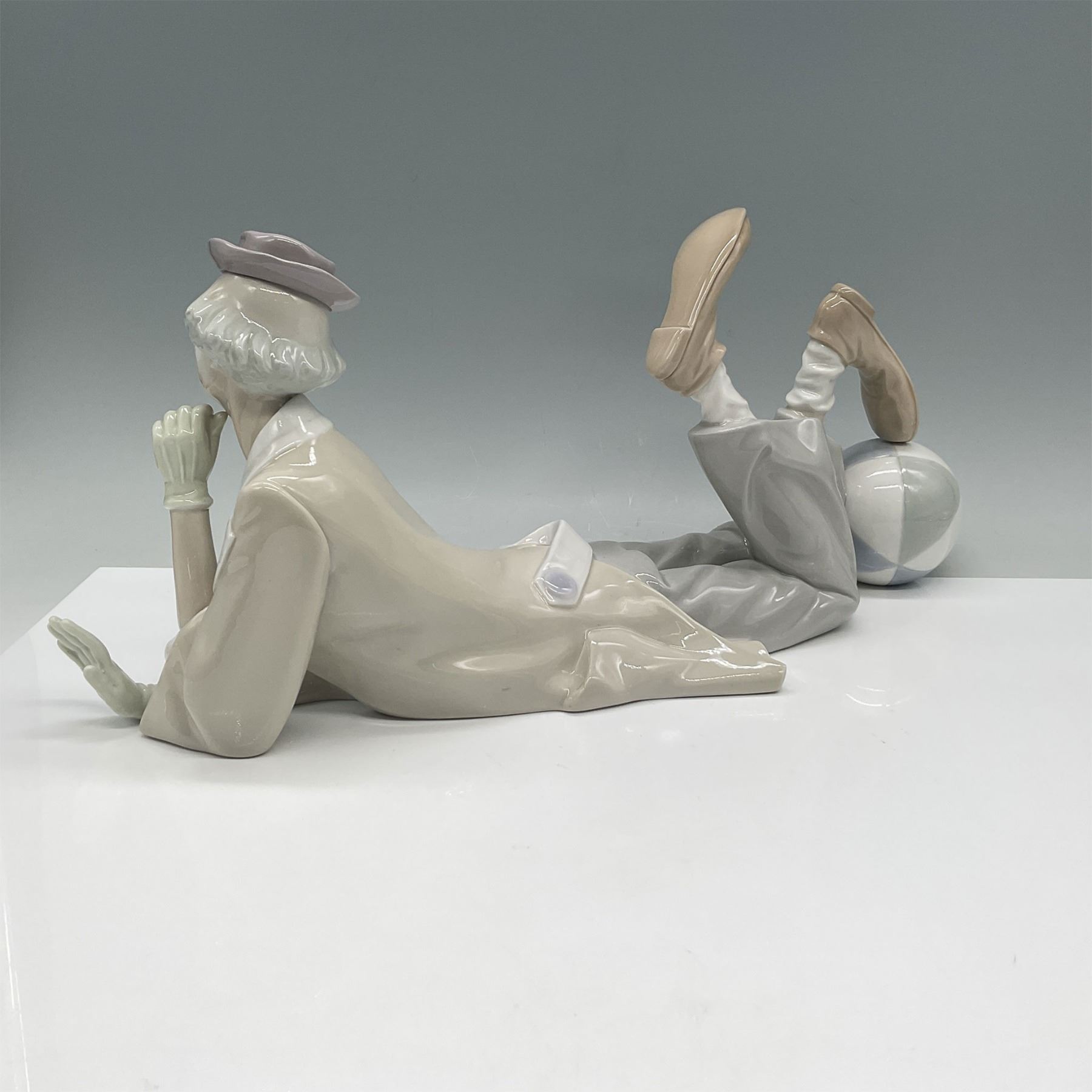 Charming Lladro porcelain figurine titled Reclining Clown, model number 01004618. This playful piece features a whimsical clown resting on his side, thoughtfully posed with a pastel-colored outfit, hat, and a beach ball. Designed and handcrafted in Spain, this piece highlights Lladro signature smooth glaze and intricate detailing. The figurine bears the Lladro hallmark on the base, confirming its authenticity.