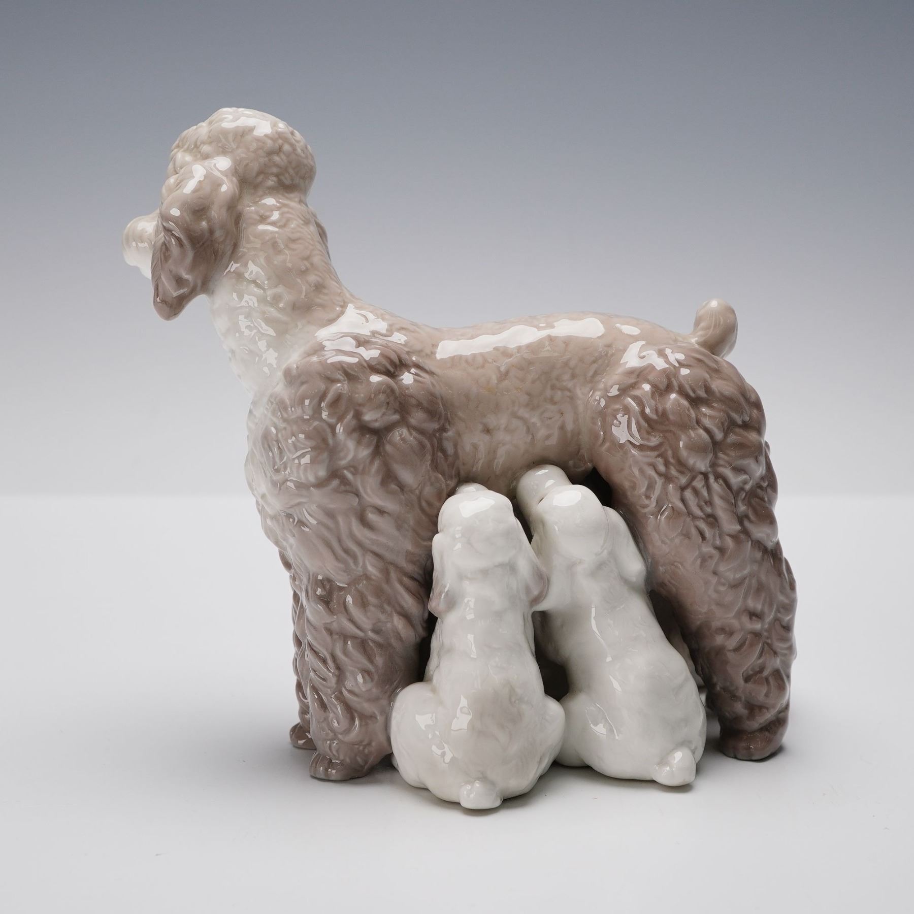 Charming Mother with Pups designed by Antonio Ballester. The piece depicts a mother poodle attentively watching over her playful puppies, rendered in soft pastel glazes of cream and taupe. A beautifully modeled composition that captures Lladro's signature warmth and detail. Marked with the blue Lladro hallmark on the underside.