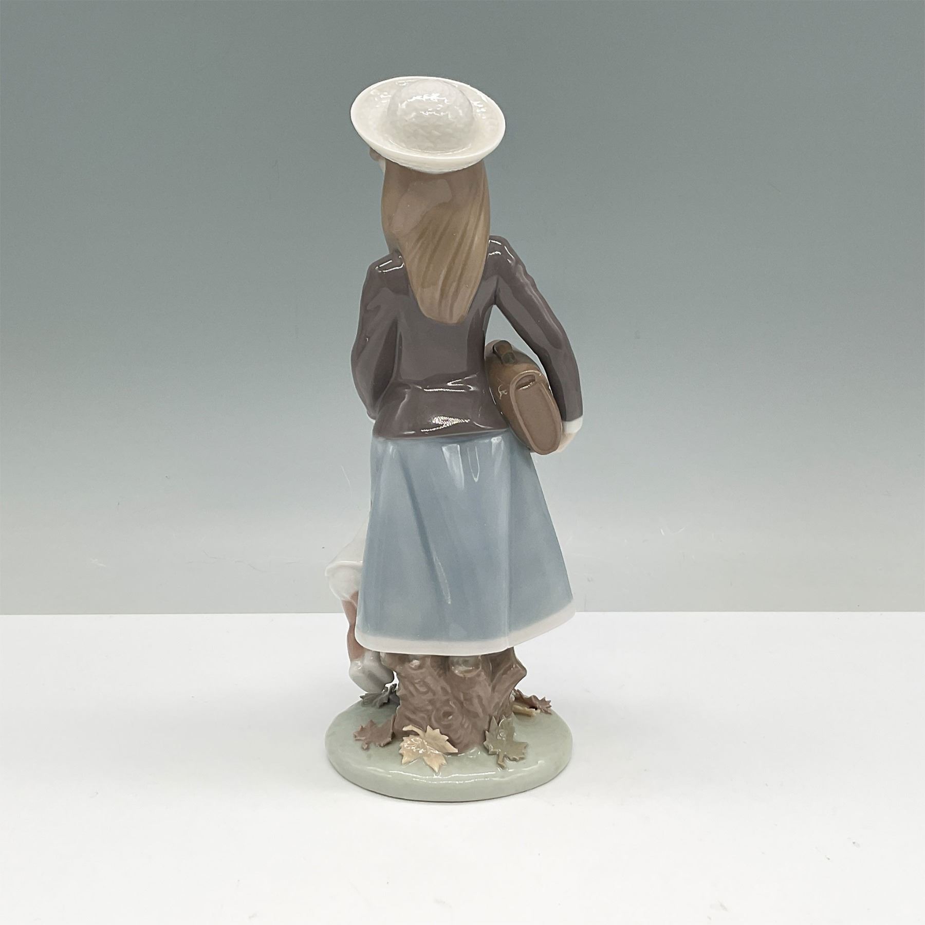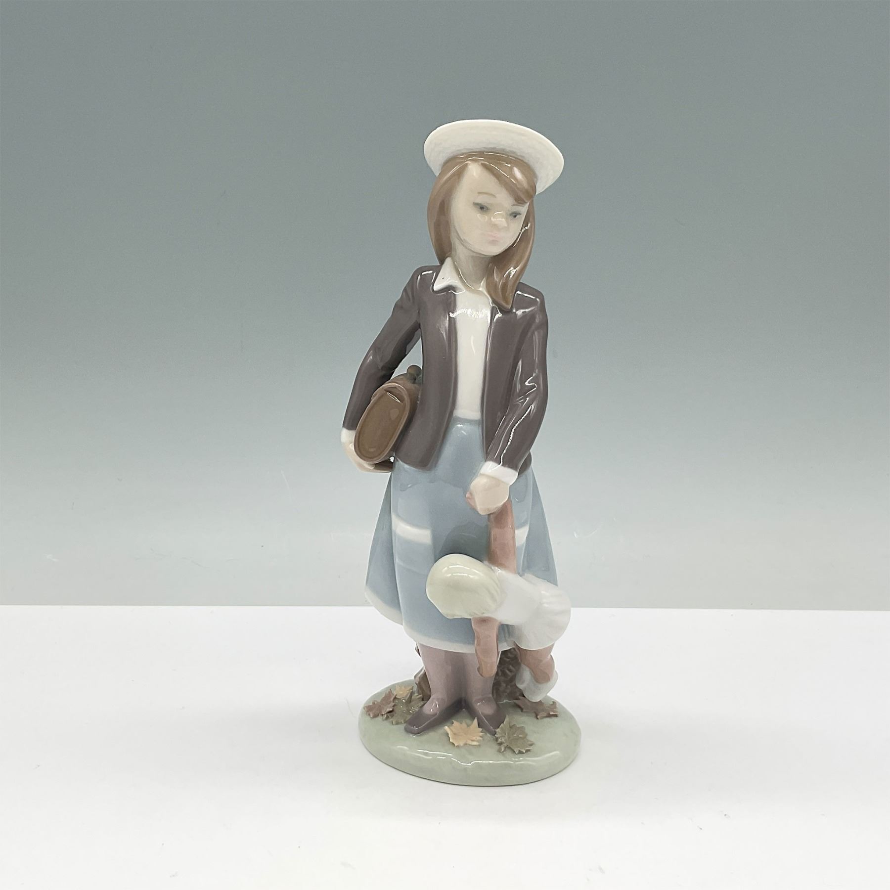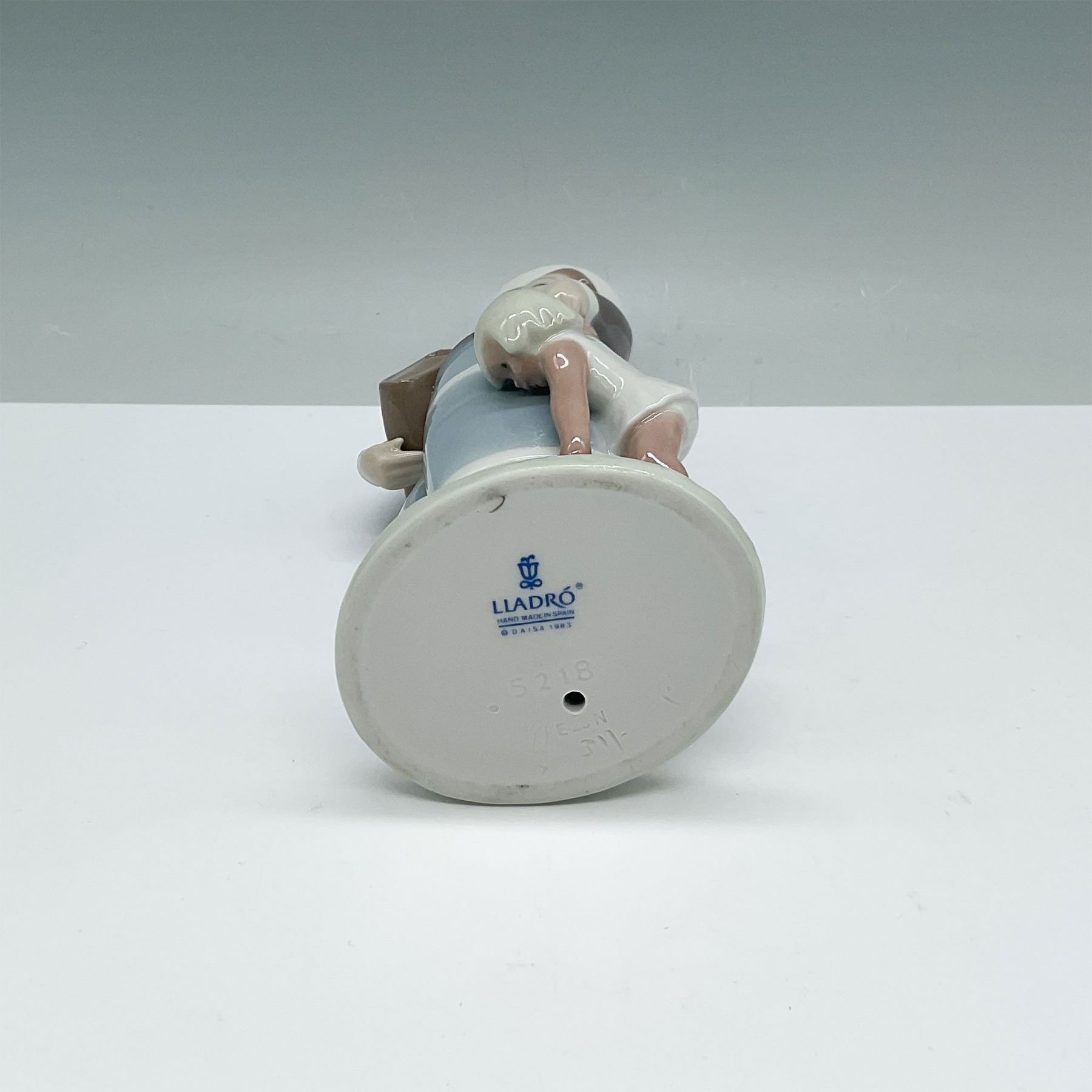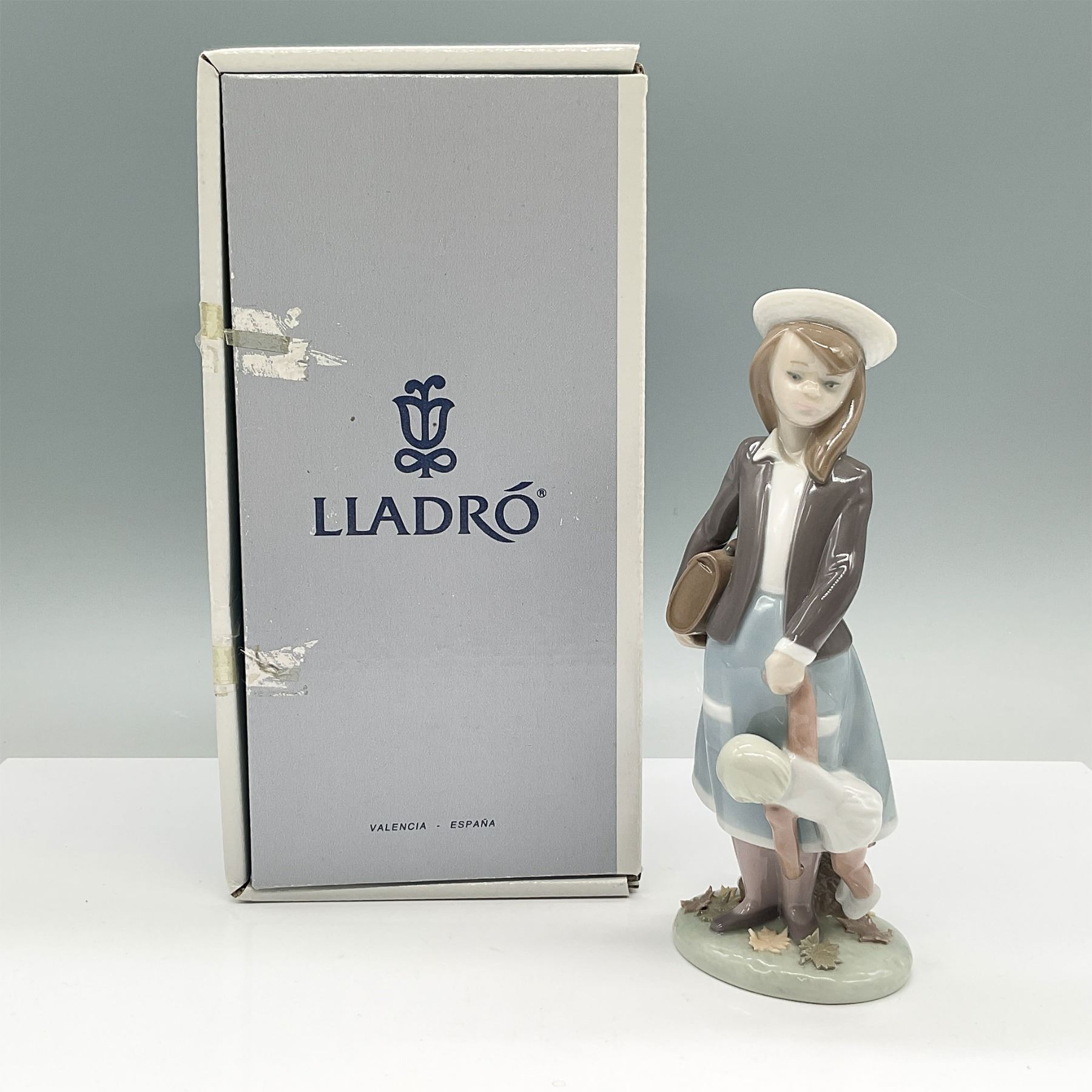 This charming Lladro porcelain figurine, Autumn model number 01005218, was produced from 1983 to 1999. It depicts a young girl holding a doll while standing next to a tree stump with scattered autumn leaves, showcasing Lladro exquisite craftsmanship and pastel color palette. The underside features the official Lladro backstamp, confirming its authenticity. This collectible piece includes its original box, enhancing its appeal to collectors.