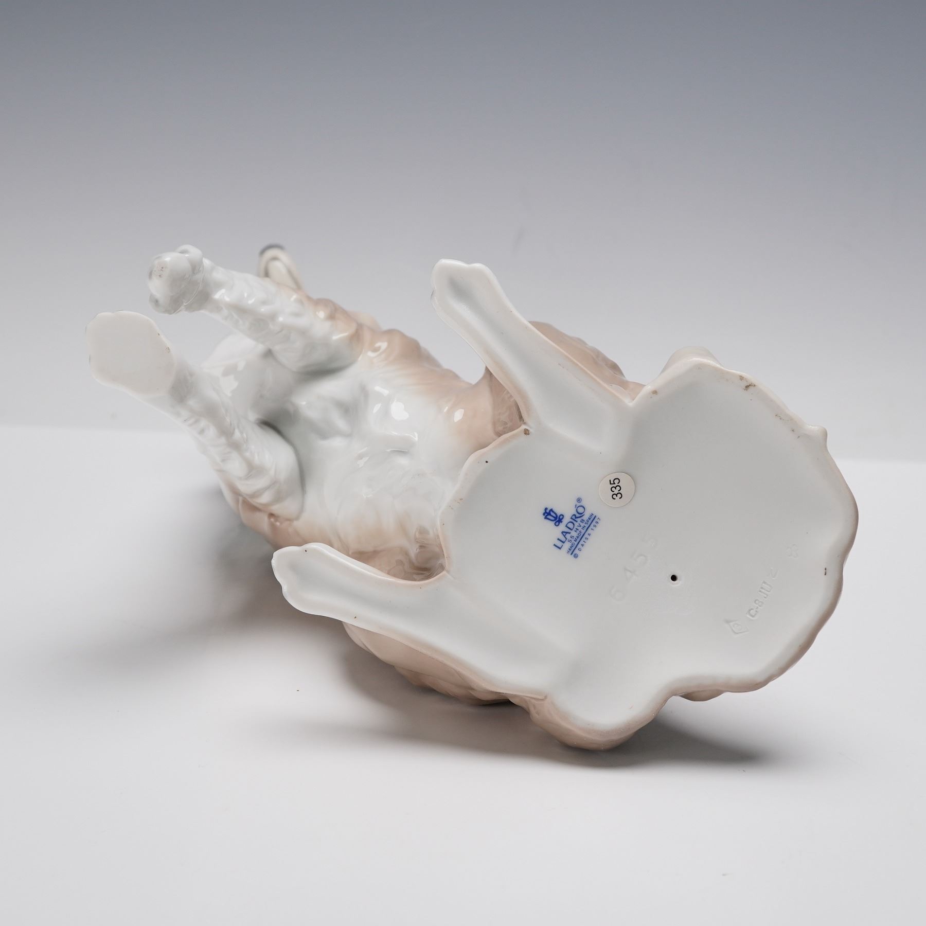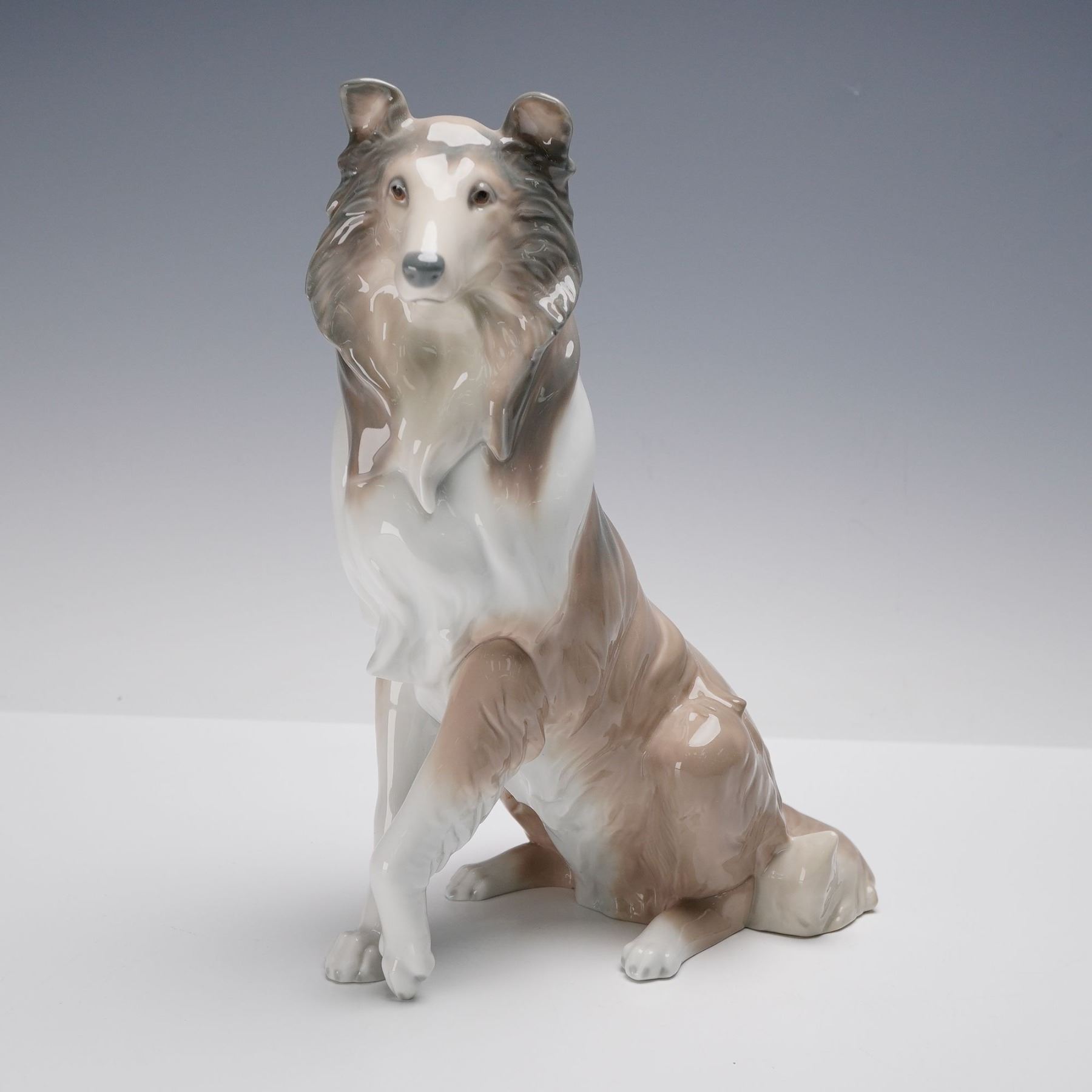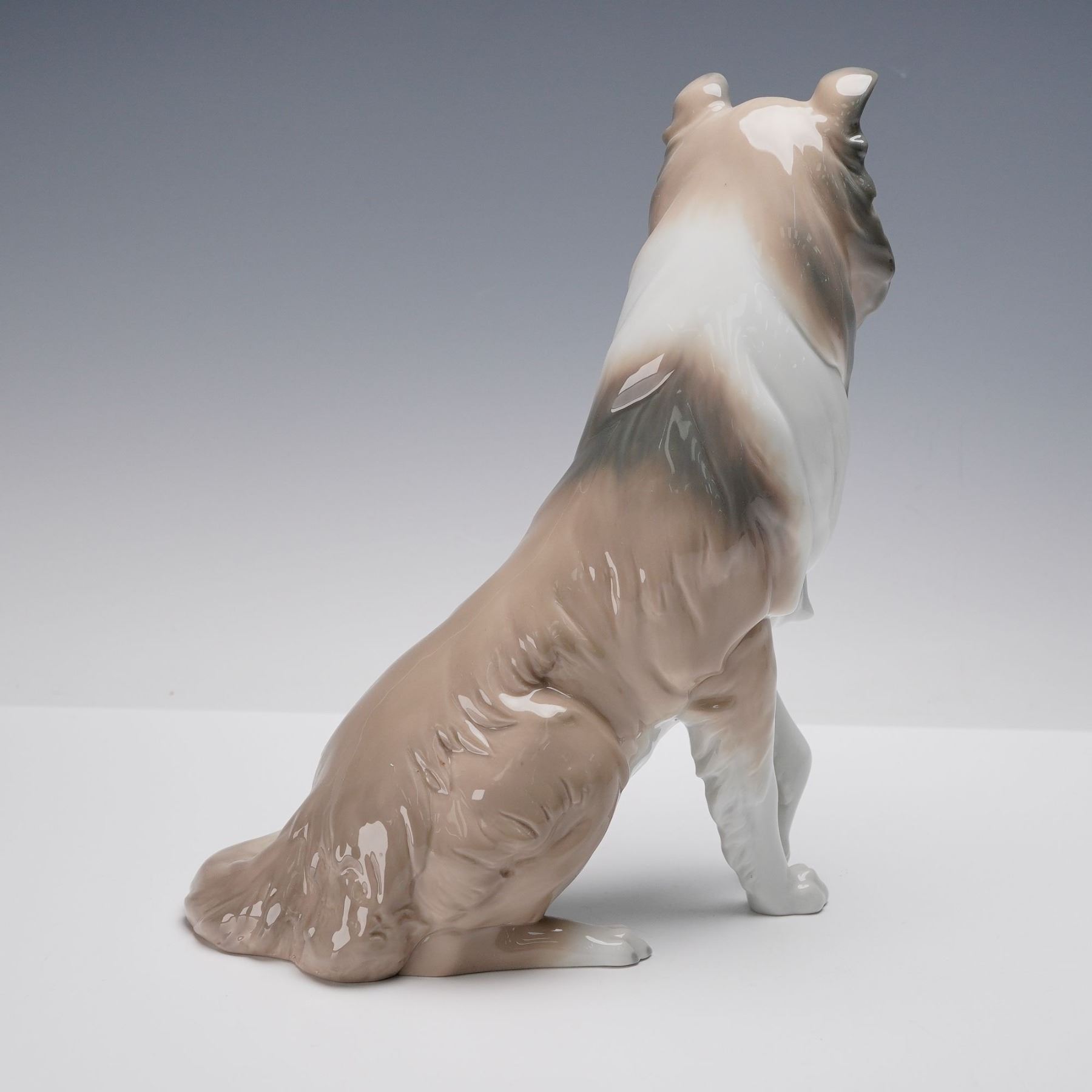Glazed finish figurine depicting a seated Collie rendered in naturalistic tan, white, and sable tones with finely modeled fur texture and attentive expression. Lladro backstamp. This item has its original box.