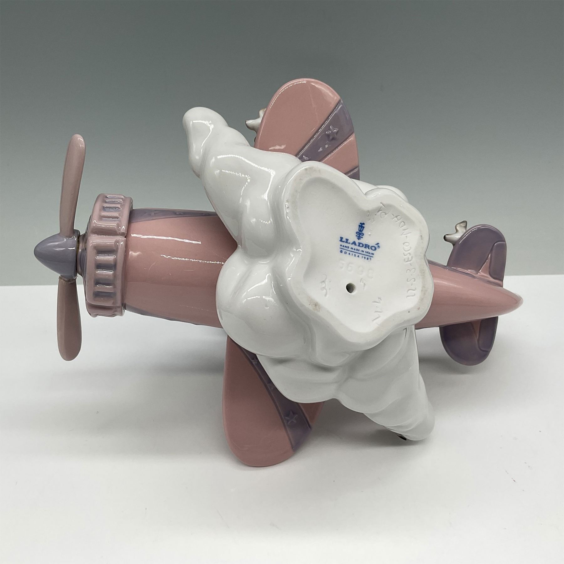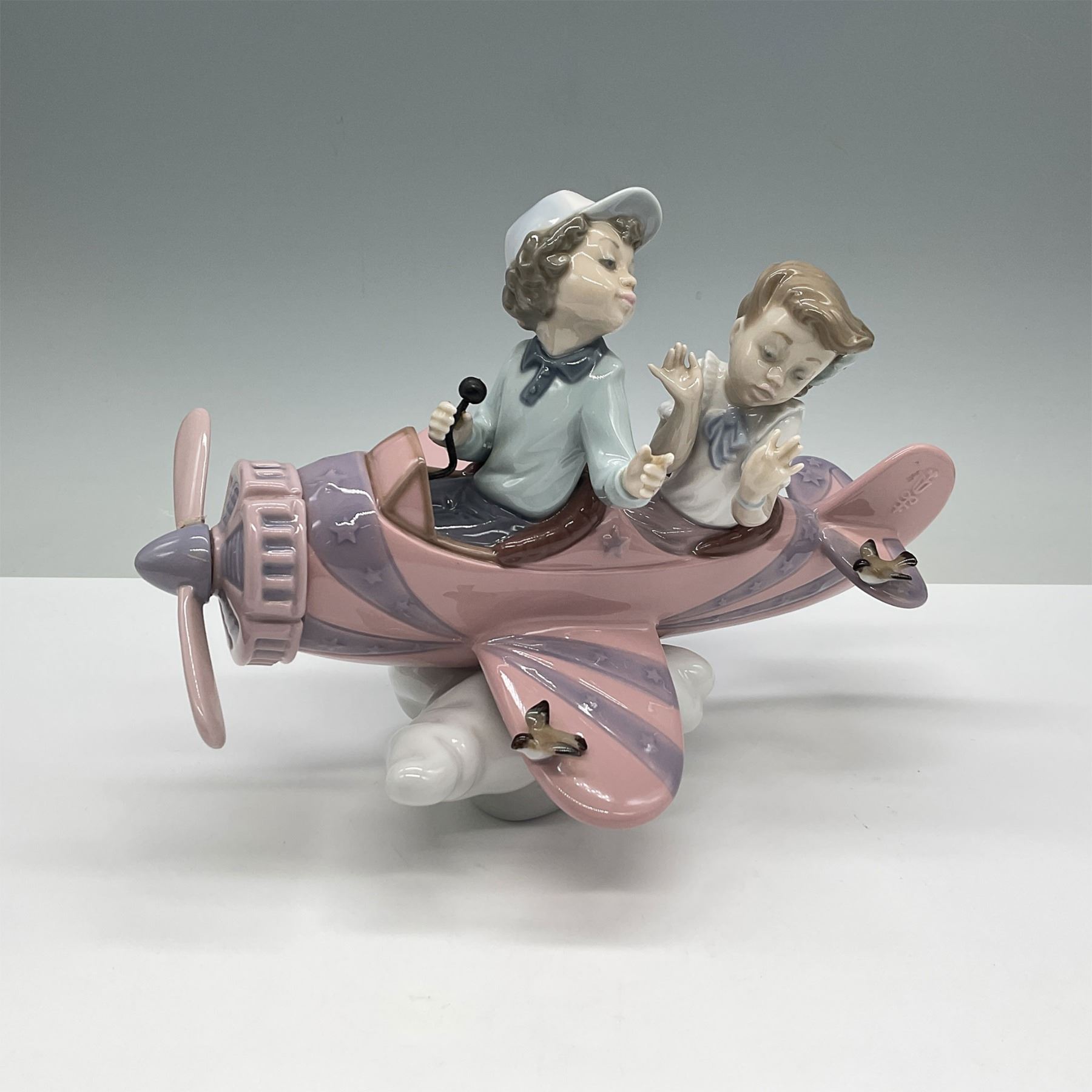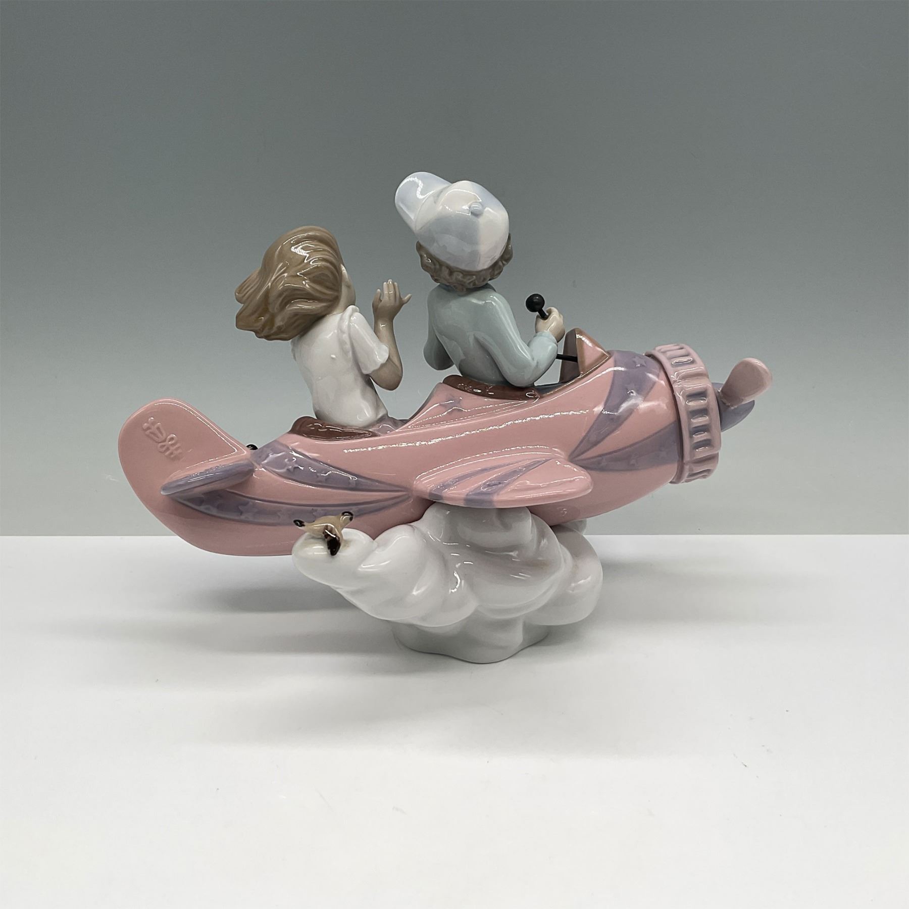 This delightful Lladro porcelain figurine, titled Don't Look Down (model number 01005698), features two children flying a whimsical pink airplane through the clouds. The design captures a playful moment with charming details, pastel tones, and flowing artistry. Crafted in Spain, this hand-painted figurine showcases Lladro signature attention to detail and quality craftsmanship. The underside bears the Lladro hallmark.