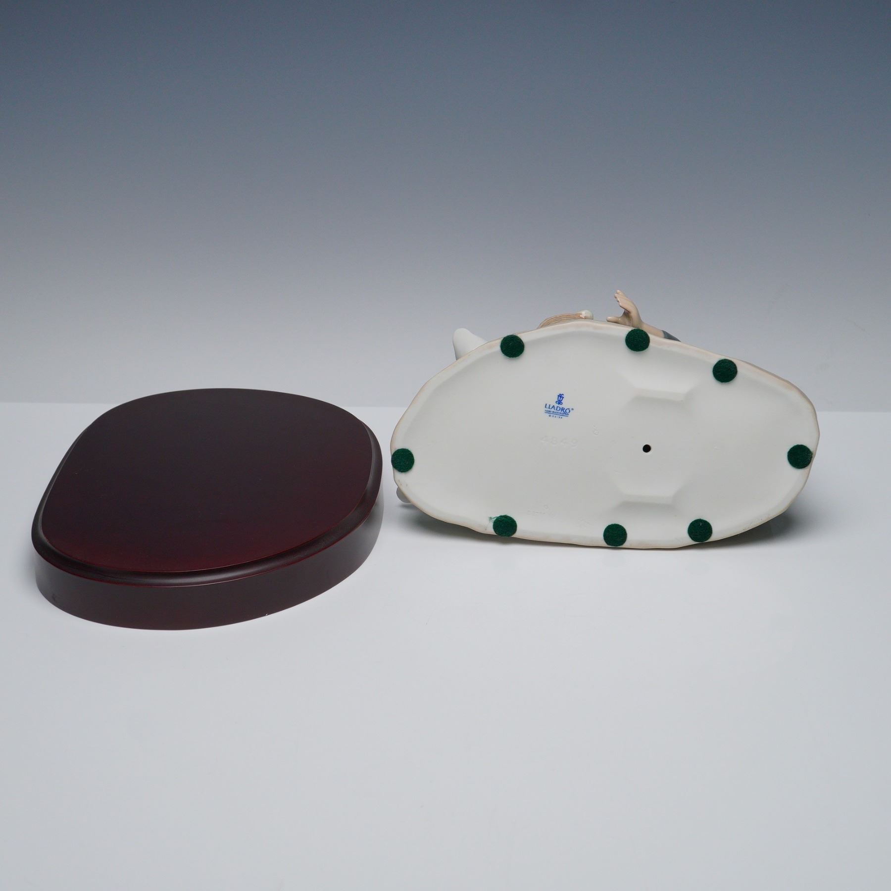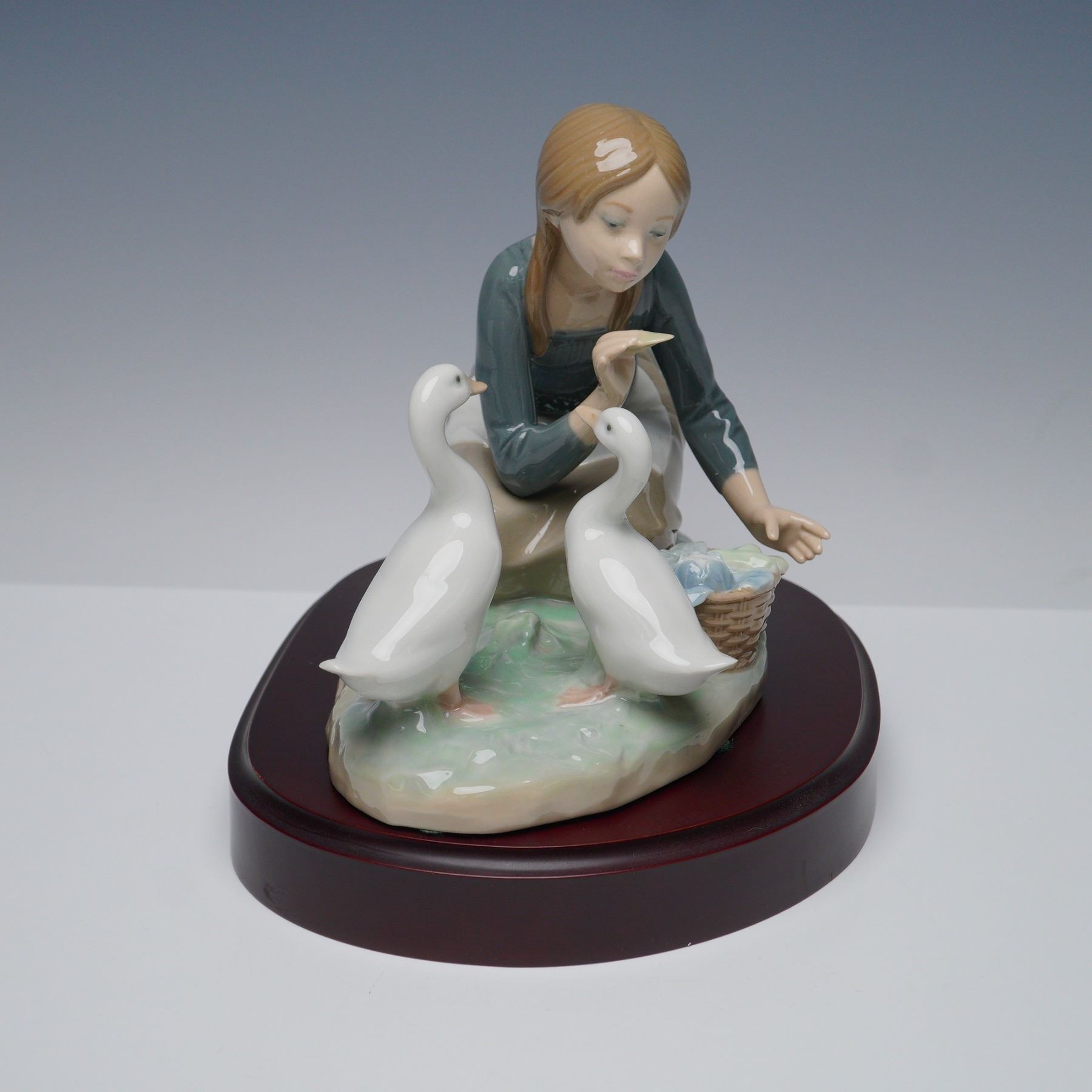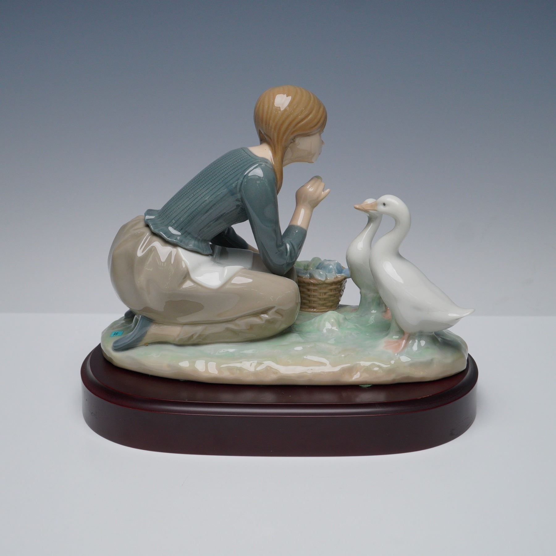 Charming Lladro porcelain figurine, model 1004849, titled Feeding the Ducks, depicting a young girl in a long skirt kneeling to offer food to two standing ducks beside a woven basket. Finished in Lladro's signature soft pastel glaze with delicate hand-painted details. Comes complete with original dark wood display base. Blue Lladro backstamp visible on the underside. Measures 9"L x 8"H.