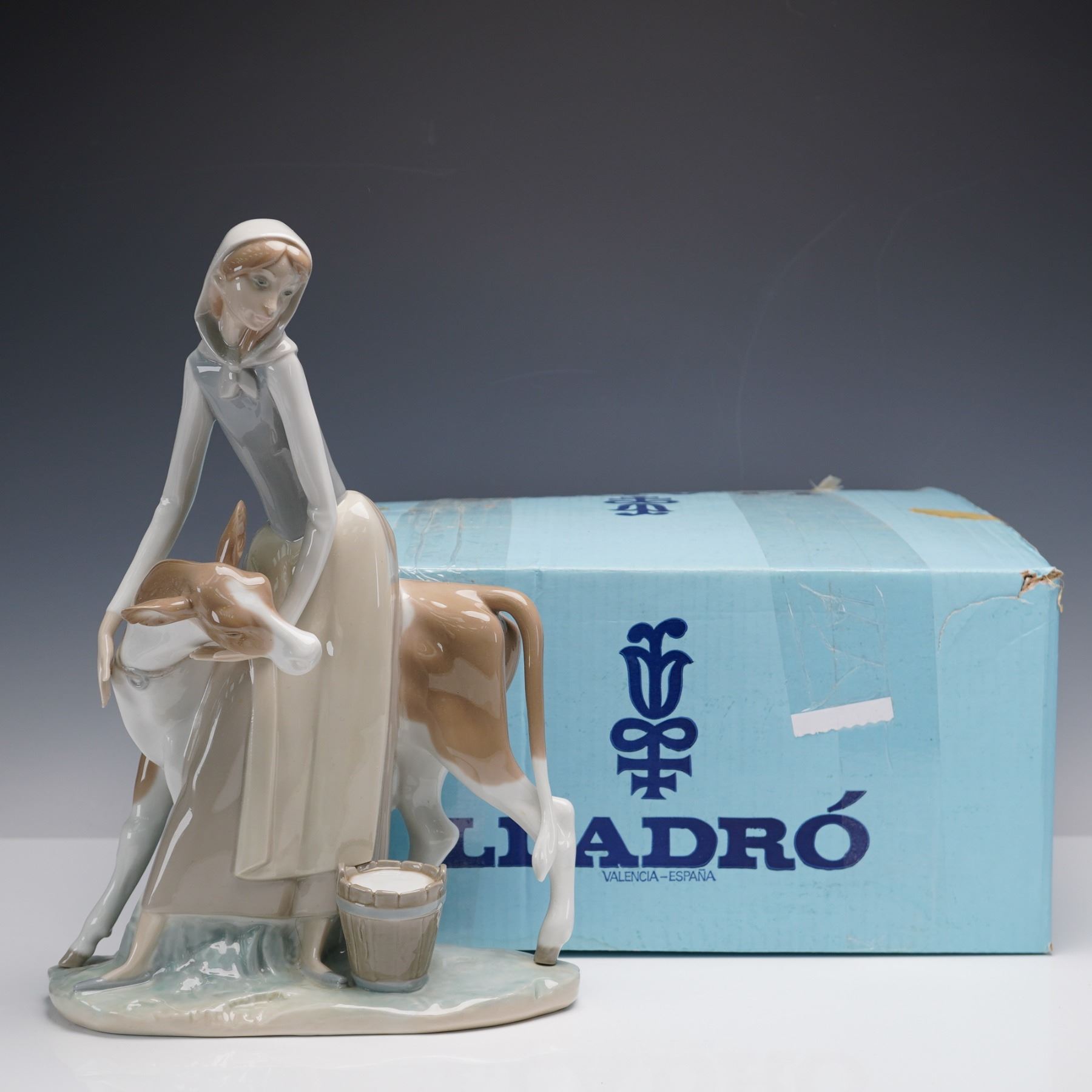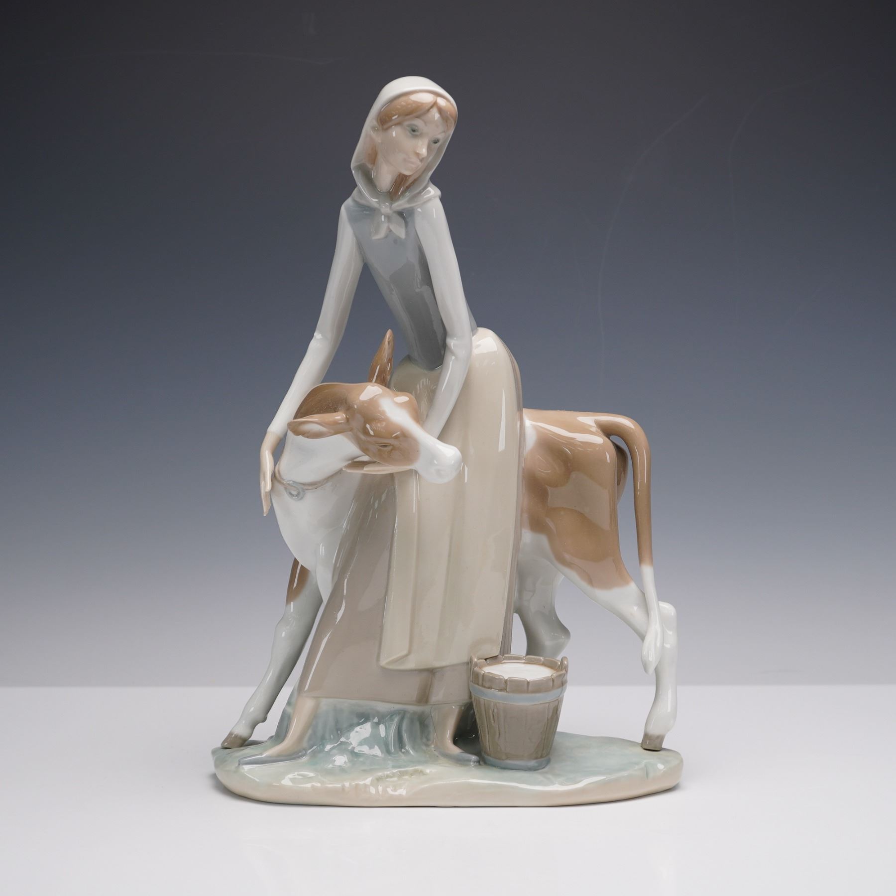Glossy finish porcelain depicting a young woman in pastoral dress standing beside a calf, her hand resting tenderly on the animal's neck with a wooden pail placed at their feet. Lladro backstamp. This item has its original box.