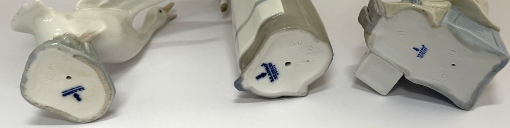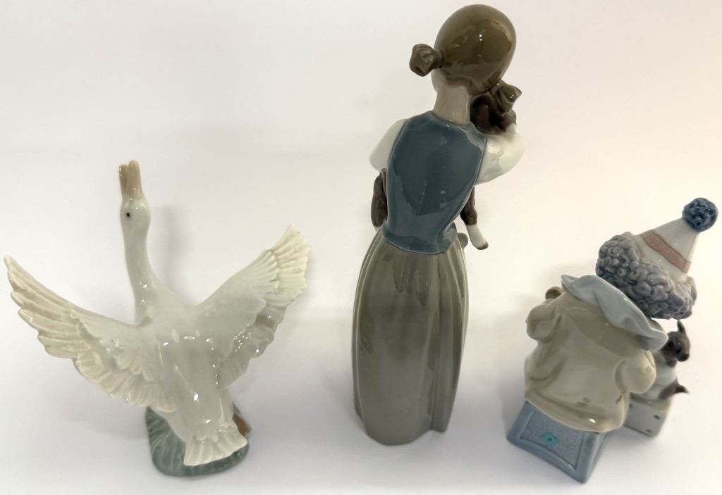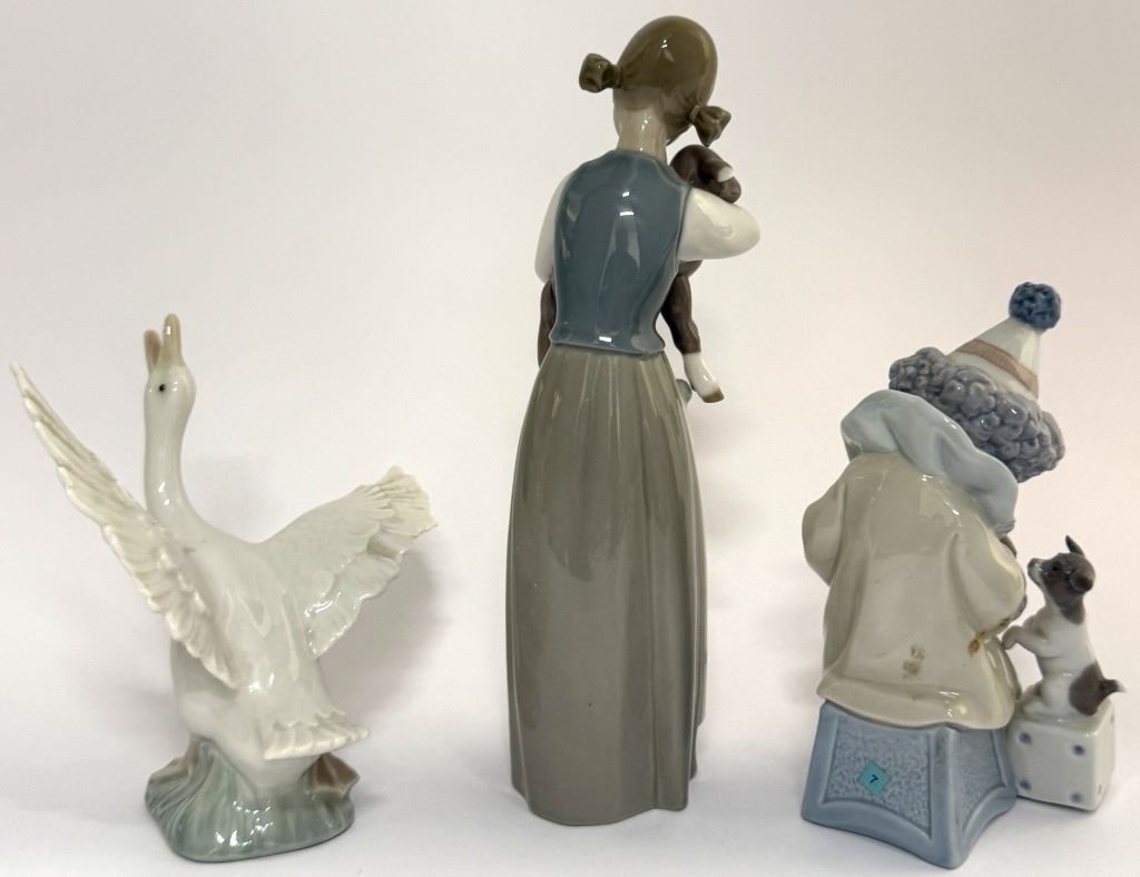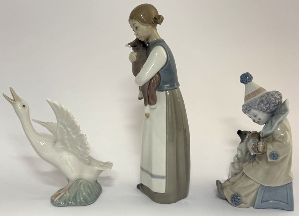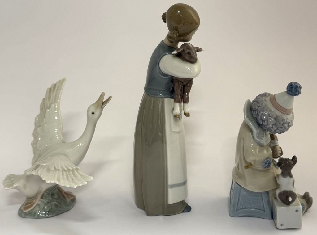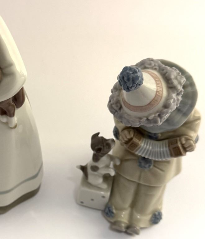Item/Description: Lladro porcelain figurines including "Pierrot Clown with Puppy and Concertina" #5279, "Girl with Lamb" #1010, "Duck Running" #1263, and "Nature Boy" #1505, featuring a bunny boy sleeping in flowers.