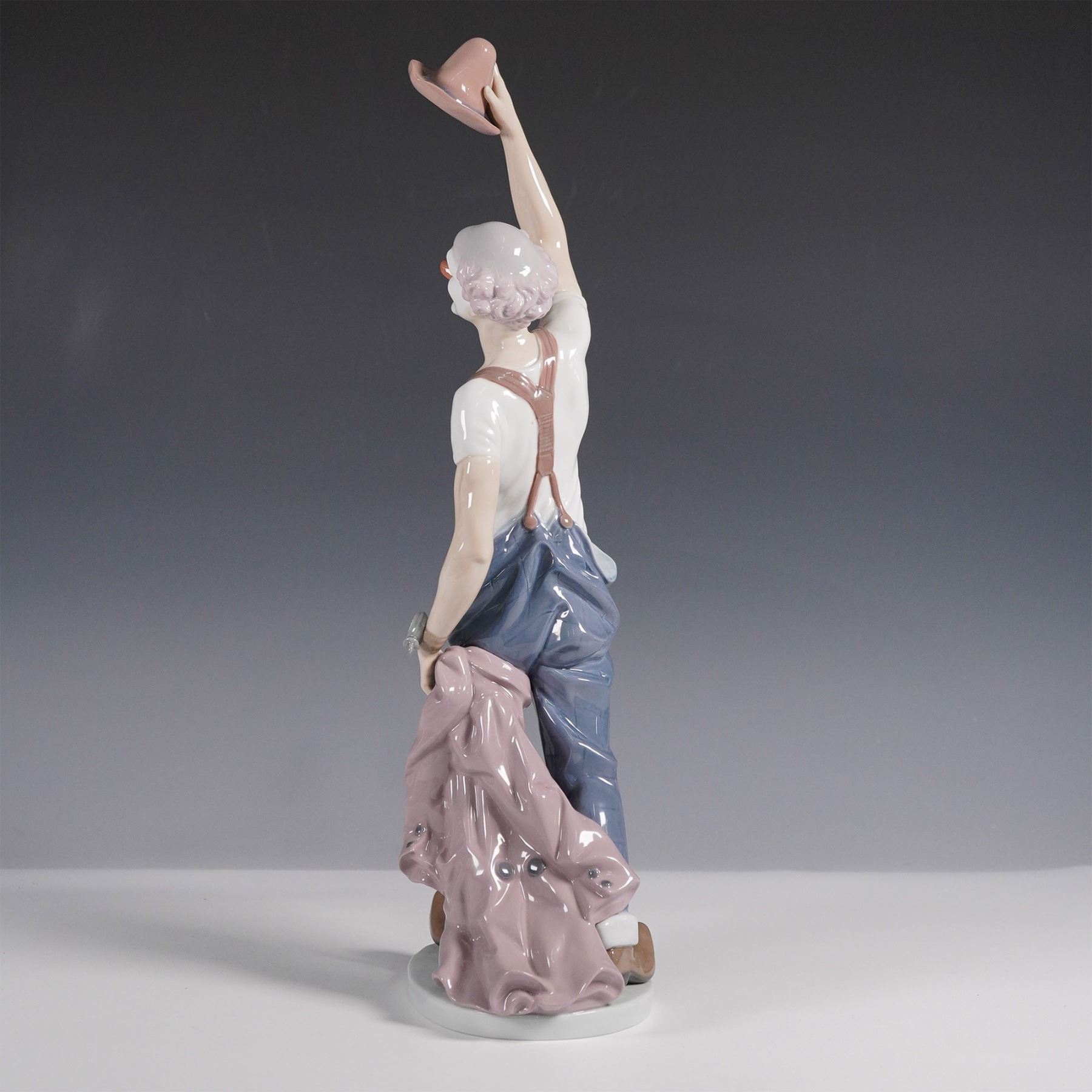 Presenting the whimsical Lladro porcelain figurine titled "Hats Off To Fun" (model number 1005765), masterfully sculpted by Salvador Furio. This enchanting piece captures the joyful essence of a clown exuberantly raising his hat high above his head, inviting viewers into a world of playful celebration. Rendered in Lladro's signature glossy finish, the figurine showcases meticulous attention to detail, from the expressive facial features to the intricate folds of the clown's attire. The base bears the Lladro backstamp.