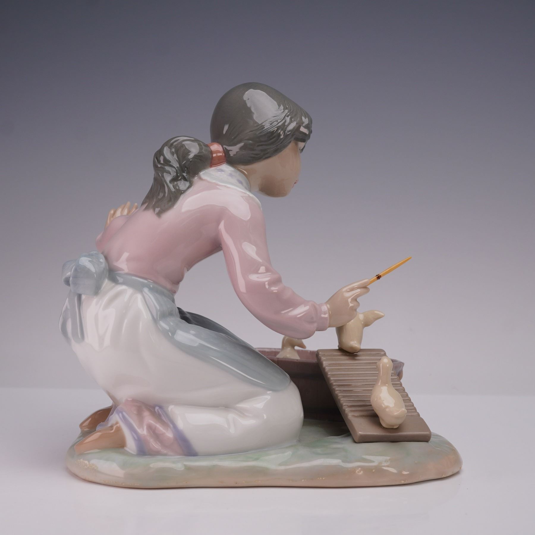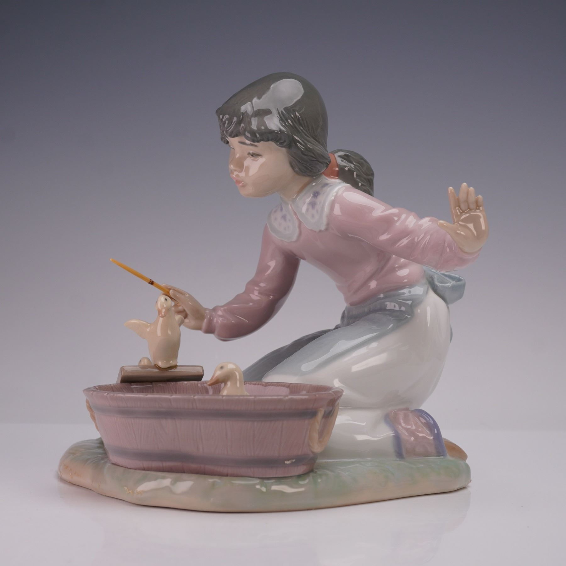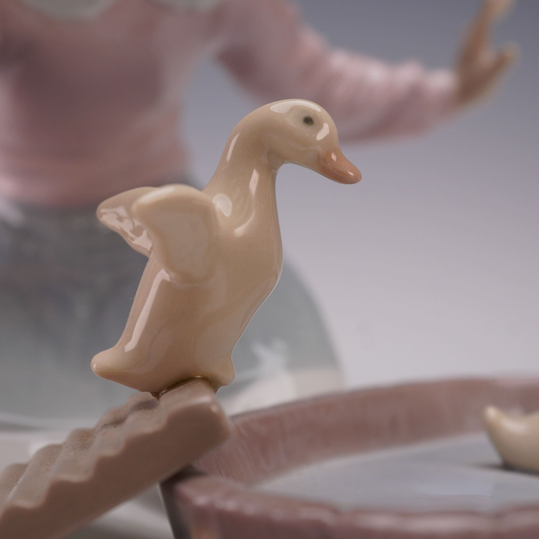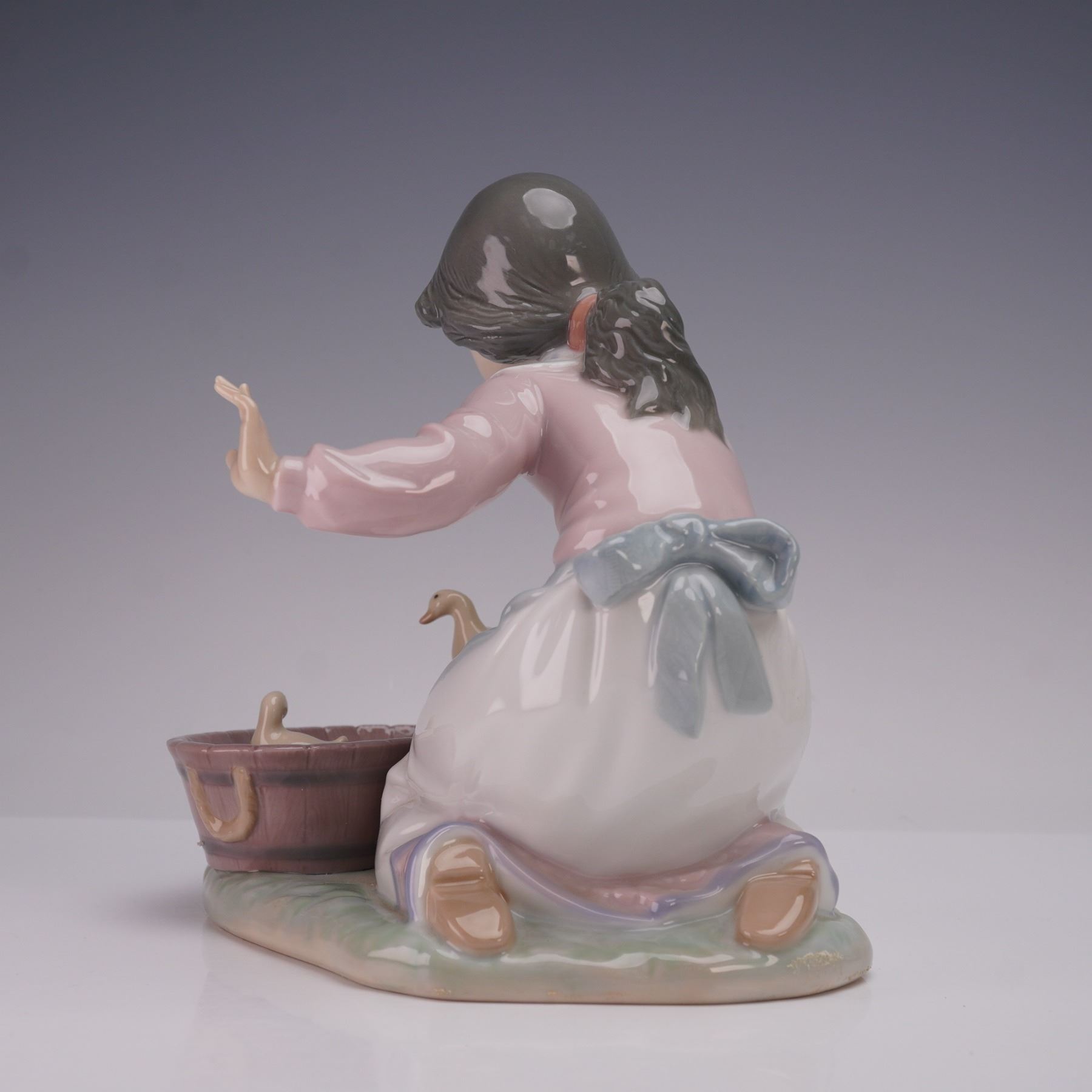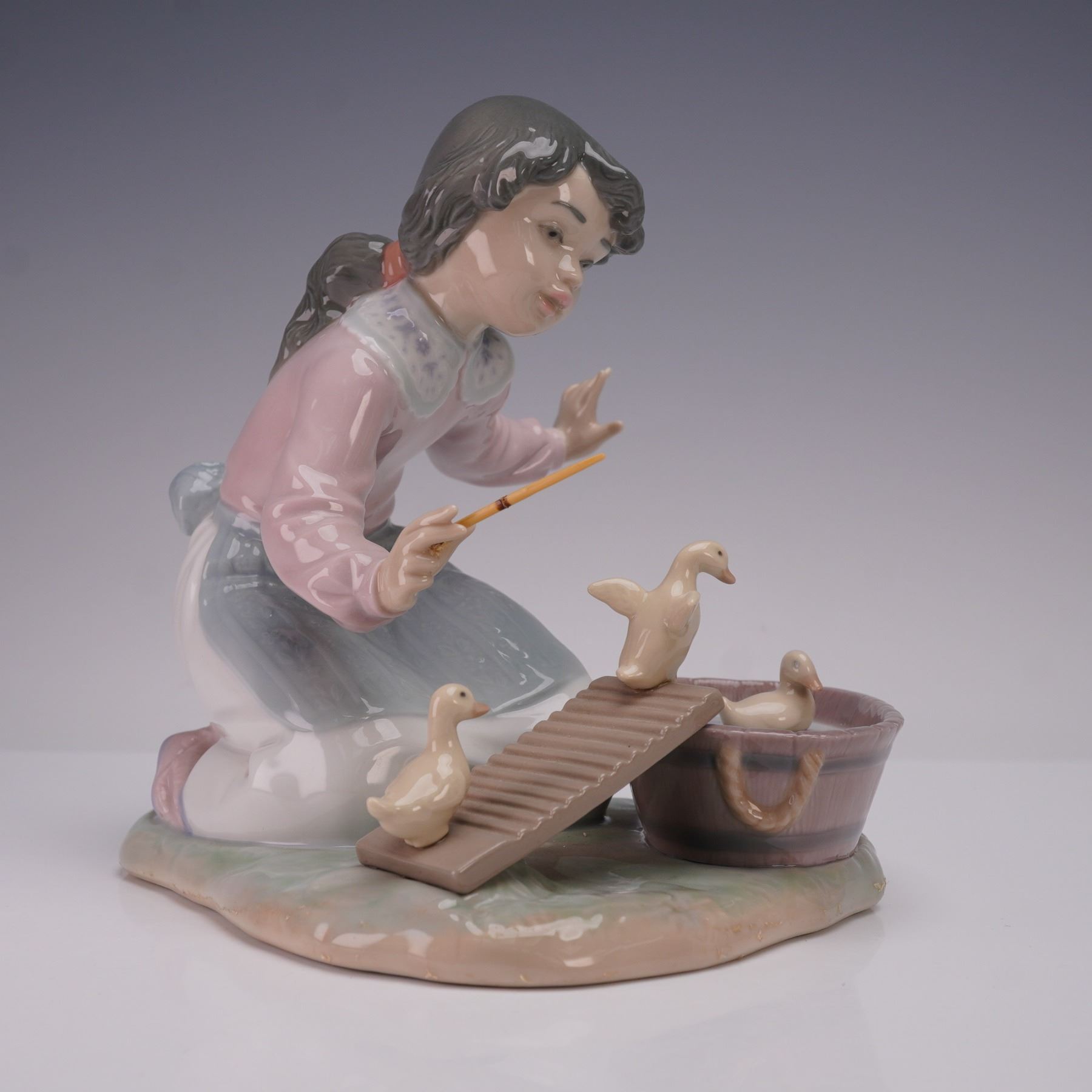 Depicting a young girl kneeling beside a wooden tub while gently guiding three ducklings up a small ramp. The piece is finished in the traditional Lladro glazed pastel palette, featuring shades of pink, blue, cream, and soft earth tones. The underside bears the blue Lladro backstamp.