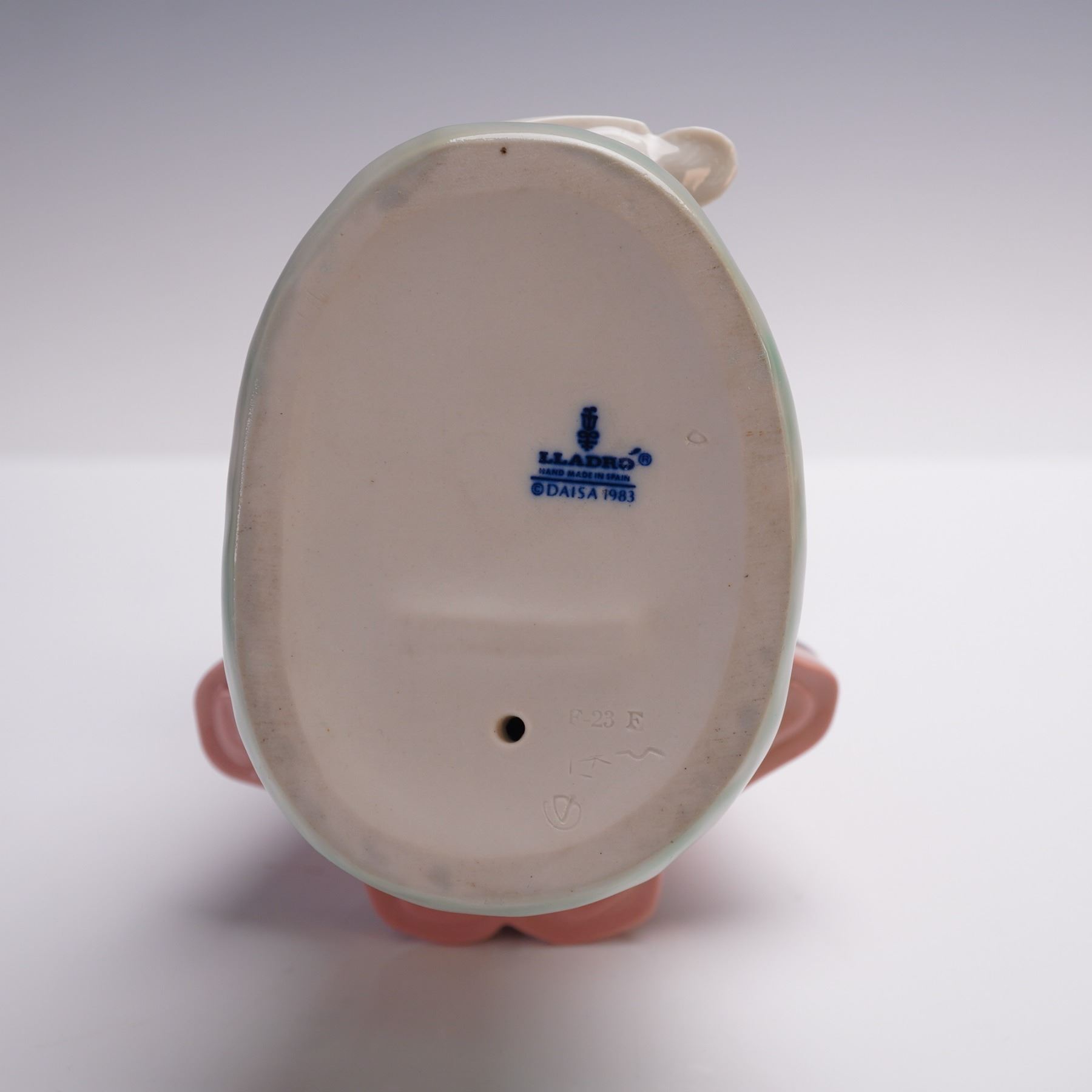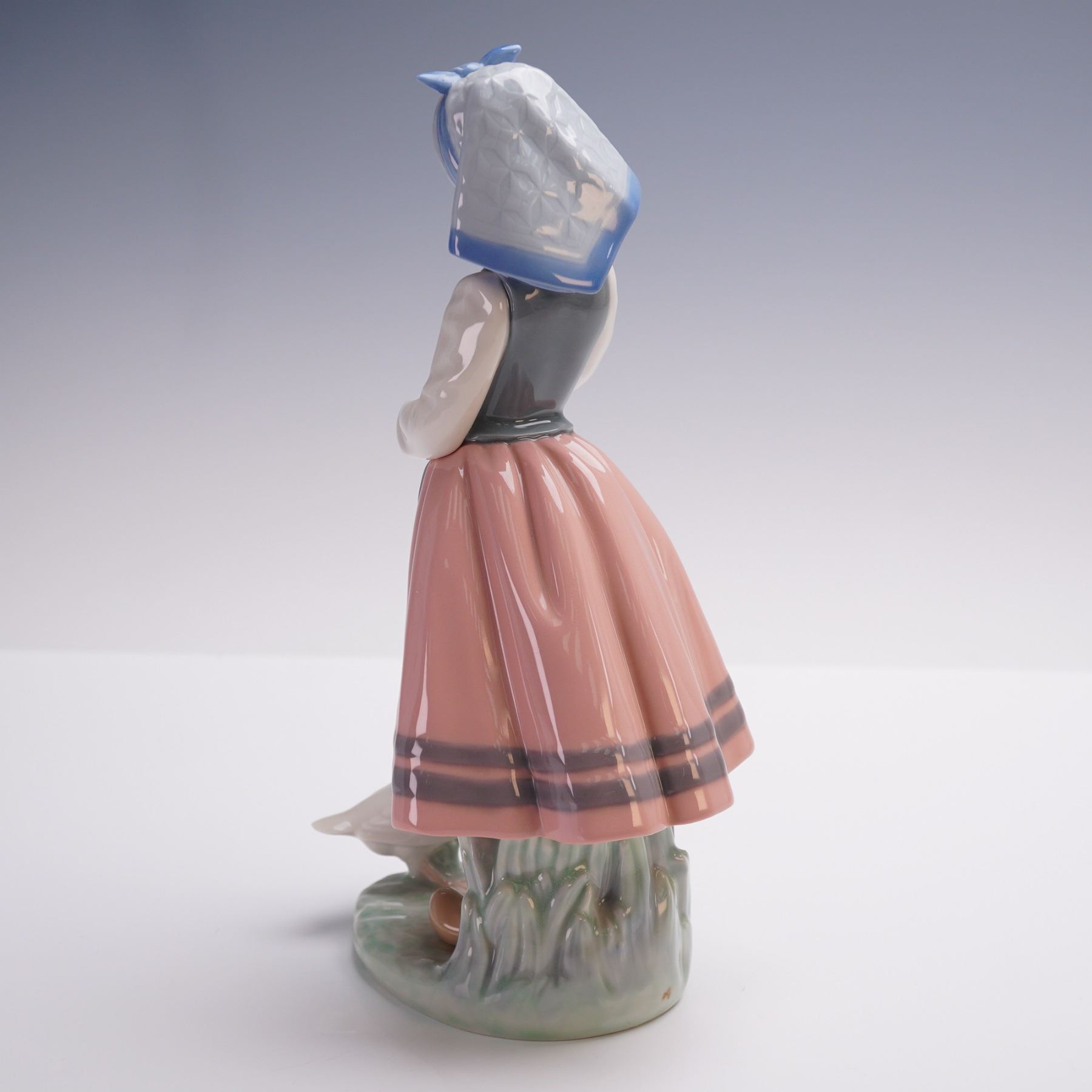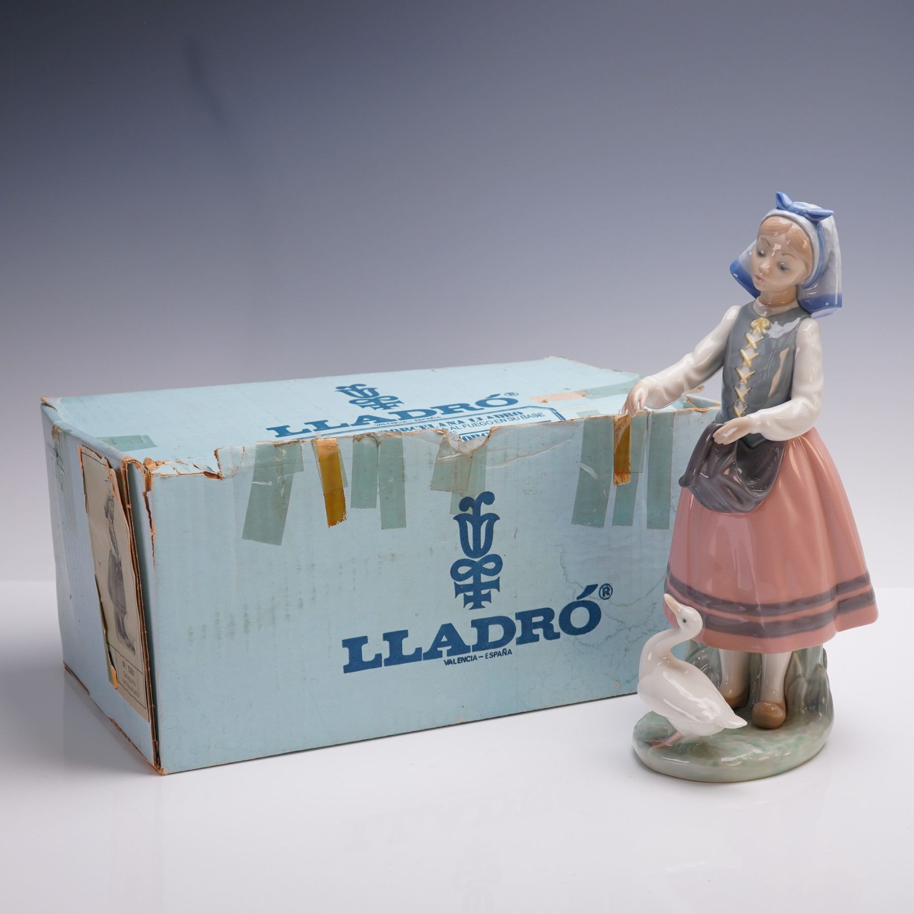 Lladro porcelain figurine titled Josepha Feeding Duck, item number 01005201, sculpted by Francisco Catala. This charming piece features a young girl in traditional dress with a blue headscarf offering feed to a duck at her feet. Finished in Lladro's signature soft pastel glaze with hand-painted detail. Includes original Lladro box. Figurine measures 10.5"H, box measures 7.5"L x 13"H.
