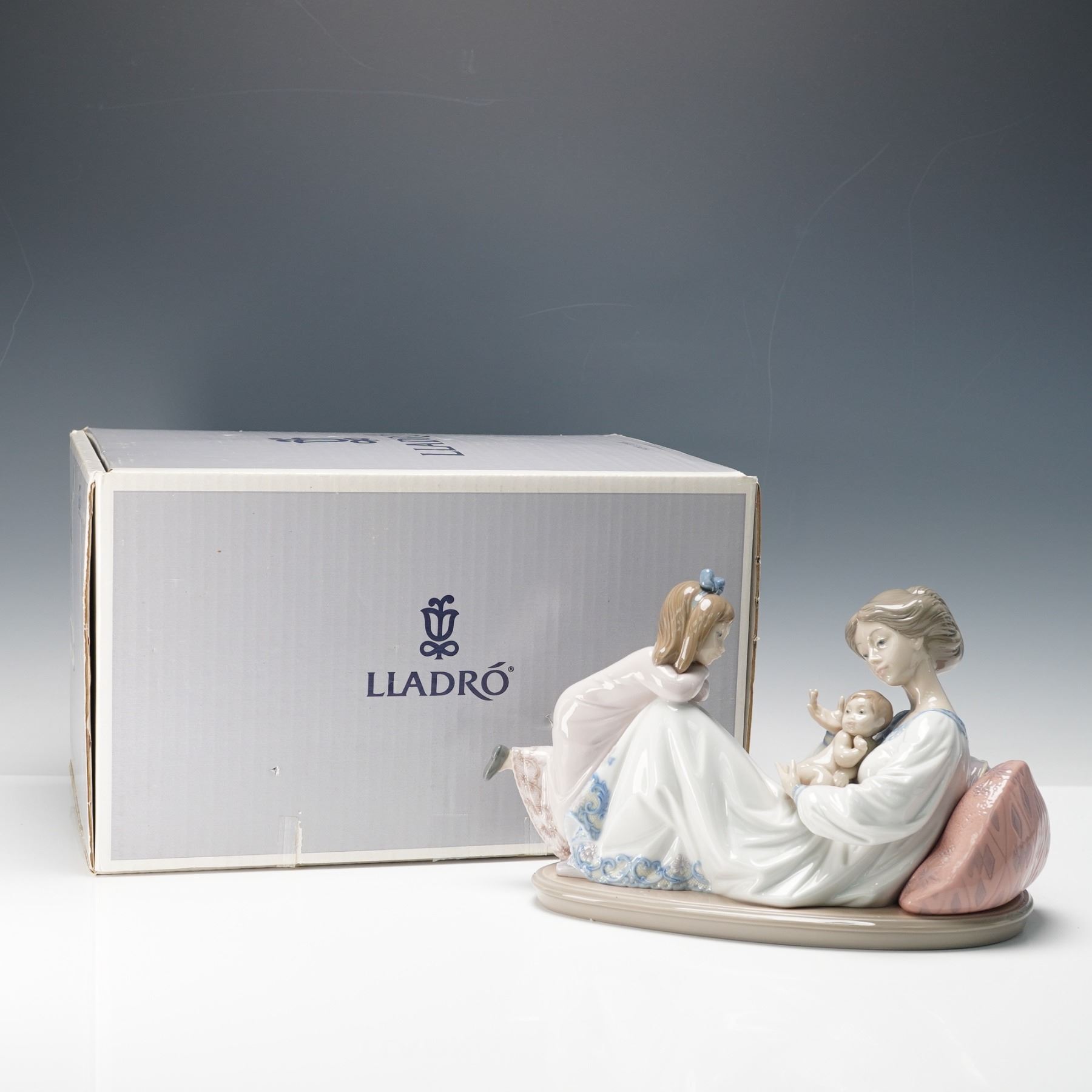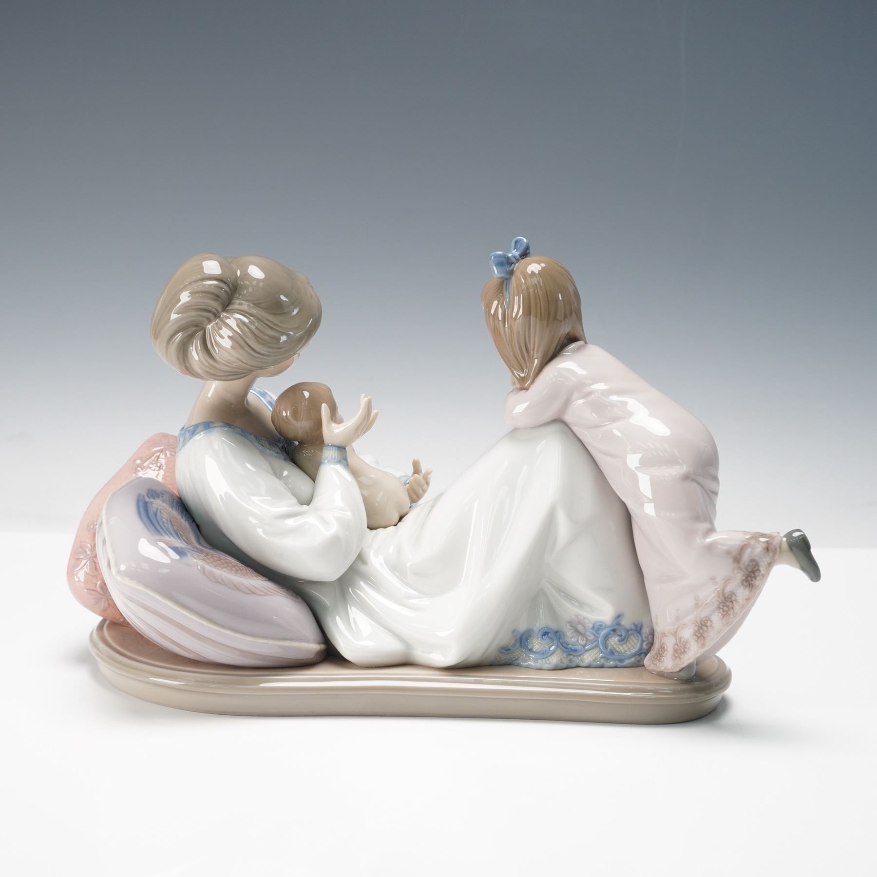 Glossy porcelain figurine titled Latest Addition, sculpted by Jose Puche and issued in 1989, depicting a mother with an infant and young child. Soft pastel tones and delicate detail highlight classic Lladro craftsmanship. Retired in 2007. Lladro backstamp. Includes original box 13.75"H.