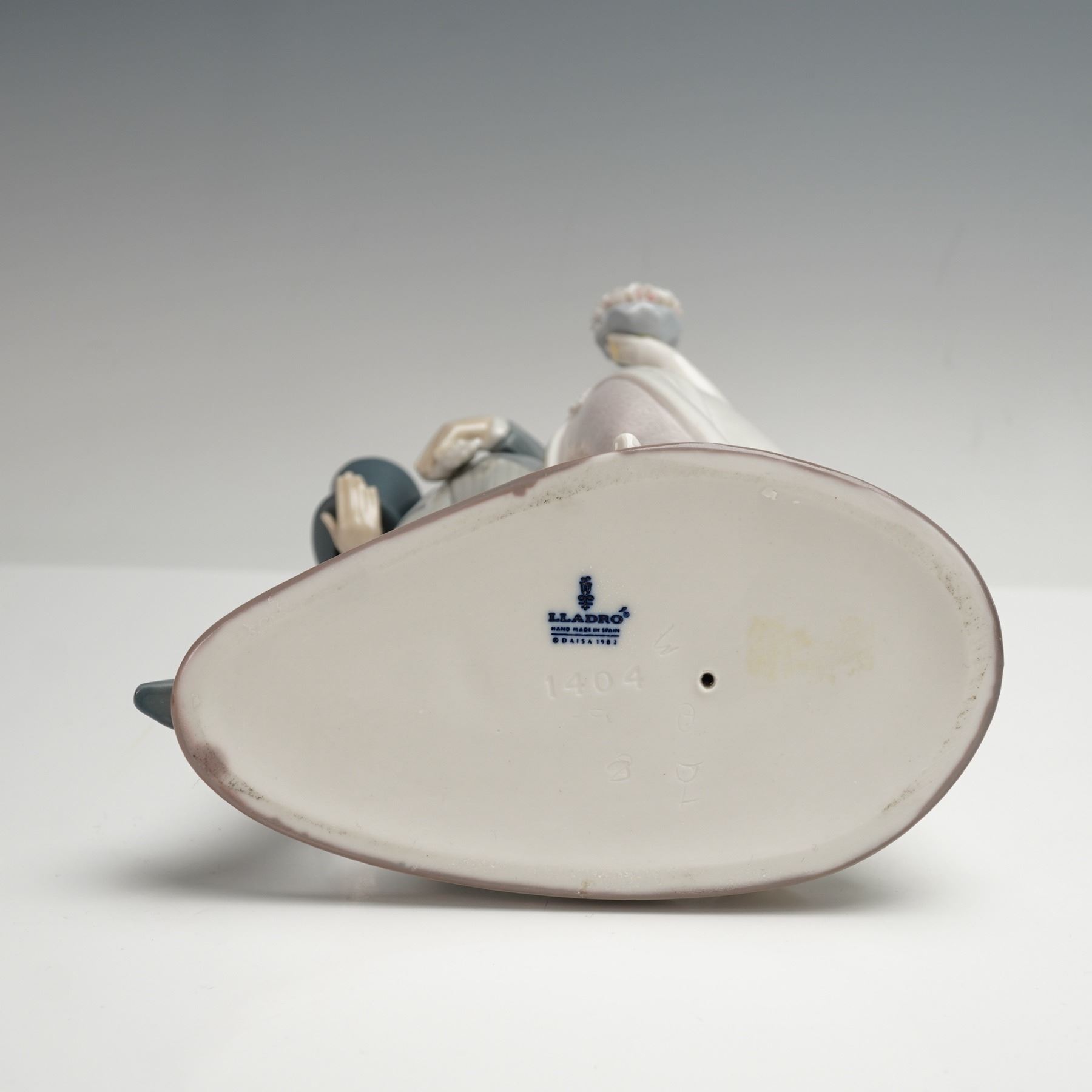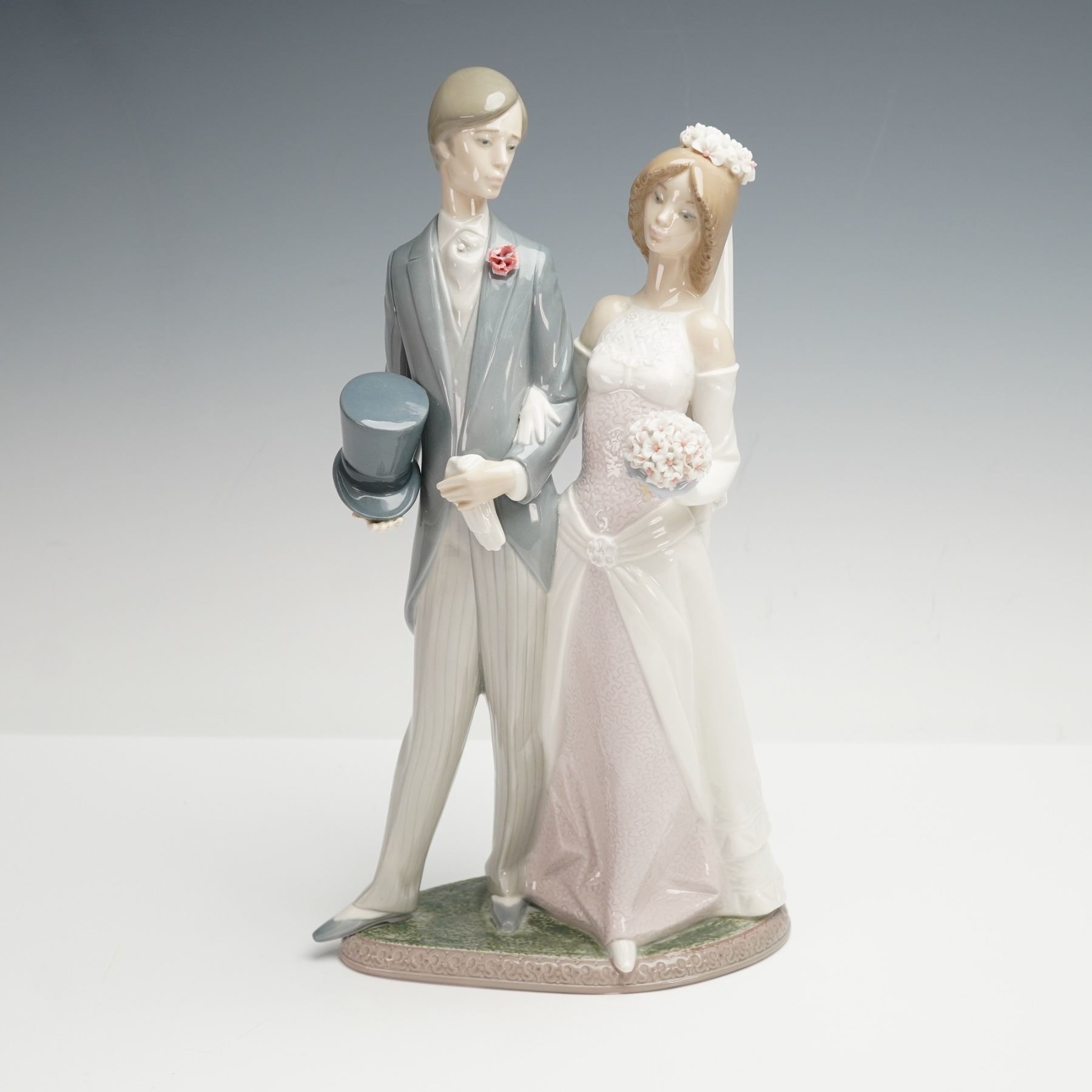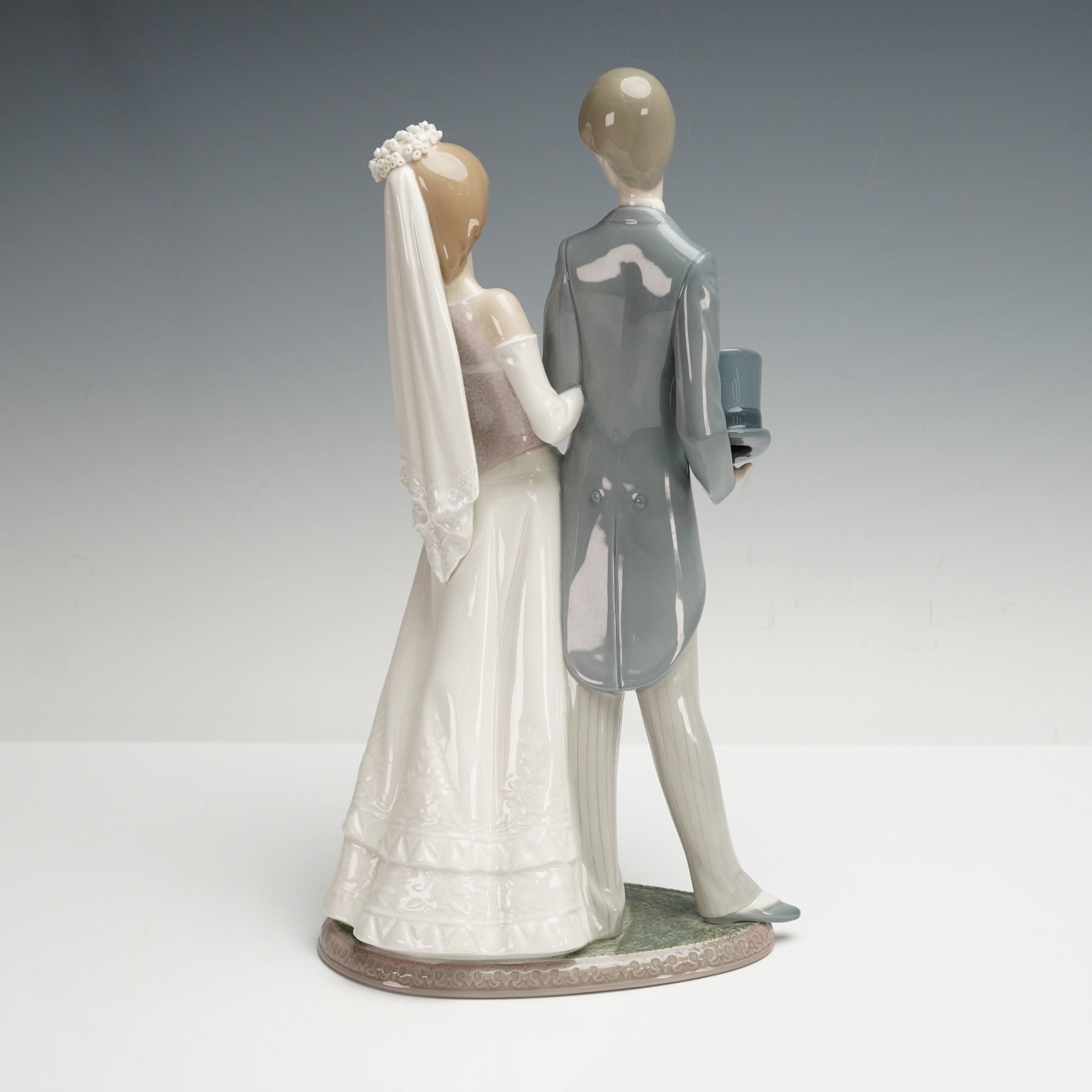 A porcelain figurine showing a bride and groom strolling together on their wedding day. The groom stands in a long pale blue coat with striped trousers, carrying a top hat in one hand and holding the brides arm with the other. Lladro backstamp.
