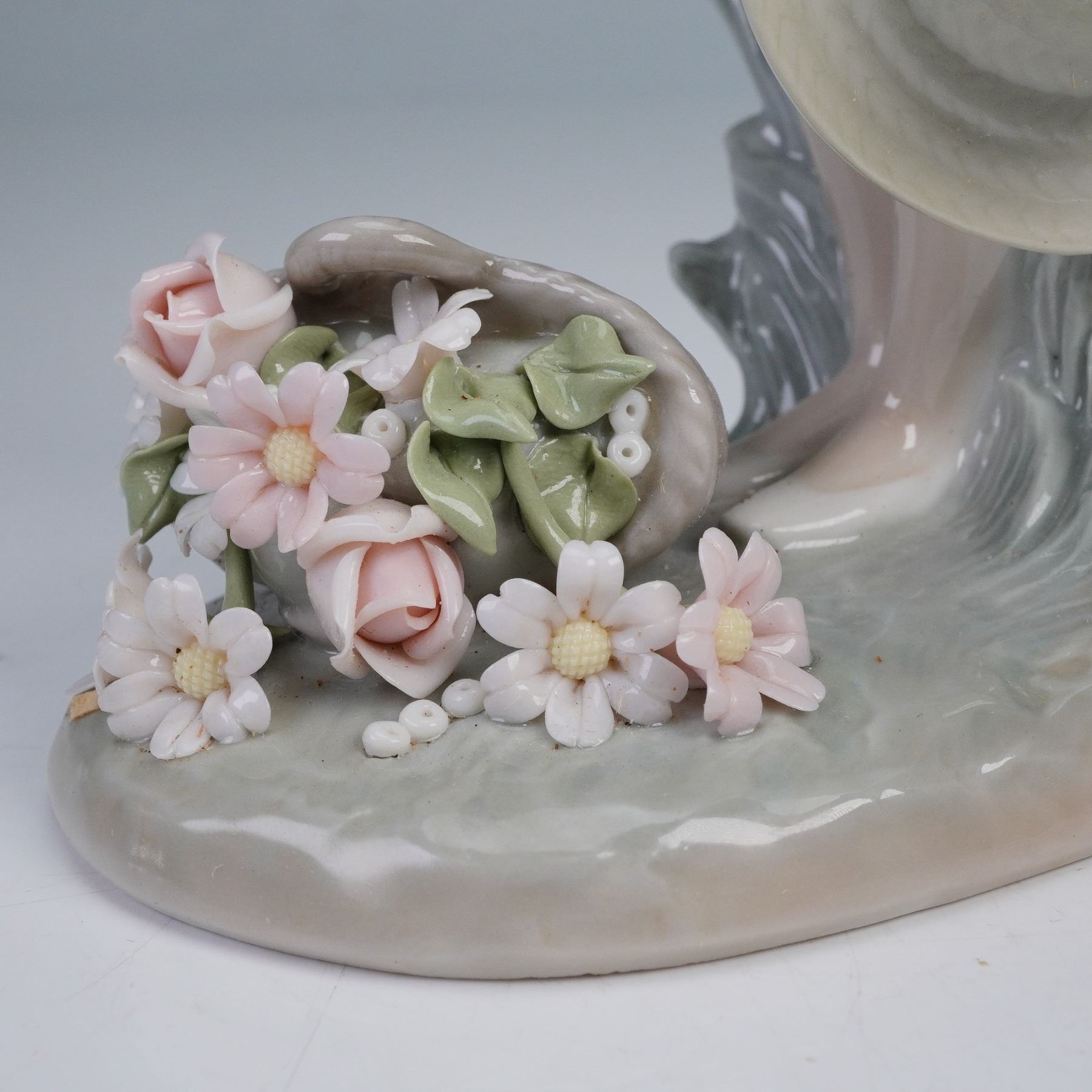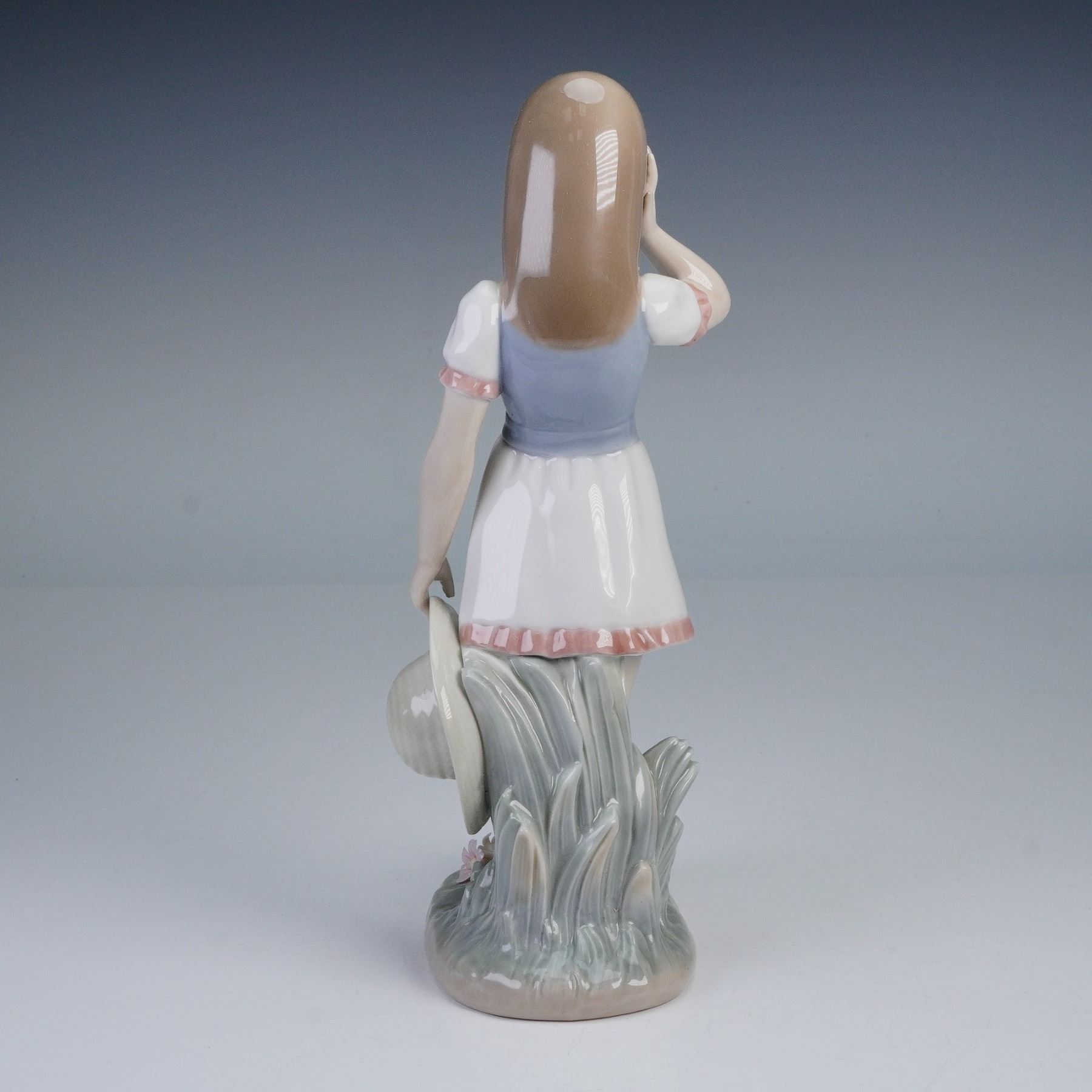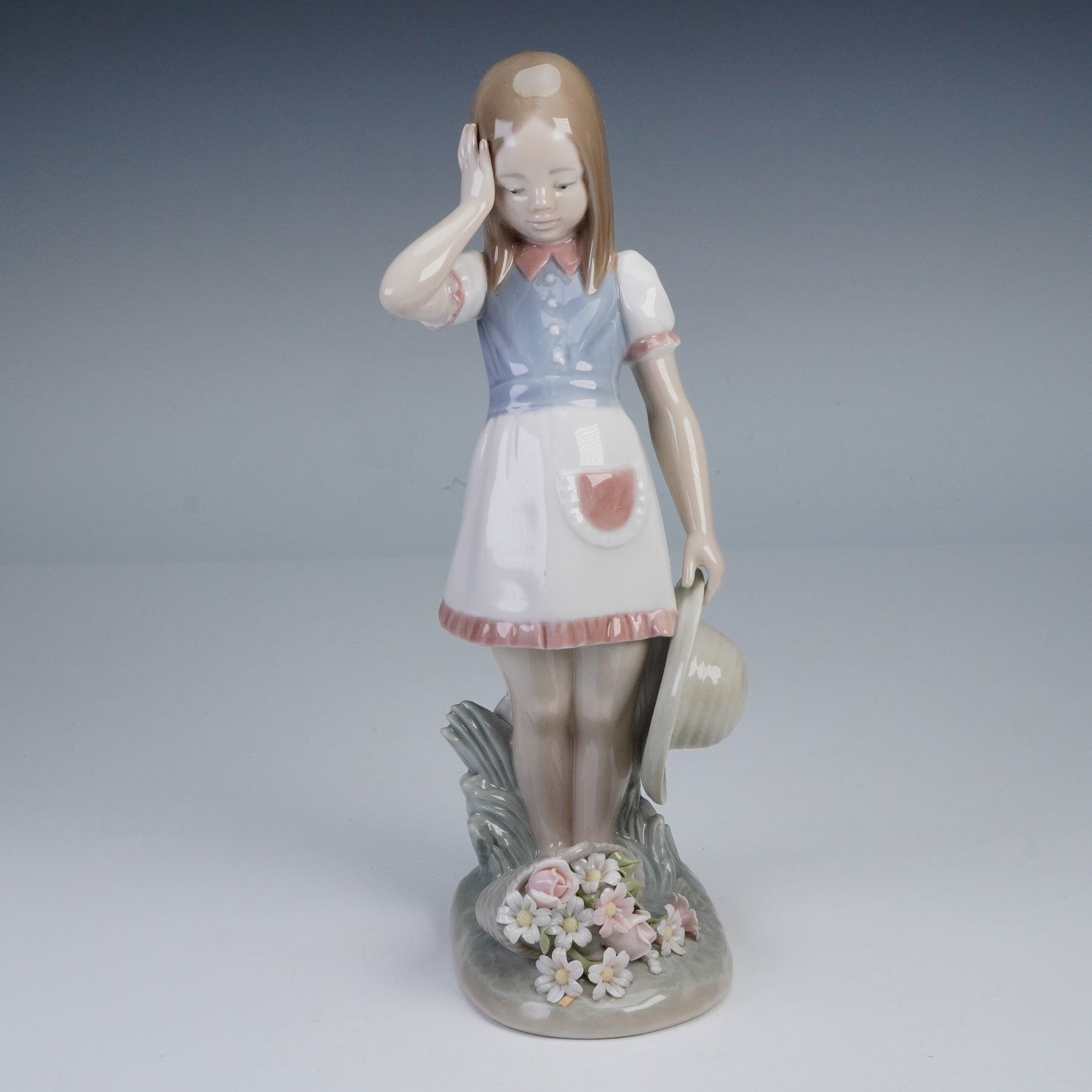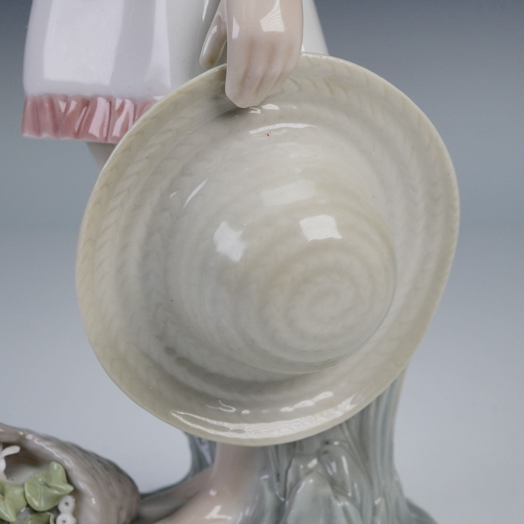 Lladro porcelain figurine titled My Goodness, number 1001285, depicting a young girl in a dress with apron, holding her hat in one hand while standing beside a base adorned with flowers. Finished in soft pastel tones with high glaze. Marked with the Lladro backstamp on the base. Comes with original box.