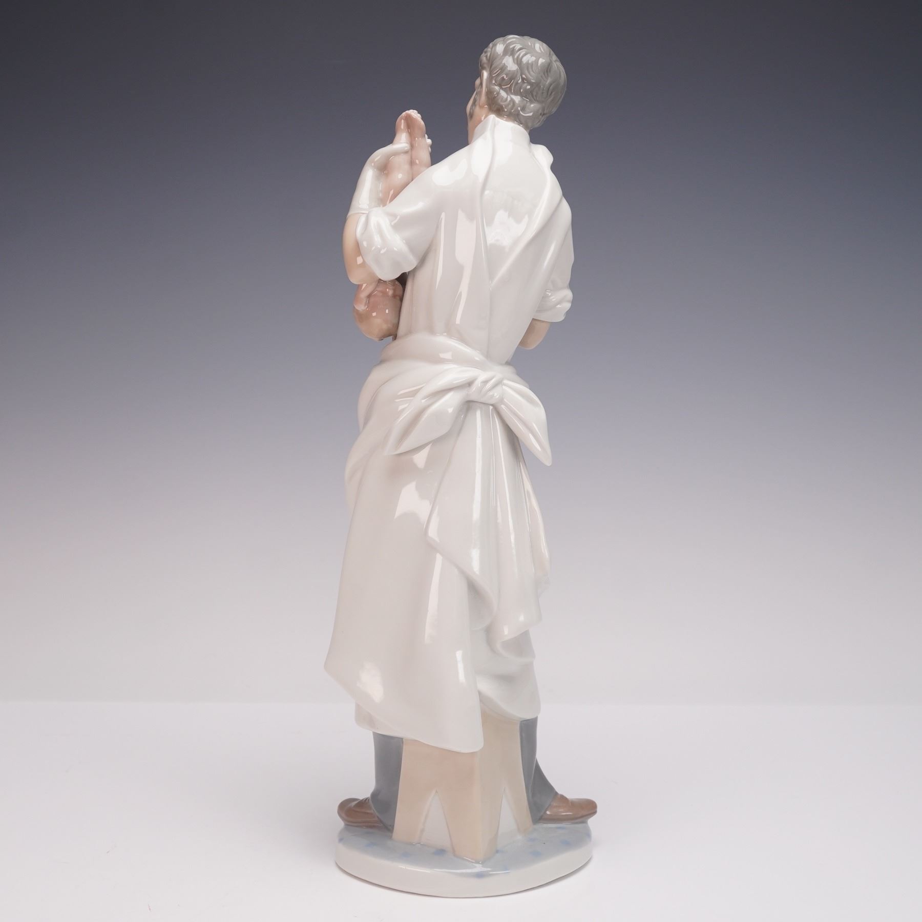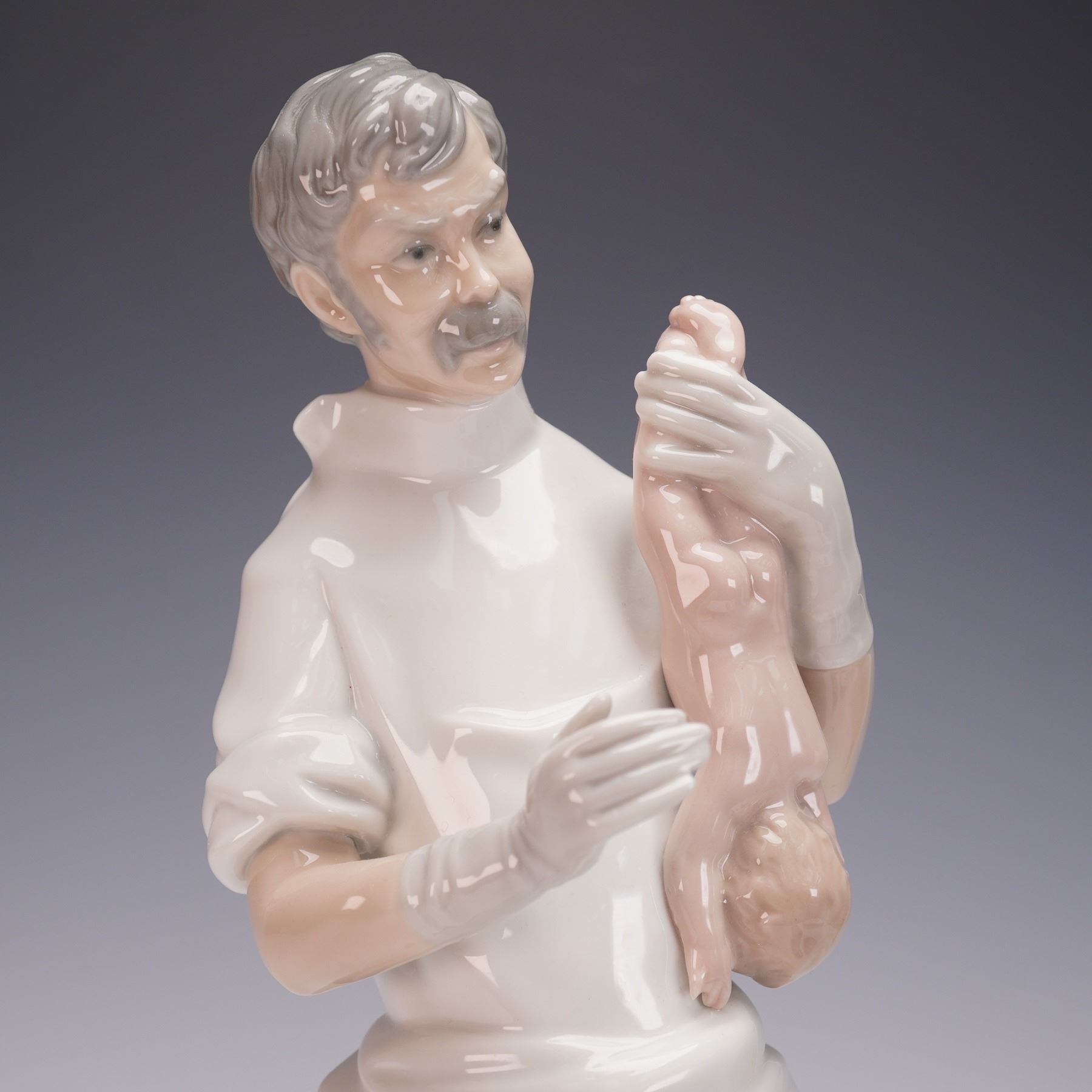 A fine Lladro porcelain figurine titled Obstetrician, model number 1004763, depicting a doctor in surgical attire holding a newborn infant. Finished in Lladro's signature soft pastel glaze with realistic detailing to the figures. Marked with Lladro backstamp to the base.