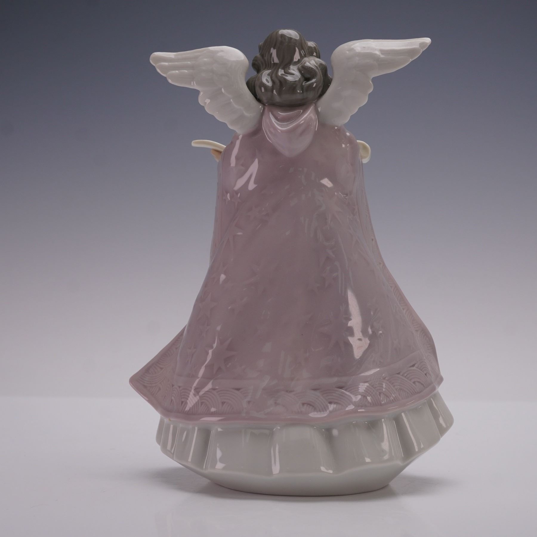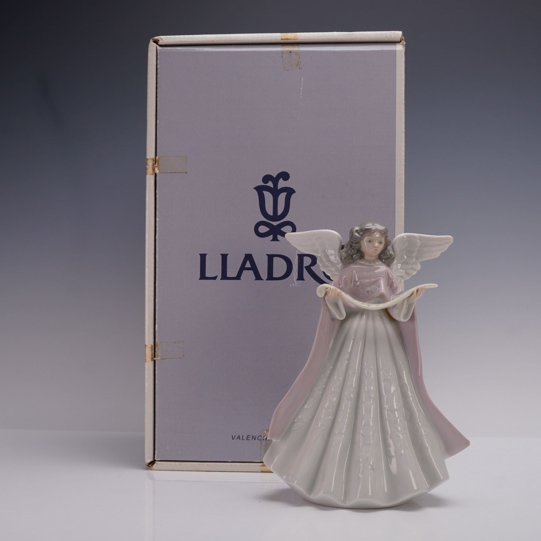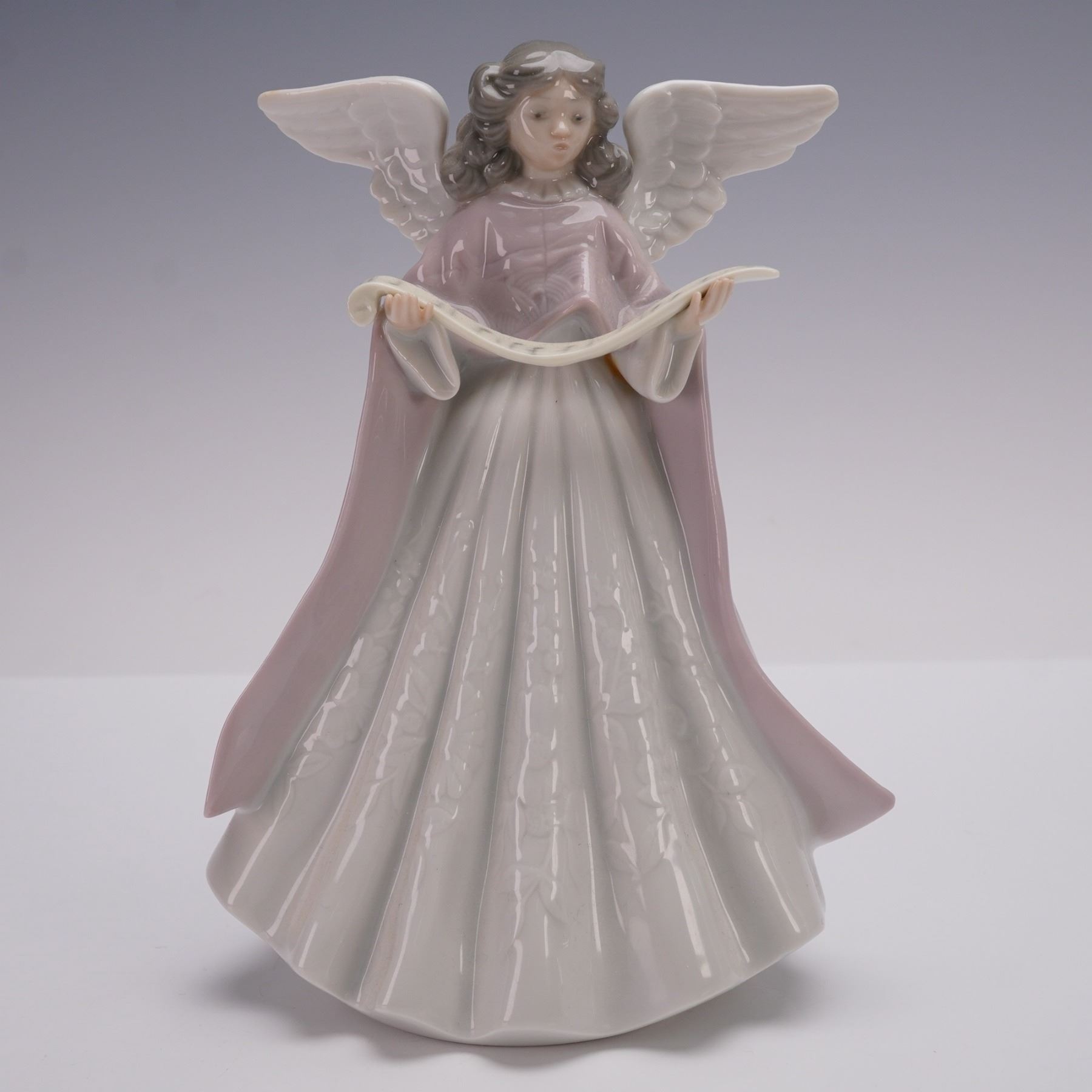 A graceful porcelain angel tree topper by Lladro crafted with soft pastel tones and delicate detail. The angel holds a scroll and wears a flowing gown finished in white and pink glaze with subtle star and floral decoration. This versatile piece may be displayed as a figurine or used as a tree topper. Lladro backstamp. This item has its original box. Box measures: 12.75"L x 7.25"W x 5.75"H.