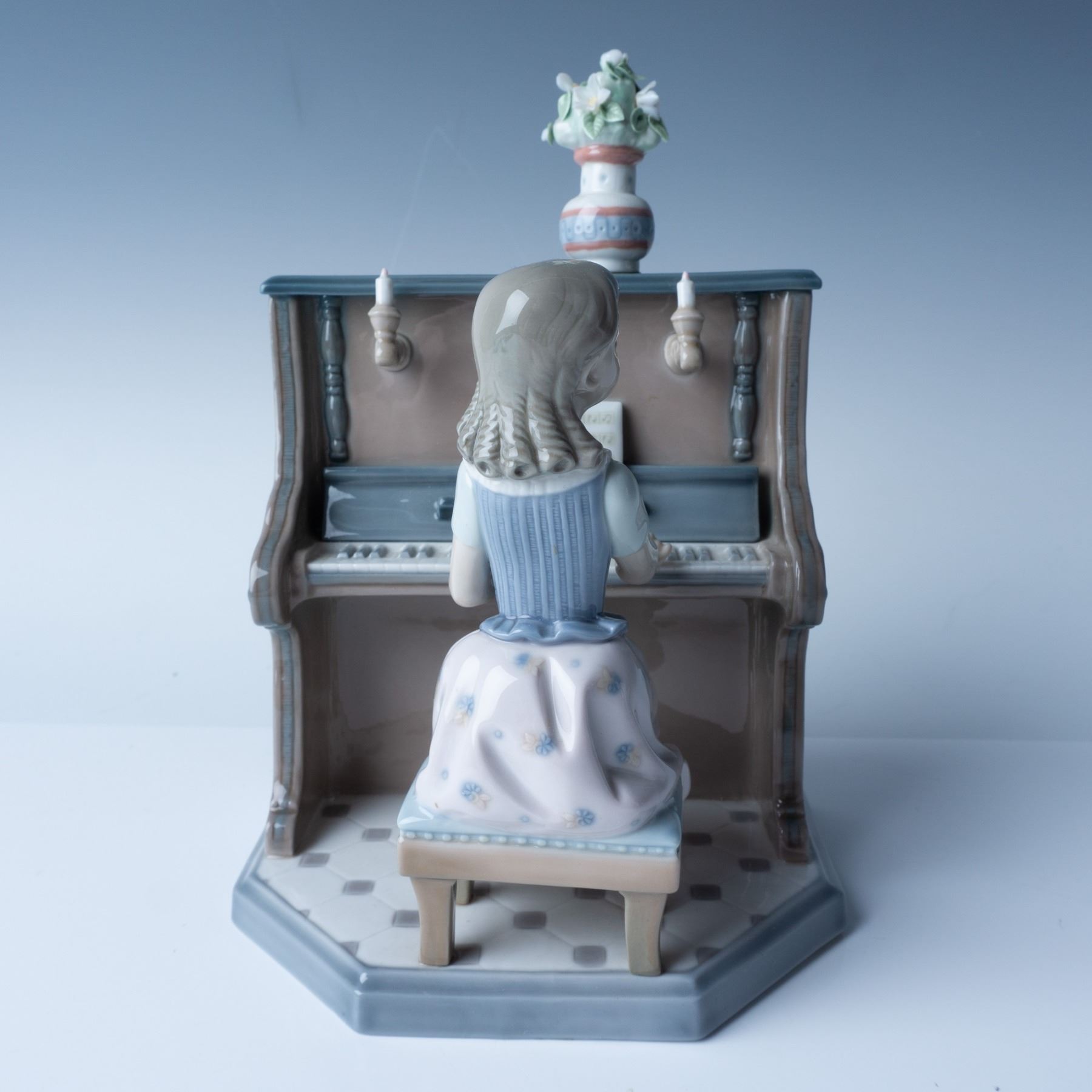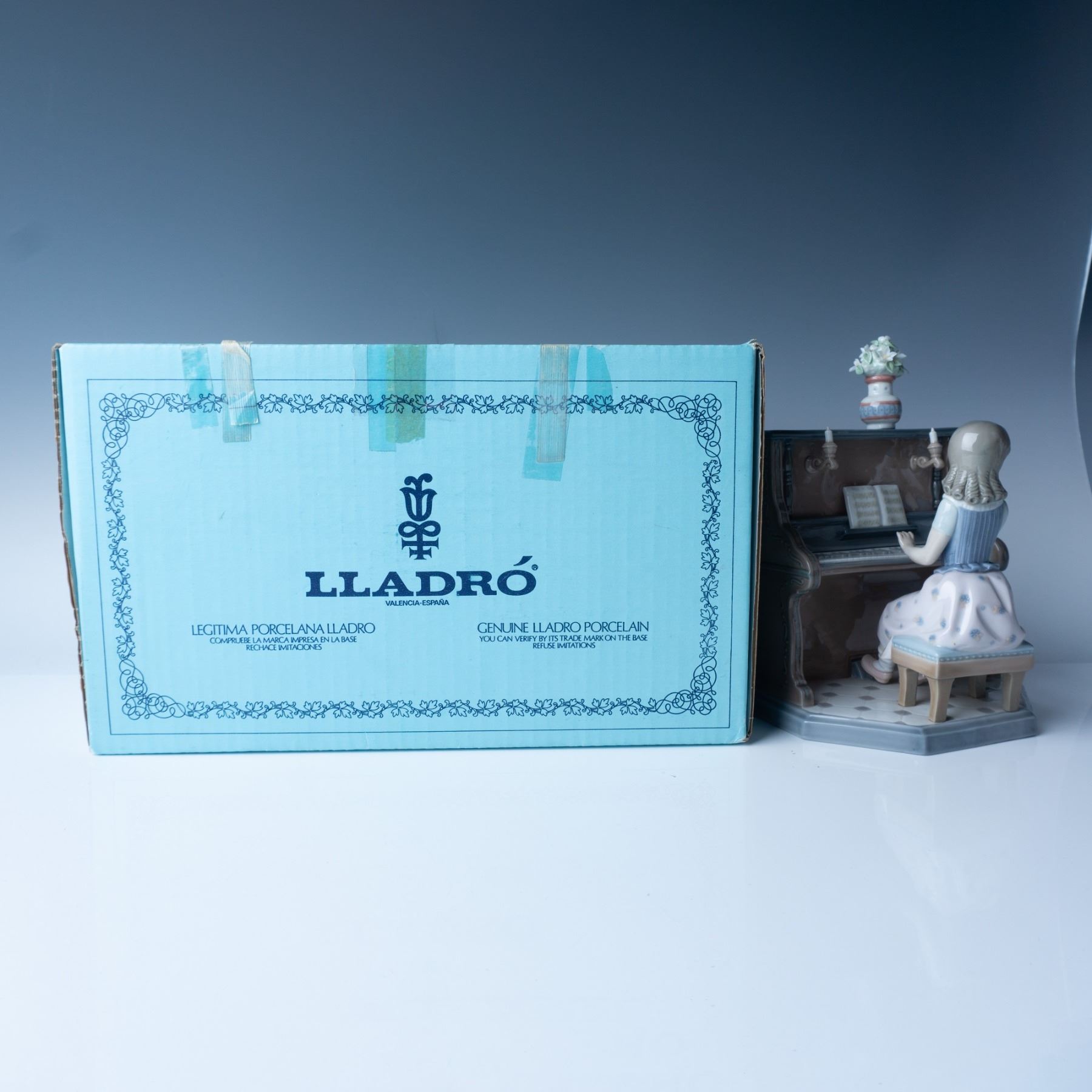 Featuring a young girl playing the piano with intricate detailing, designed by the renowned Spanish brand known for its exceptional craftsmanship. Lladro backstamp. This item has its original box.