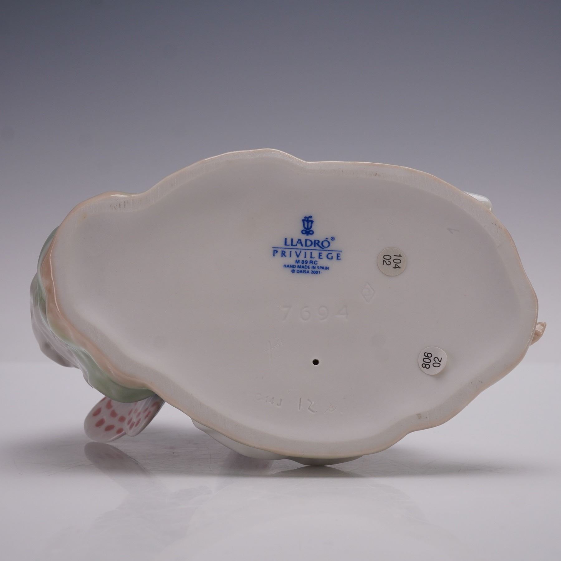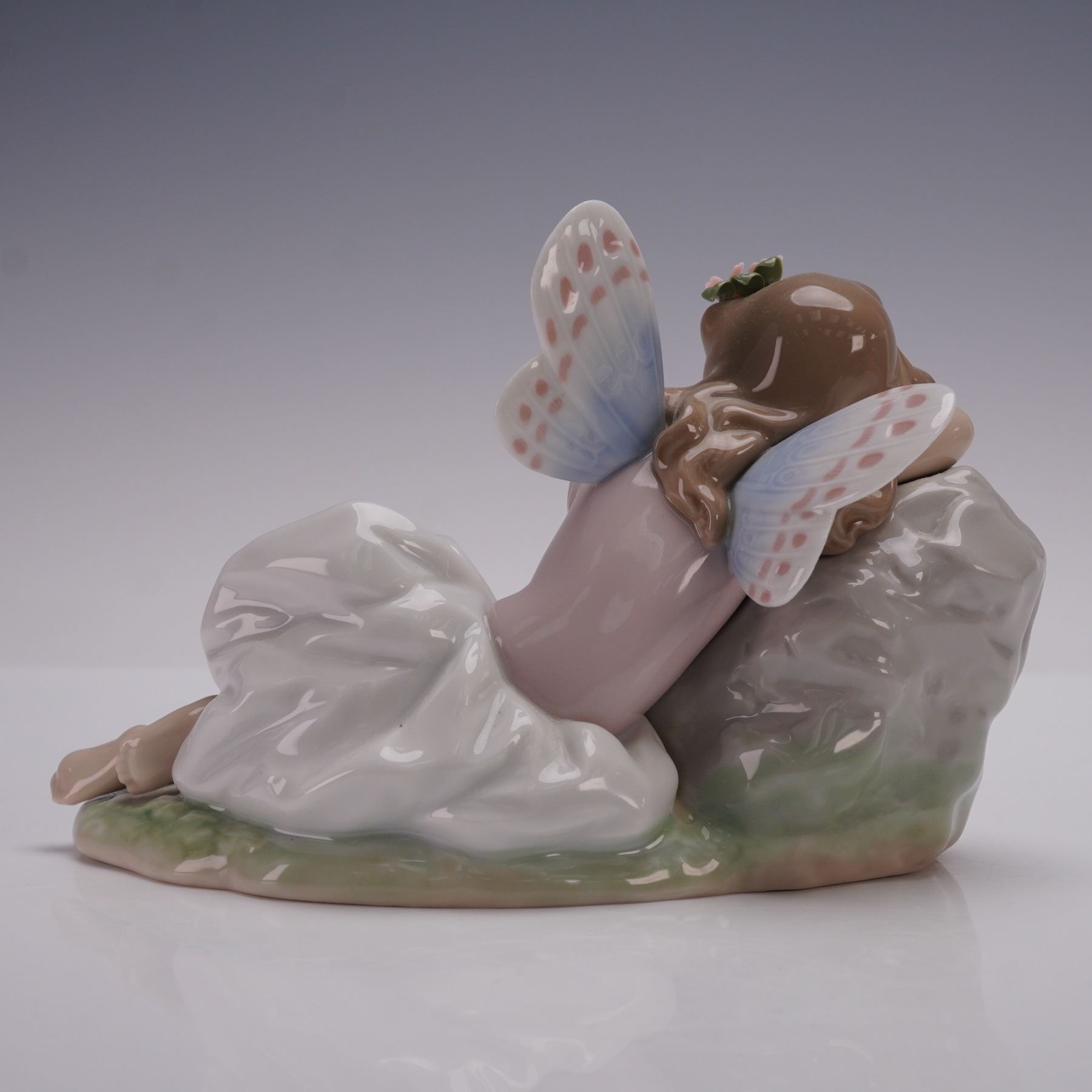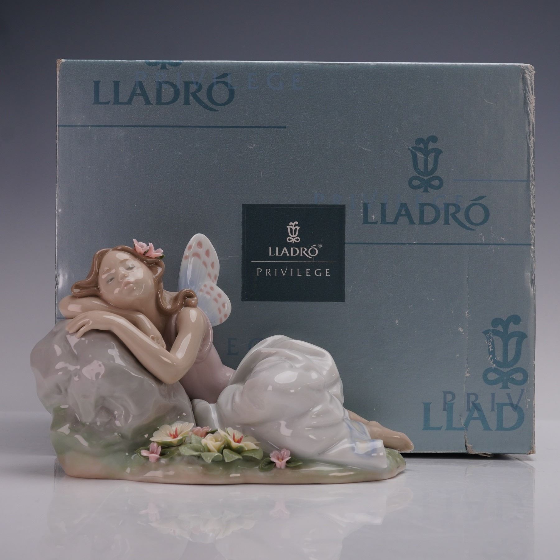 Lladro porcelain figurine 01007694, titled Princess of the Fairies, sculpted by Joan Coderch. Issued in 2002 and retired in 2003, this glazed figurine was the second Annual Edition in the Lladro Privilege Collection series The Enchanted Forest. The design depicts a fairy resting gracefully against a rock with delicate wings and pastel blossoms, capturing a sense of peace and wonder. Base marked with the Lladro hallmark, offered with the original Lladro Privilege box.