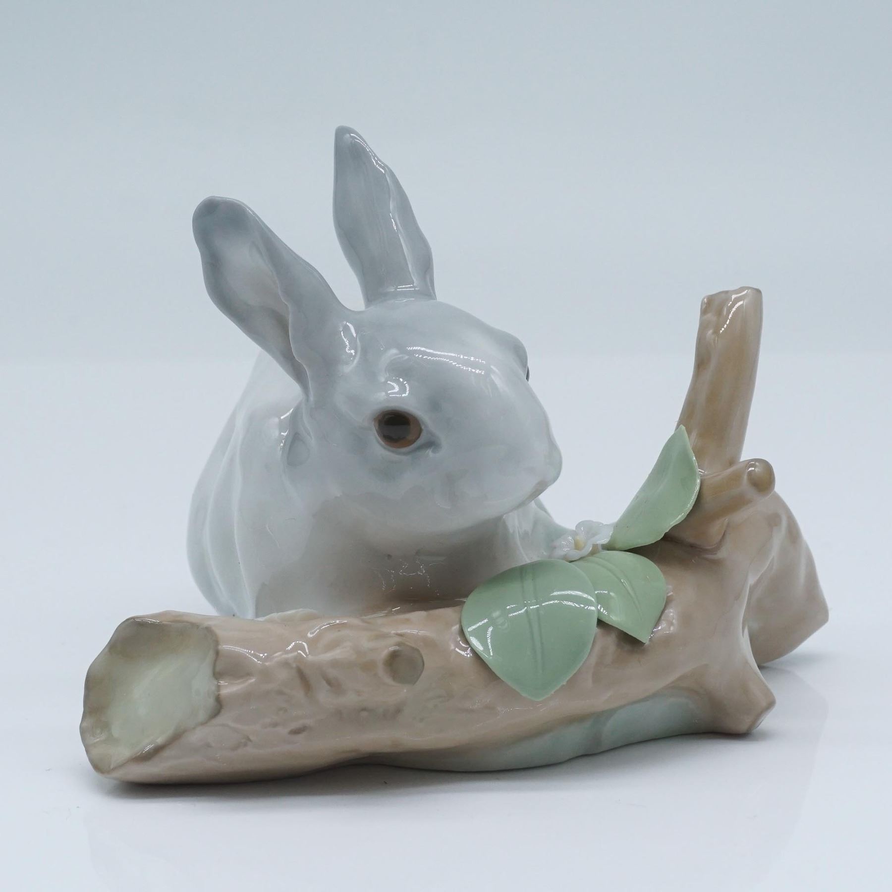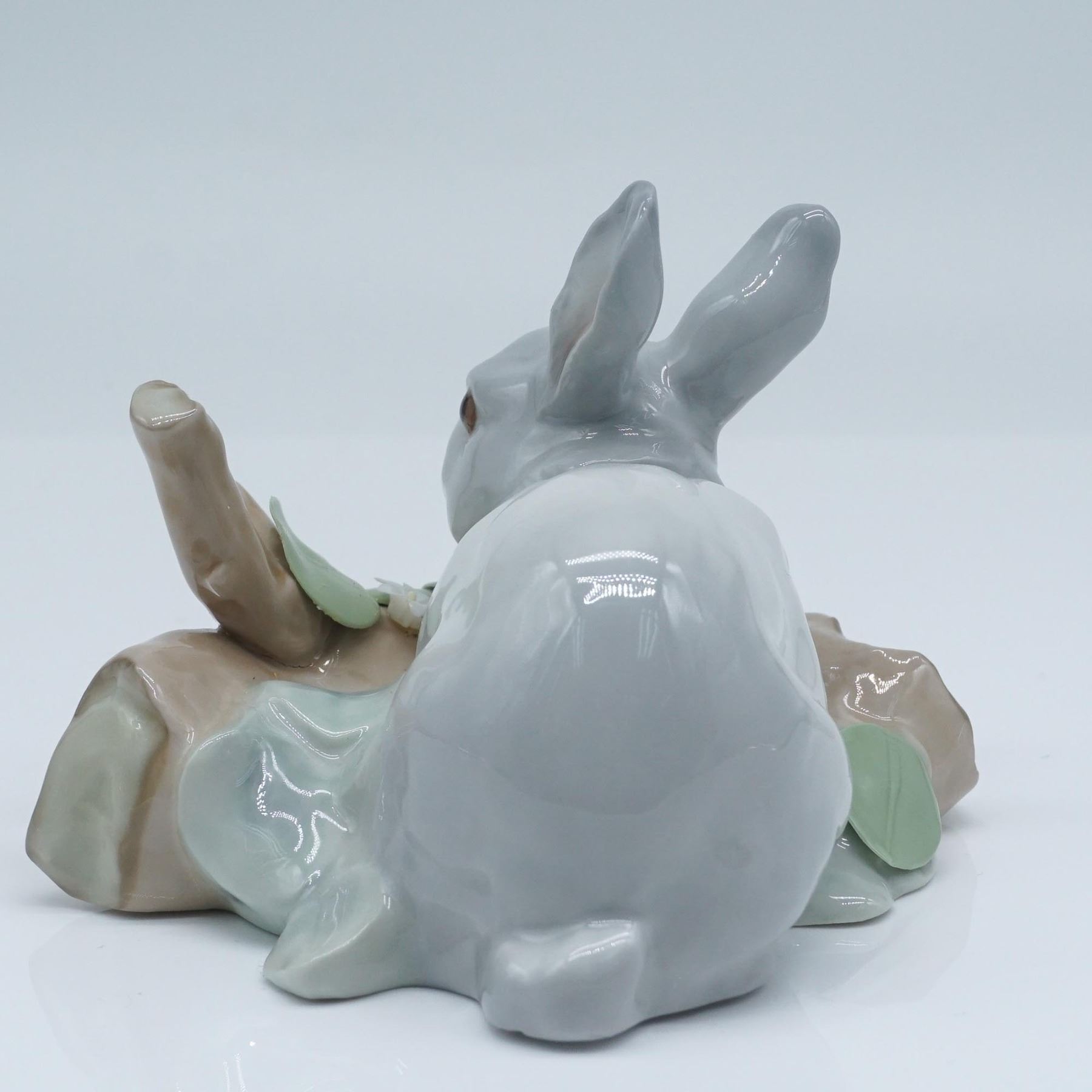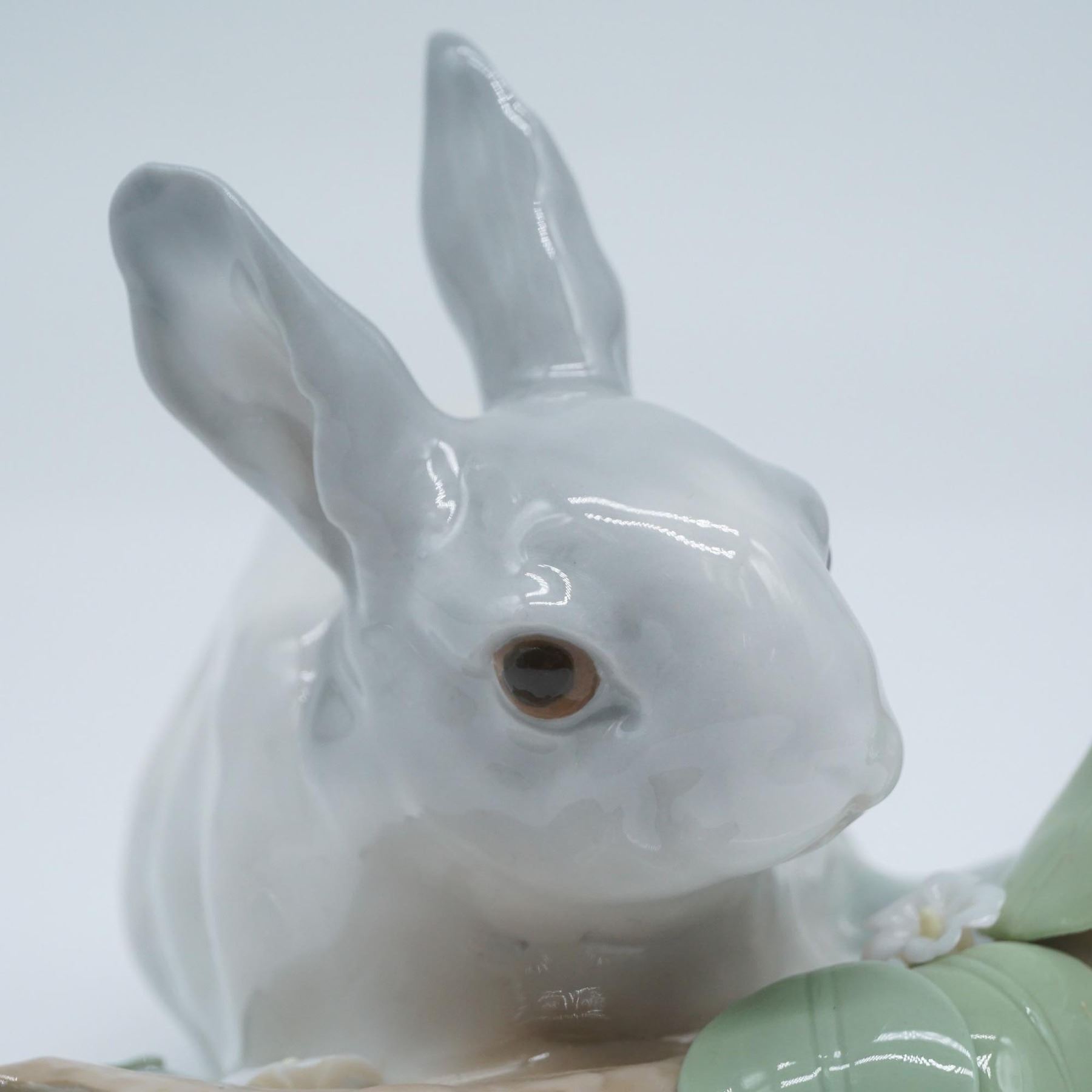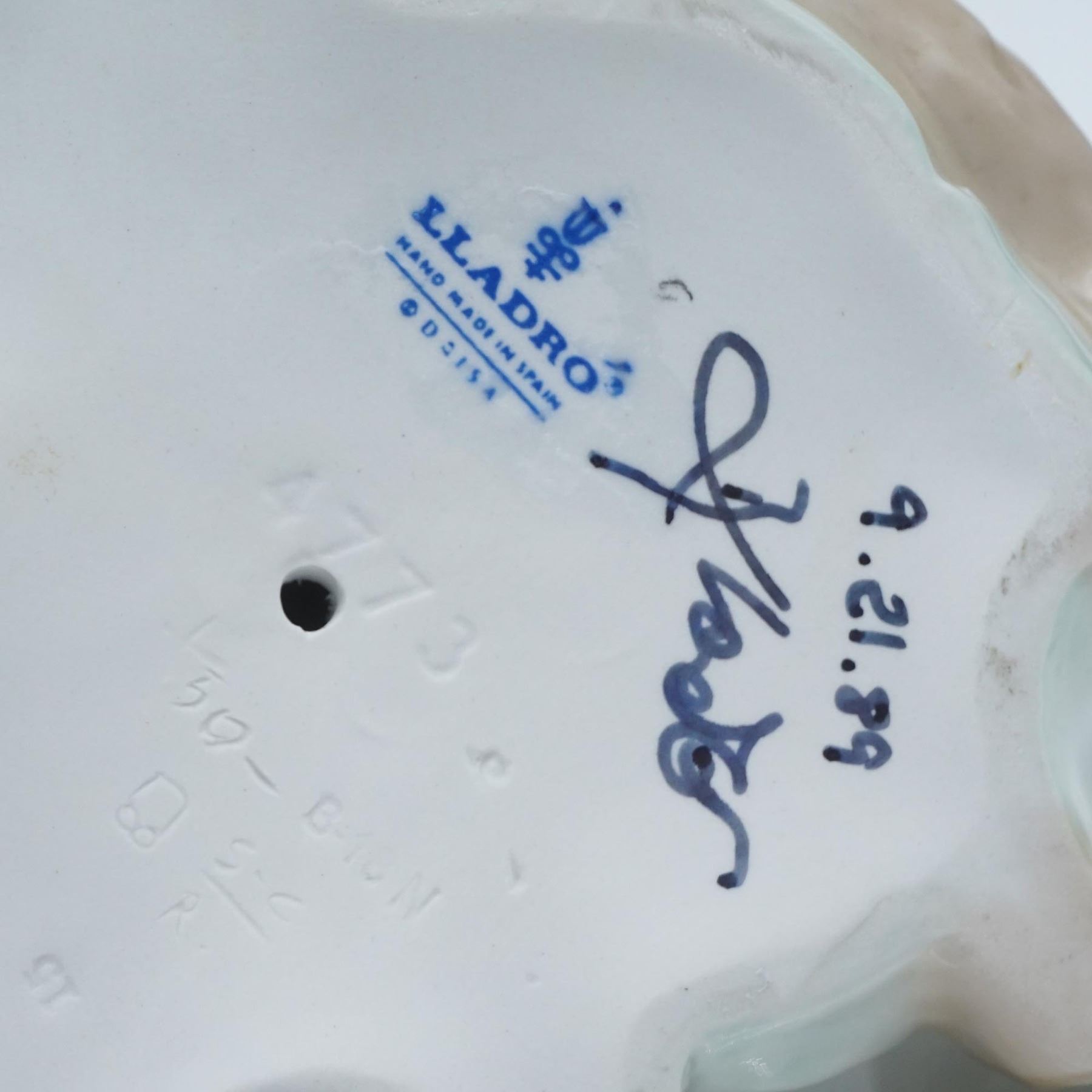 This Lladro porcelain figurine, model number 4773, titled Rabbit Eating (Grey) was sculpted by Fulgencio Garcia. It was first issued in 1971 and retired in 1998. The piece features a delicately sculpted grey rabbit resting beside a log with textured leaves, capturing the gentle nature of this woodland creature. The underside bears the Lladro blue backstamp and a hand-signed date, 9-21-89, reflecting its artisanal craftsmanship.
