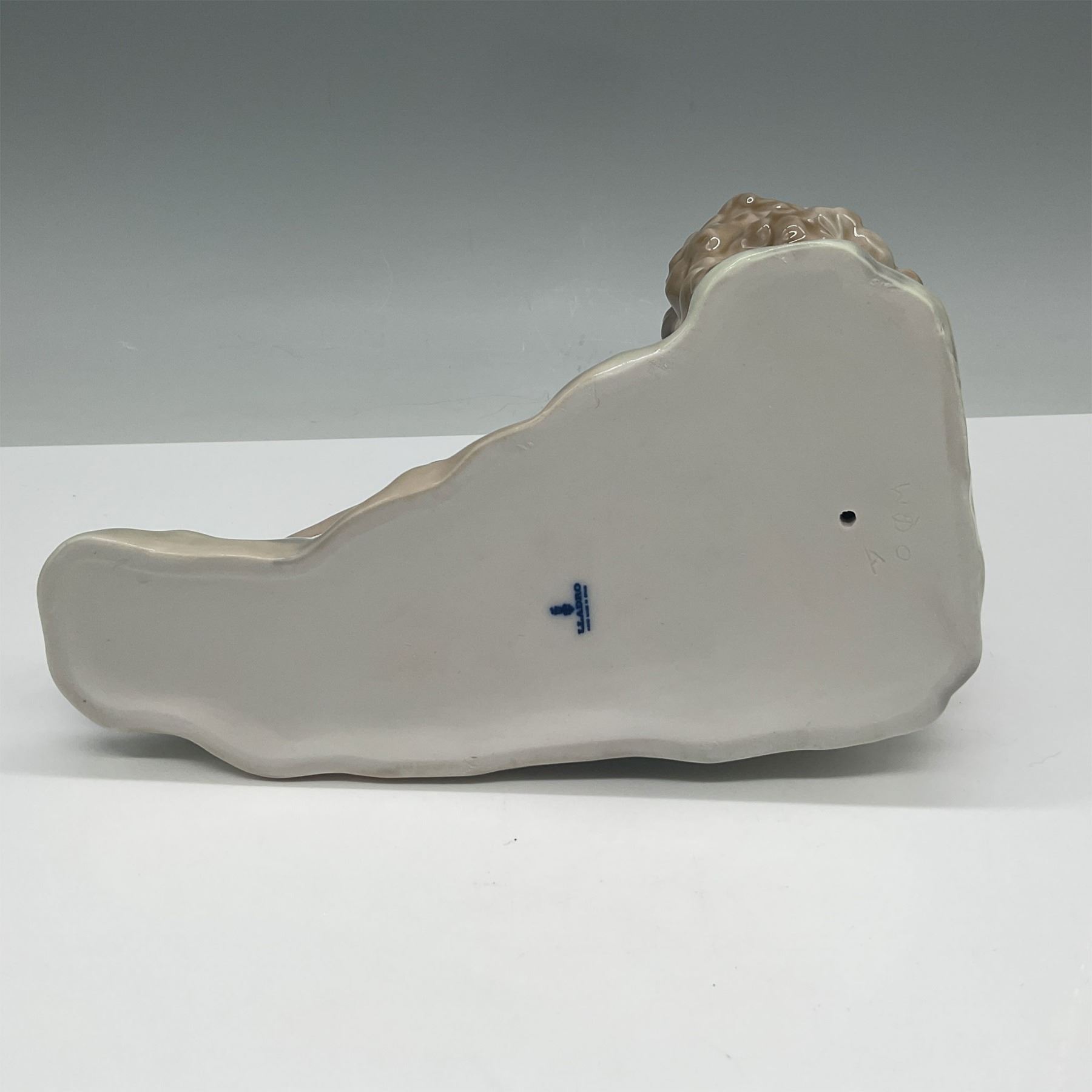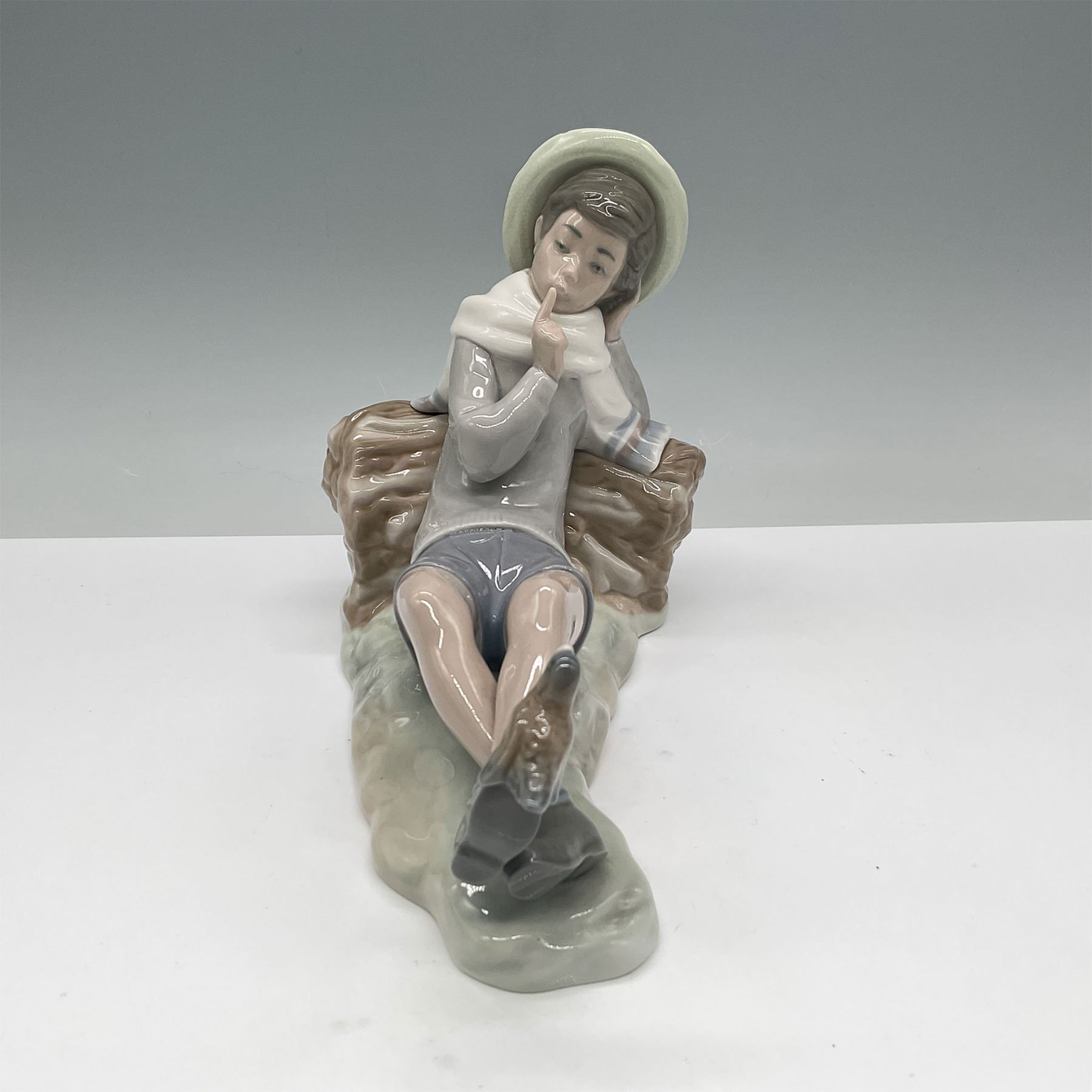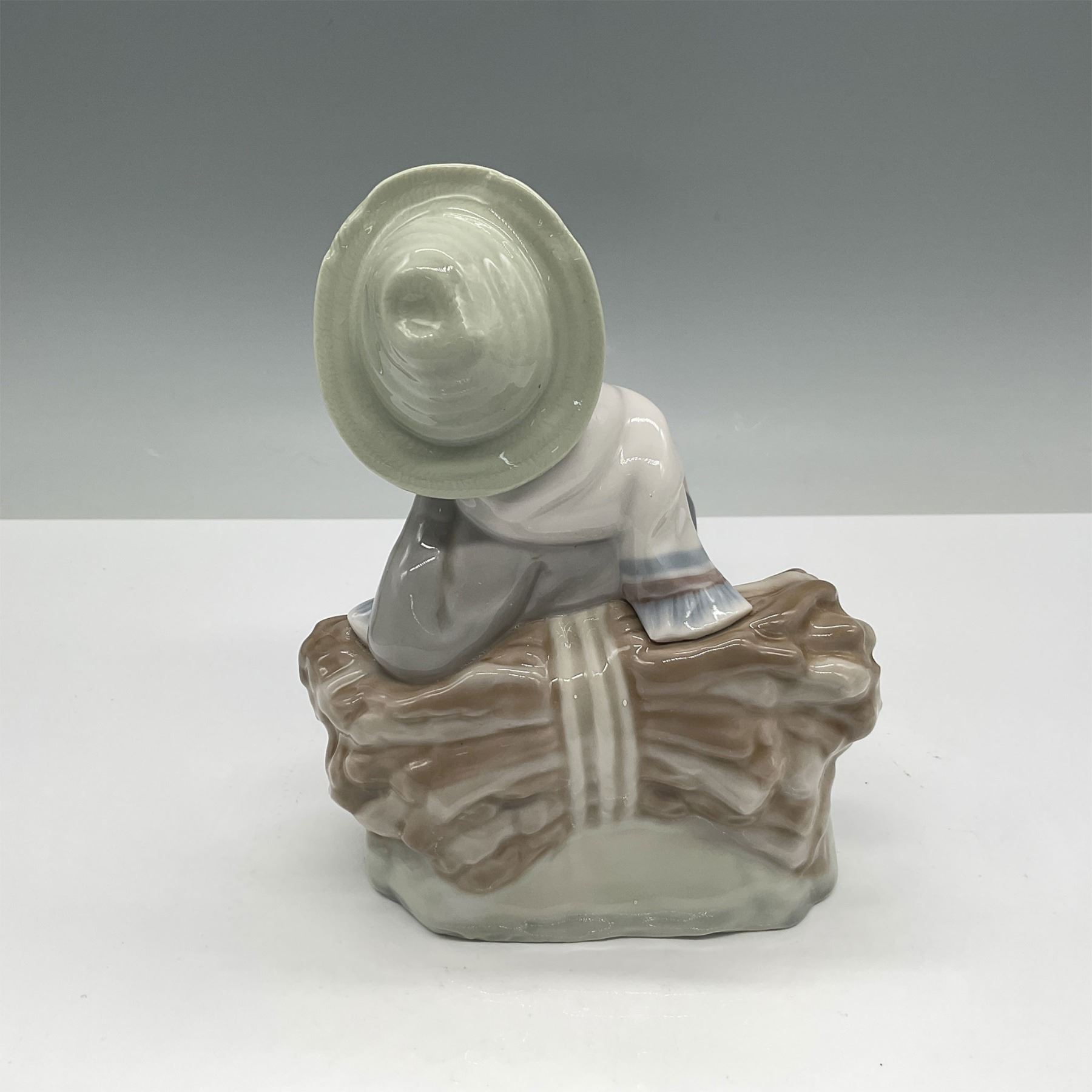 Lladro porcelain figurine titled Shepherd with Bird, model number 01004730. Designed by Vincente Martinez, this charming piece portrays a young shepherd resting on a haystack, with a small bird perched nearby. Crafted in Spain, this hand-painted figure showcases Lladro signature soft pastel tones and meticulous detailing. The underside features the official Lladro backstamp.