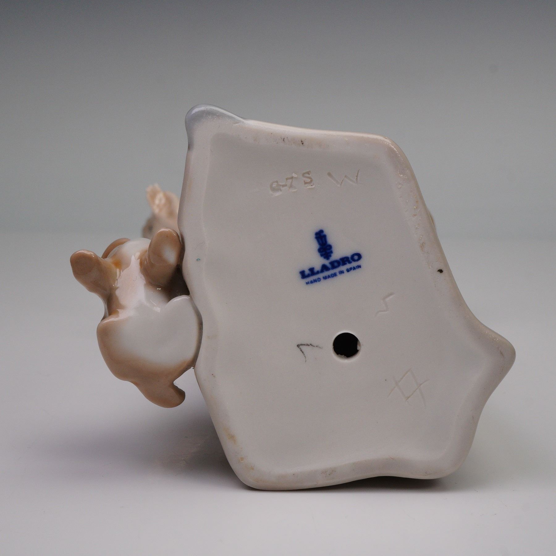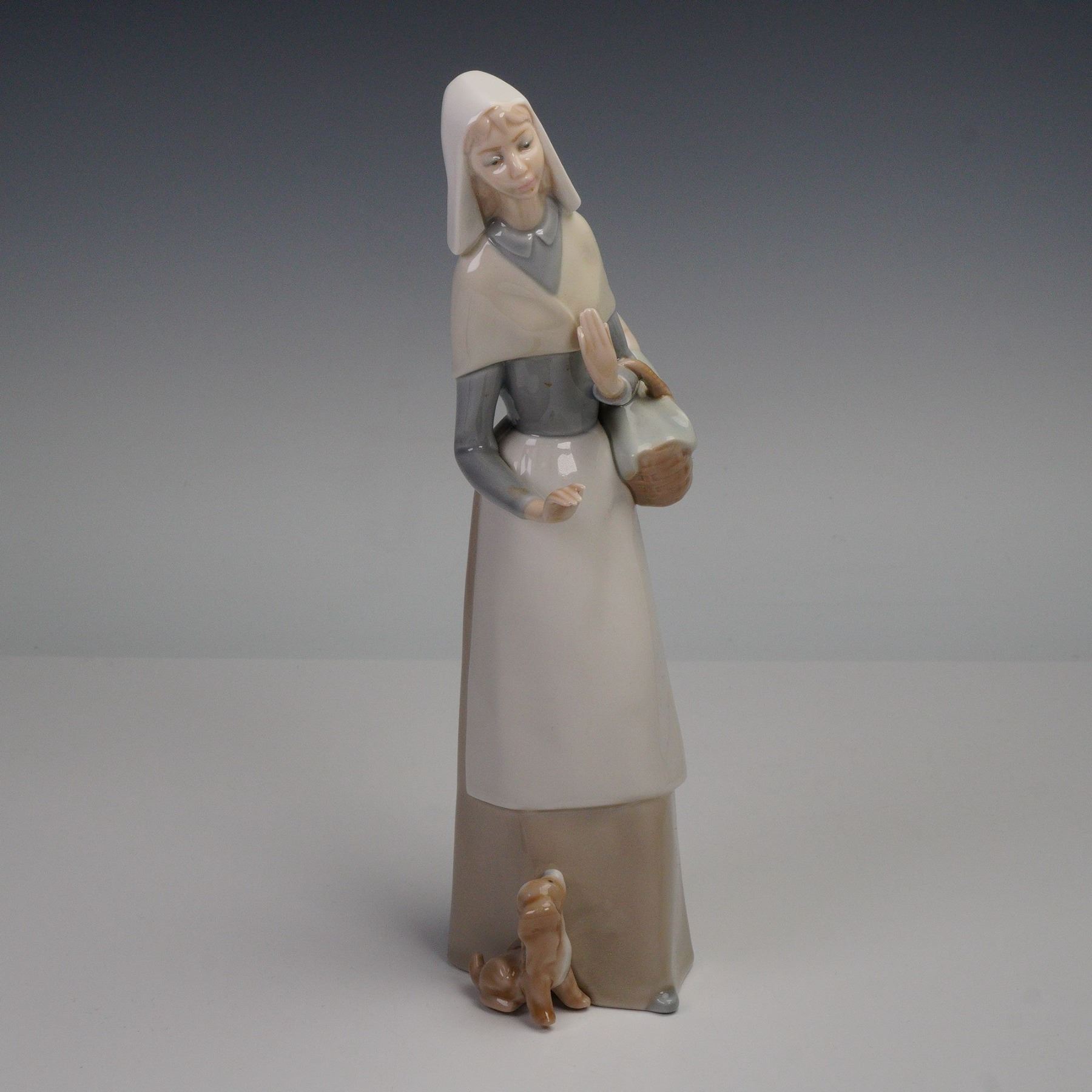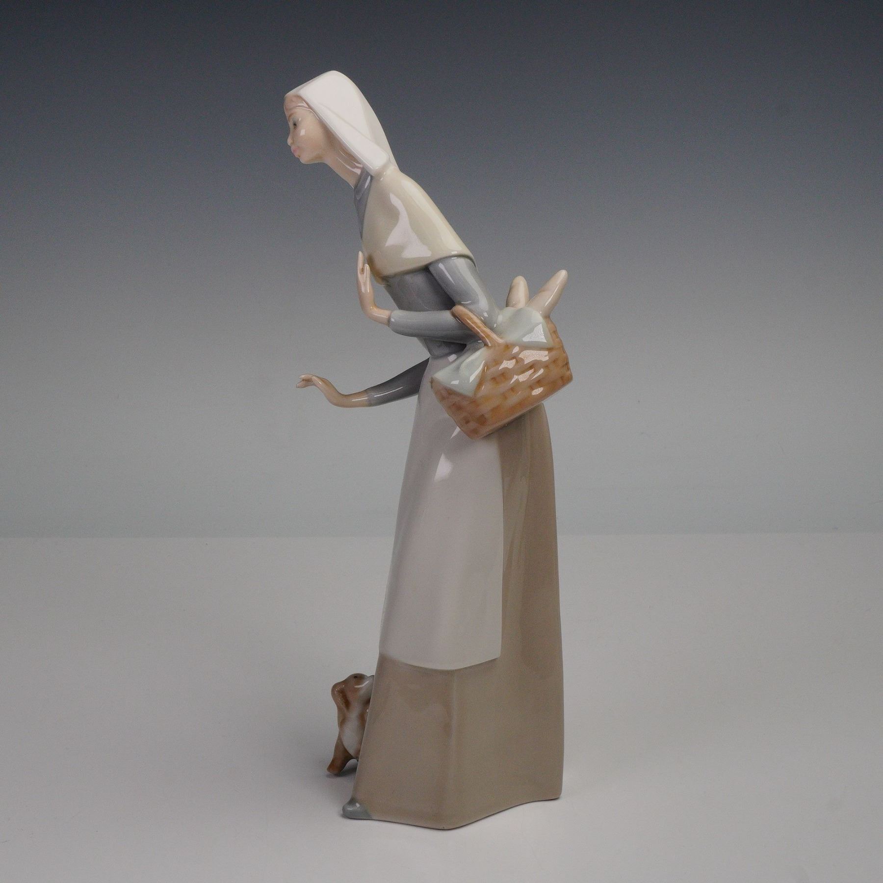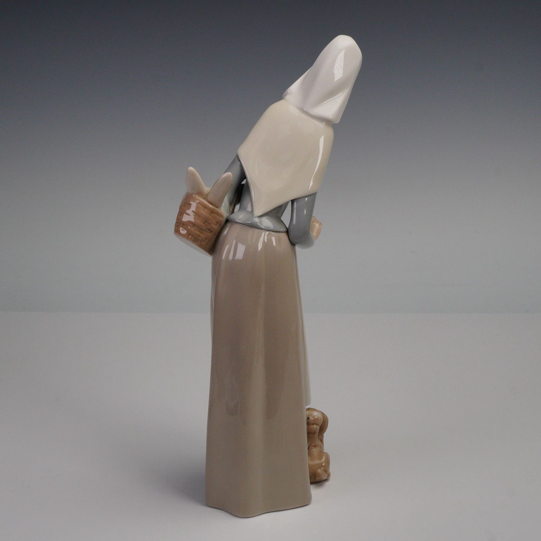 This delicate hand-painted sculpture depicts a young woman in traditional attire carrying a basket with bread, accompanied by a small dog at her feet. Finished in Lladro's signature soft pastel glaze, exemplifying the brand's serene and graceful artistry. Stamped with the Lladro blue hallmark, Hand Made in Spain.