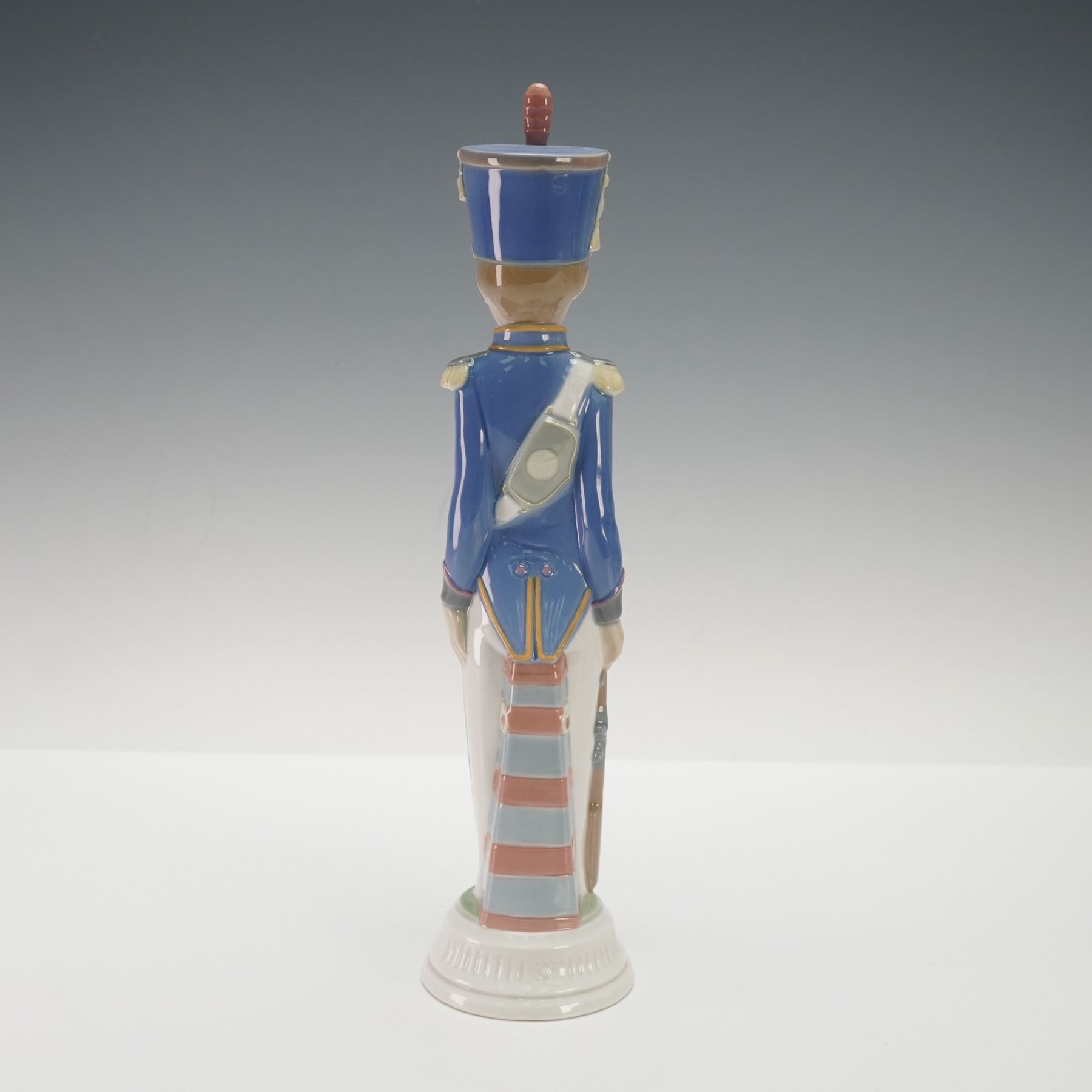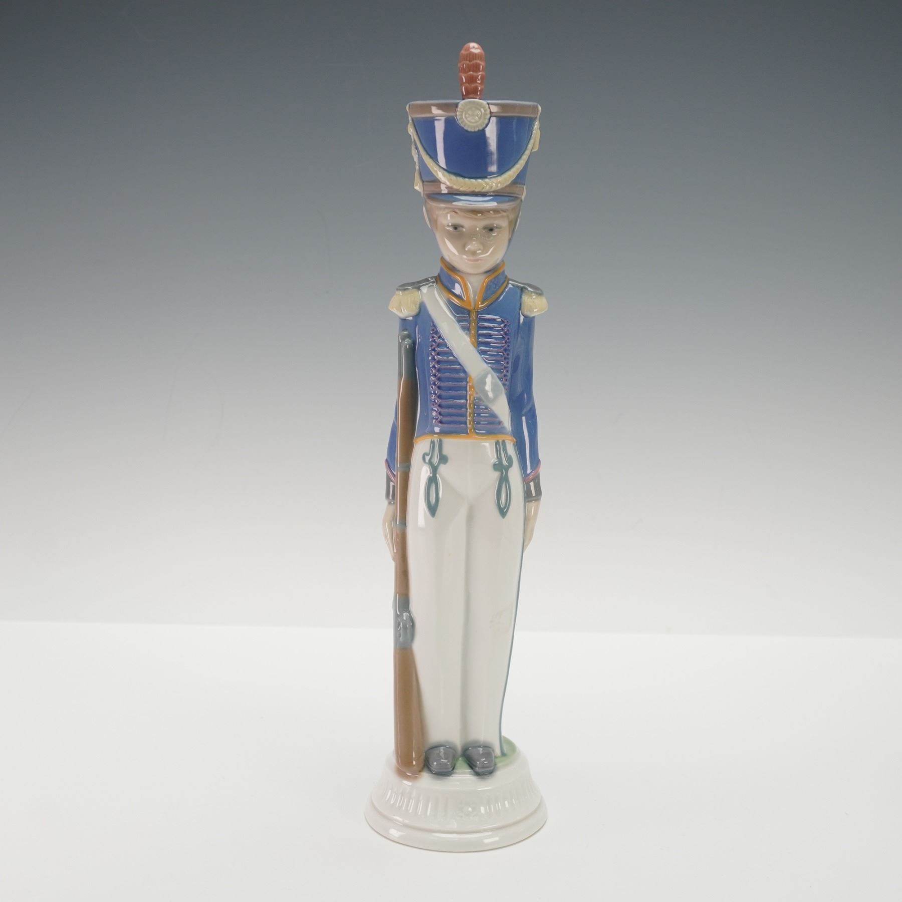 Finely crafted glossy porcelain figure of a young soldier in dress uniform, holding a rifle at his side. The figure features a vivid blue jacket with yellow trim, white trousers, and a tall hat topped with a plume. The detailed modeling captures the crisp lines and formal stance of a ceremonial guard. Marked with the Lladro blue hallmark to base.