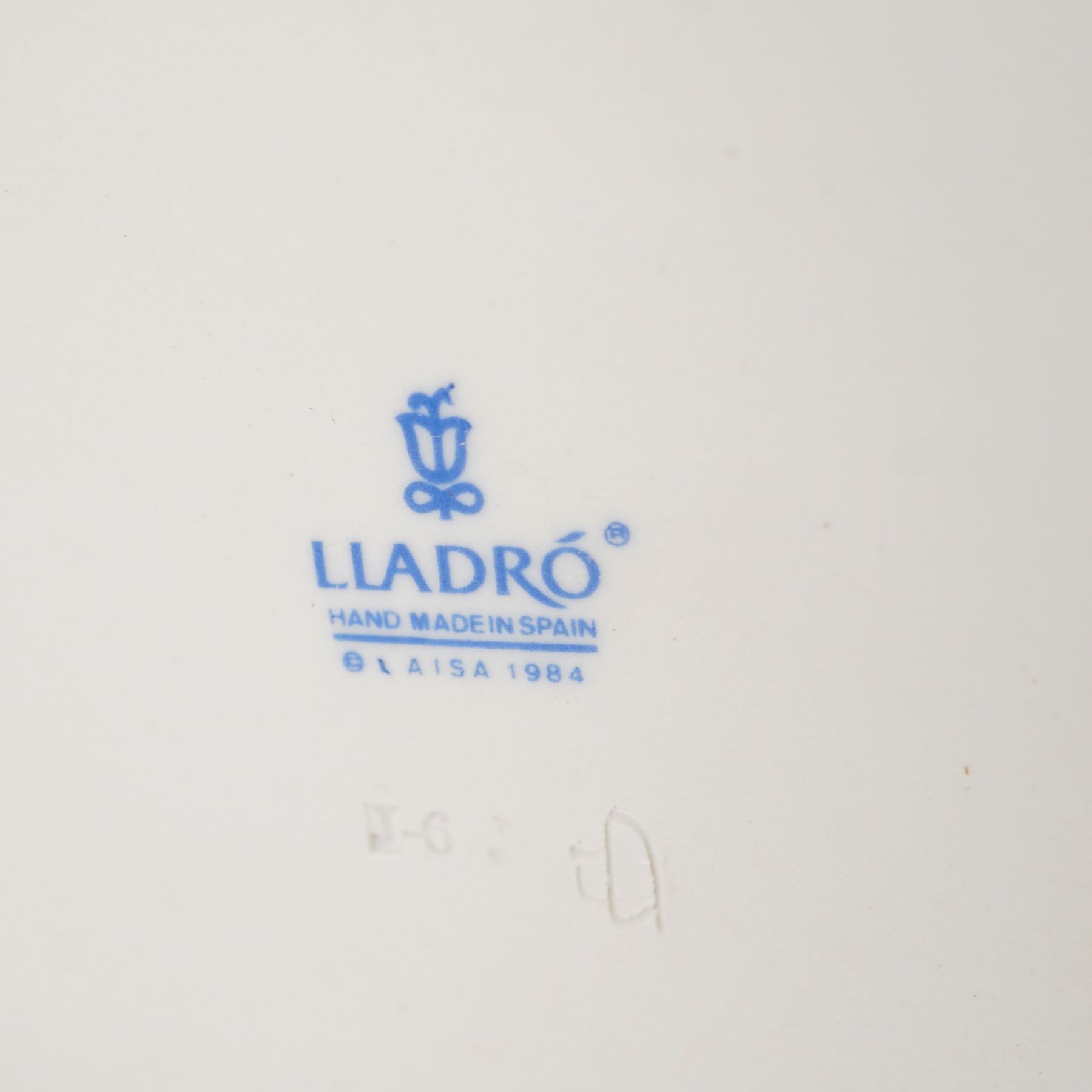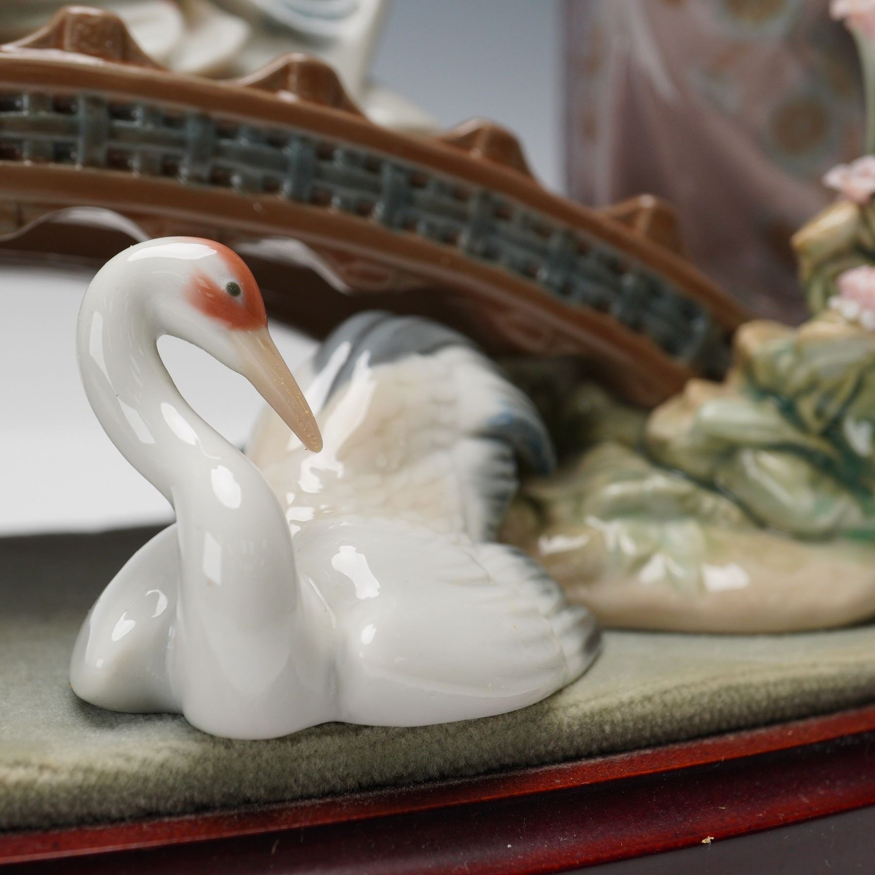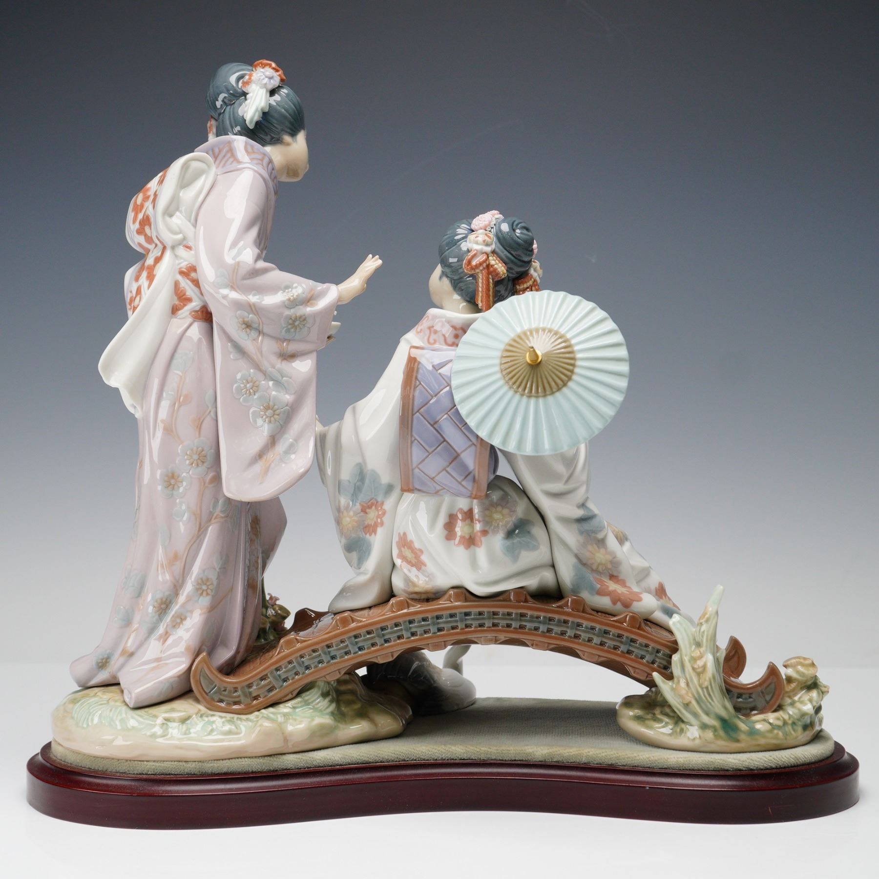 A finely detailed Lladro porcelain figurine titled Springtime in Japan (01001445), designed by Salvador Debon. This composition features two elegant Japanese women in traditional kimonos, one seated on a decorative bridge beside a swan, and the other offering a dish of flowers. Beautifully hand-painted in pastel tones with delicate floral accents, the piece captures the serene grace of Japanese culture. Includes original fitted wood base and Lladro box.