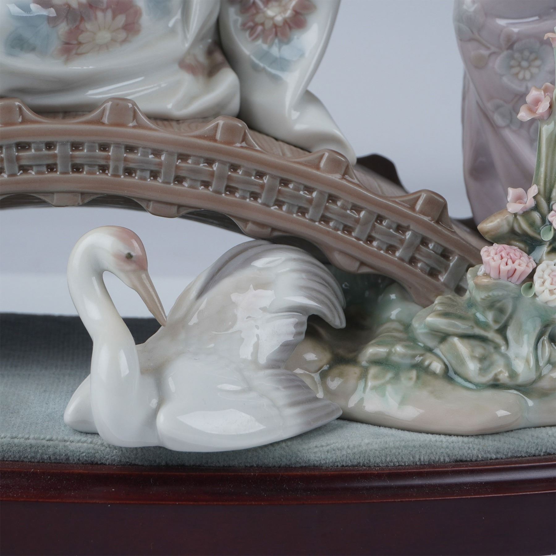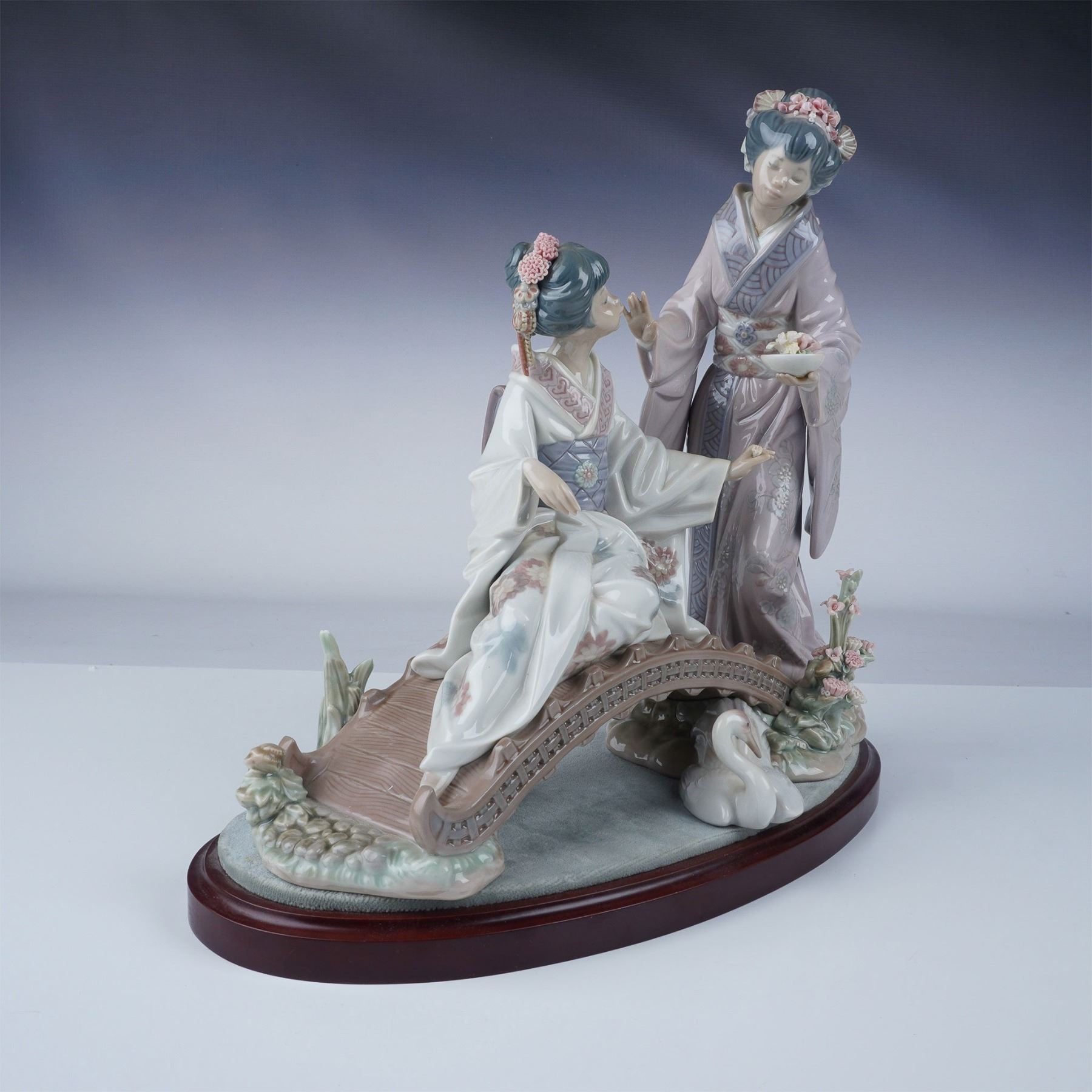 Lladro figurine 01001445, titled Springtime in Japan, depicts a serene scene of two elegantly dressed geishas on a bridge, complemented by intricate details such as floral accents, a swan, and a detachable parasol. Designed by Salvador Debon and released in 1983, this piece highlights Lladro signature craftsmanship in glazed porcelain. The figurine comes with its original custom wooden base, enhancing its display appeal, and features the iconic Lladro backstamp on the underside, certifying its authenticity. The original box is included, adding to its collectability. Includes original box and wooden base.