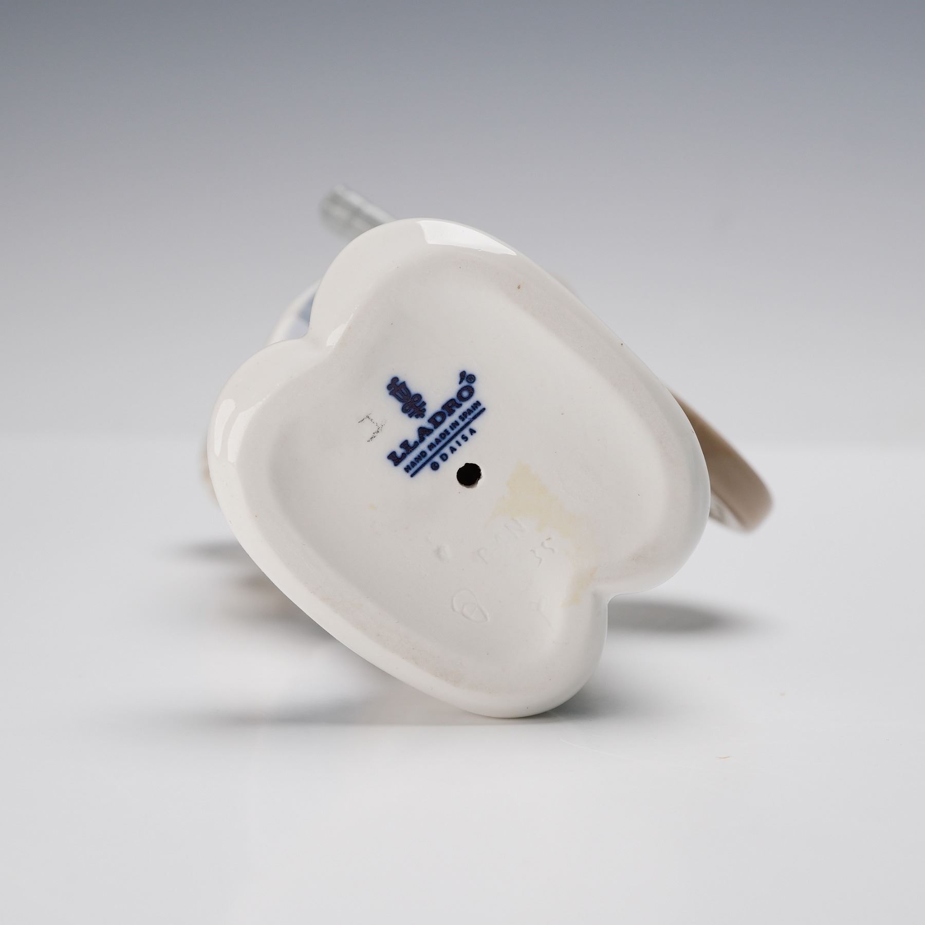 Glossy finish porcelain depicting a youthful puppet tennis player holding a ball aloft with racket tucked under one arm. It is modeled in soft pastel tones with oversized cap and athletic attire. Lladro backstamp. This item has its original box.