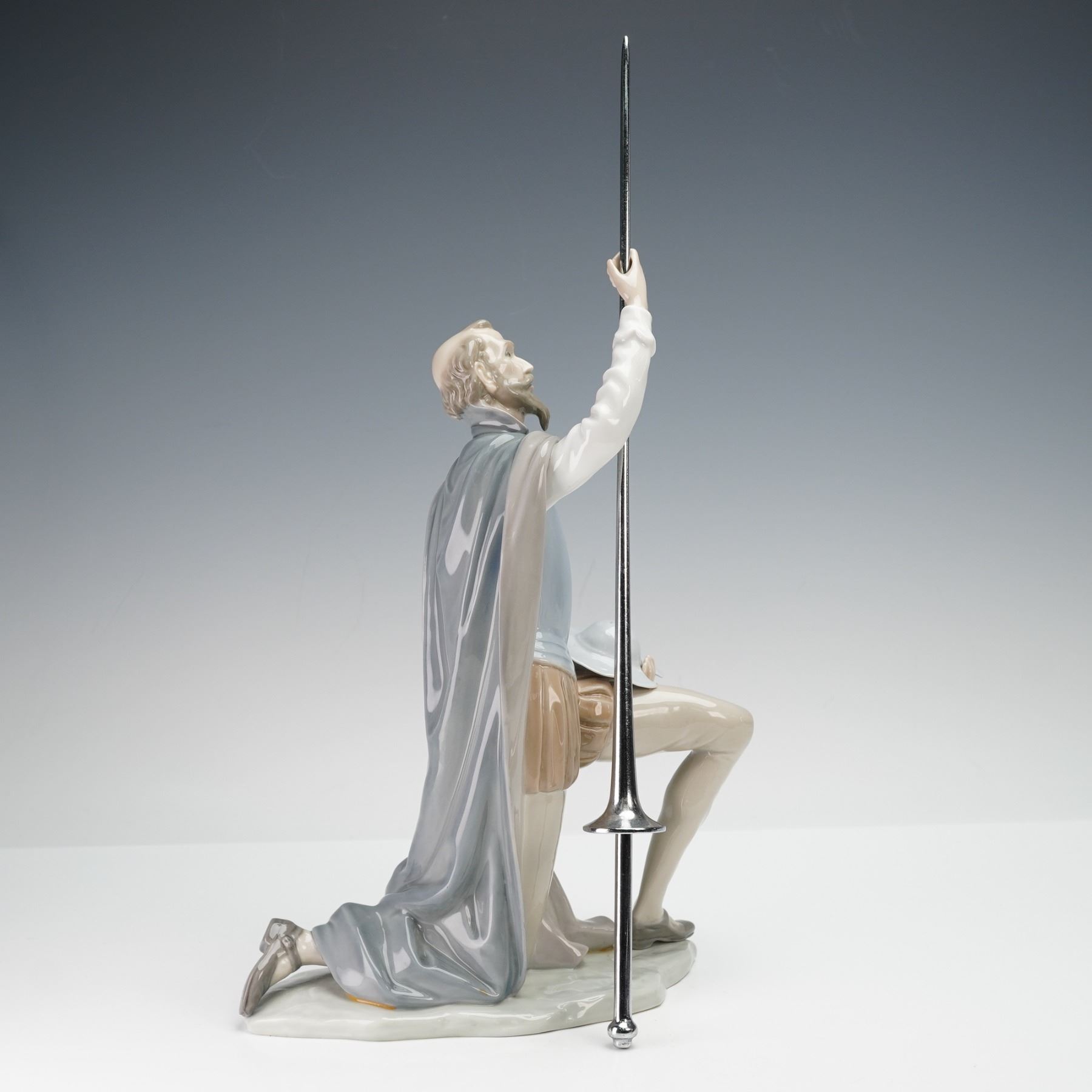 Finely modeled Lladro porcelain figurine titled The Quest (1005224), depicting Don Quixote kneeling and gazing upward while holding a long lance and helmet. Rendered in soft pastel hues of gray, blue, and beige with a glossy glaze finish, this sculptural work captures the spirit of devotion and chivalric resolve characteristic of Lladro's artistry. Marked Lladro, with impressed numbers to the underside.
