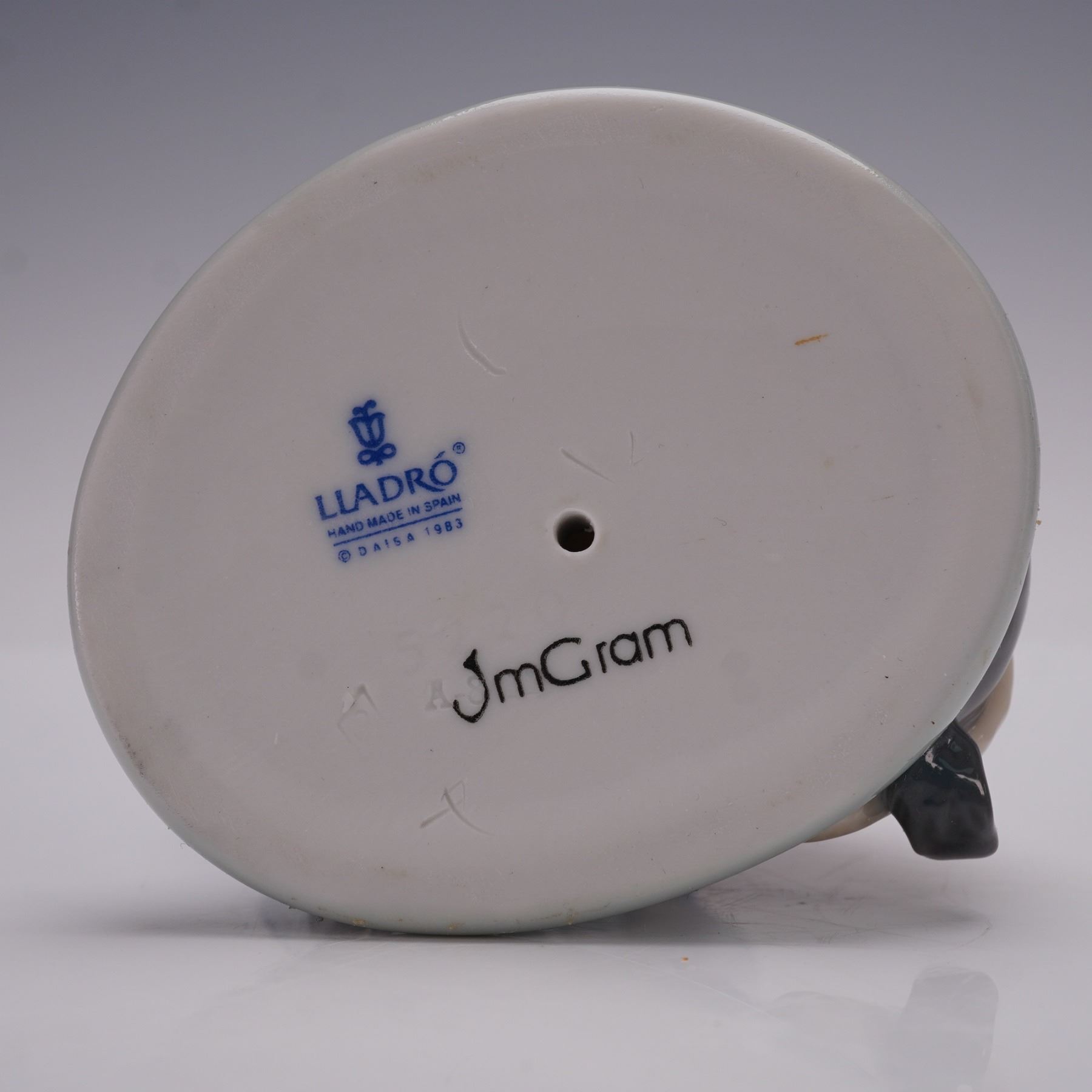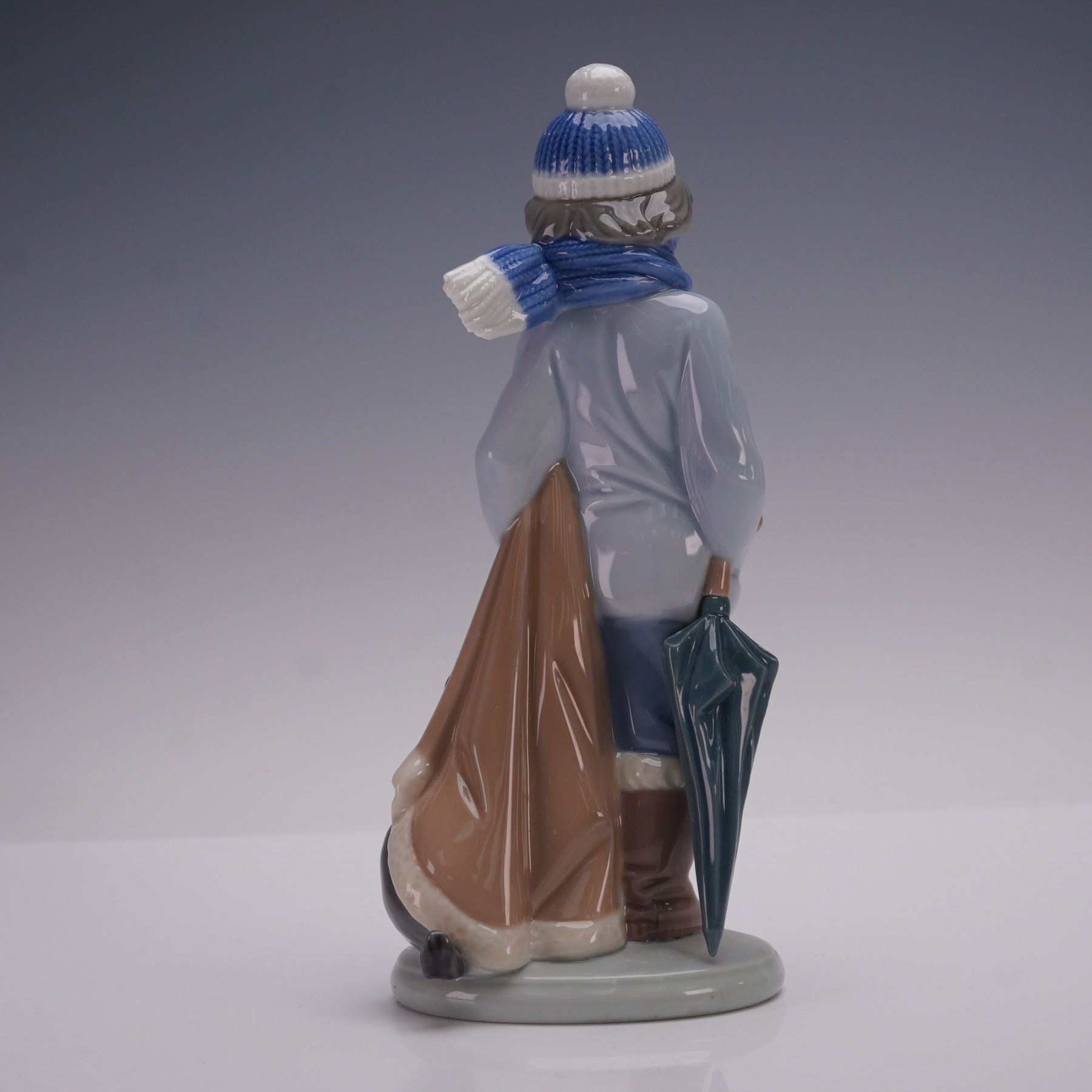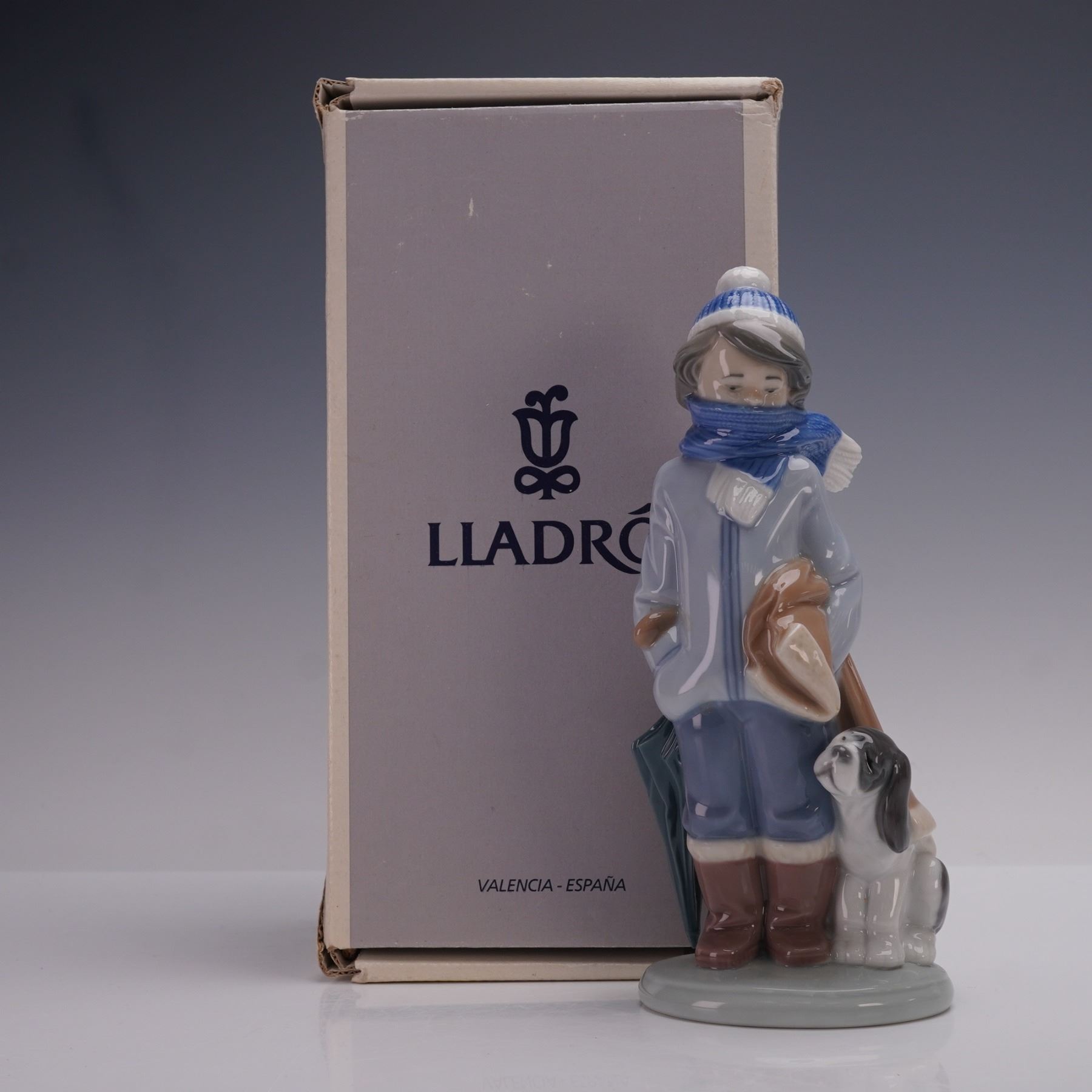 Lladro porcelain figurine 01005220, titled Winter, sculpted by Juan Huerta. Issued in 1984 and retired in 2001, this glazed figurine depicts a warmly dressed child in winter clothing, accompanied by a loyal dog at their side. The design captures the charm of seasonal life, highlighted by fine detailing in the boy's attire and the gentle expression of the dog. A long-running issue that has since become collectible, this piece reflects Lladro's artistry and attention to lifelike detail. Base marked with the Lladro hallmark. This item has its original box.