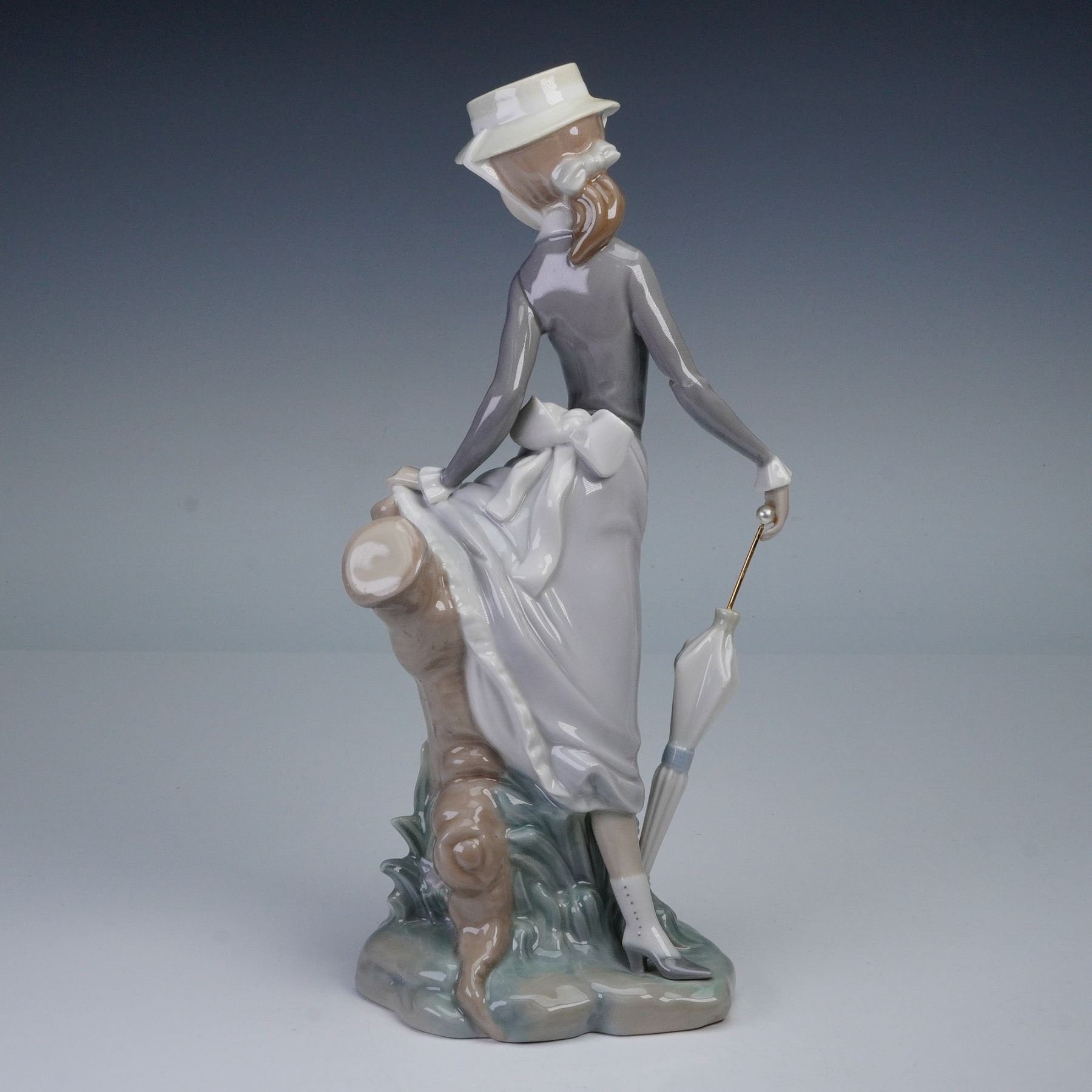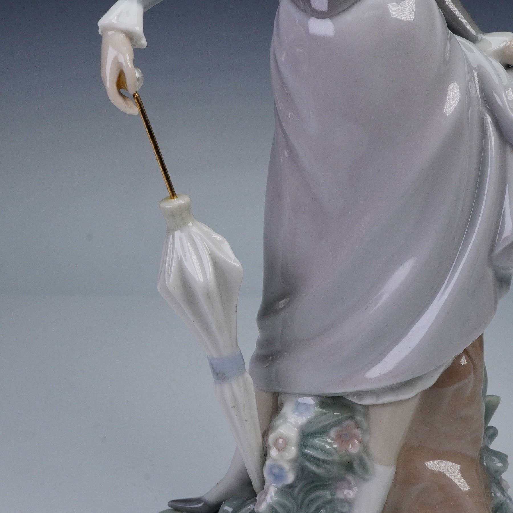 This elegant Lladro Porcelain figurine, Young Lady in Trouble, portrays a graceful young woman in a delicate moment, as she gracefully adjusts her skirt while holding an umbrella. Sculpted by Salvador Debon, the figurine captures the refined beauty and intricate detailing Lladro is known for, with soft colors and intricate modeling that bring the character to life. This piece is an exquisite example of Lladro's artistry, making it a lovely addition to any collection, includes Lladro backstamp on base.