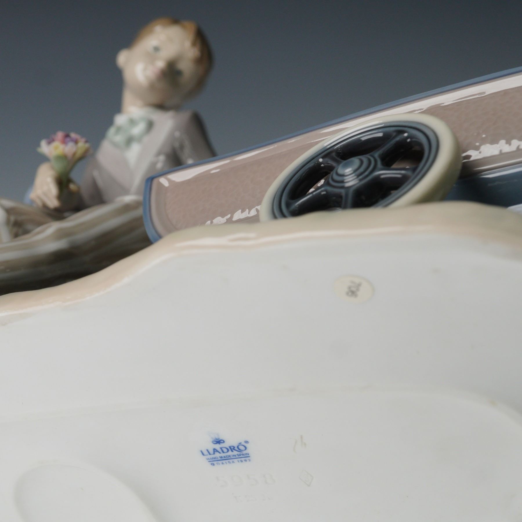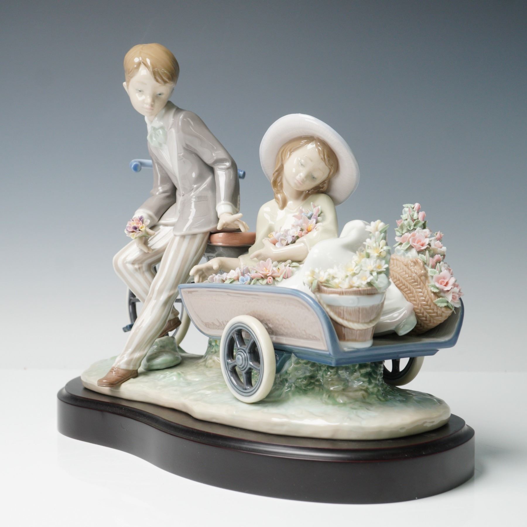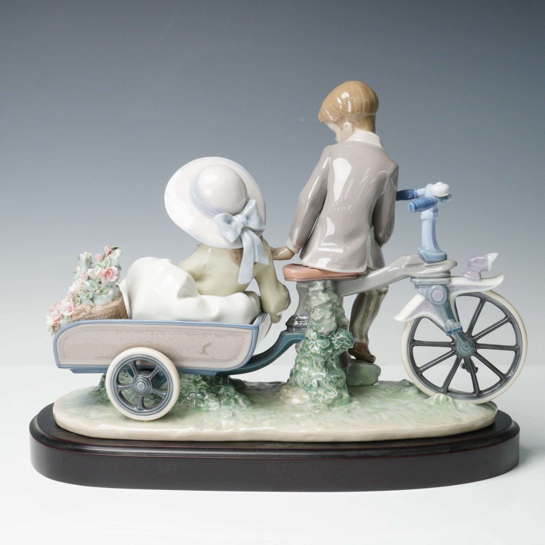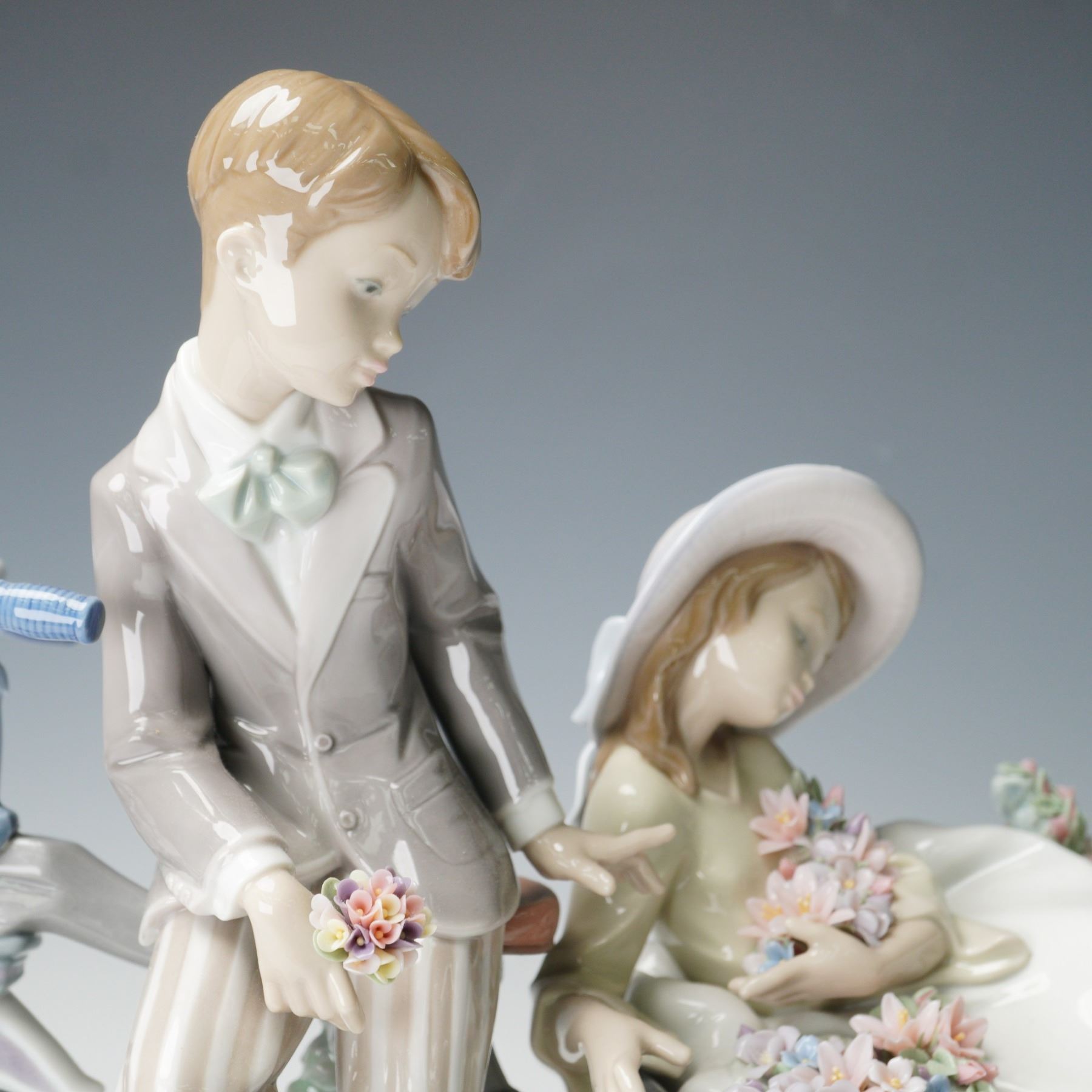 Depicting a boy on a bicycle with a seated girl holding a bouquet of flowers in a cart filled with floral arrangements. The figures are dressed in pastel tones with delicate detailing, including a hat with a ribbon and small hand-crafted flowers. The composition rests on an attached base and is accompanied by its original box. The underside bears the Lladro backstamp.