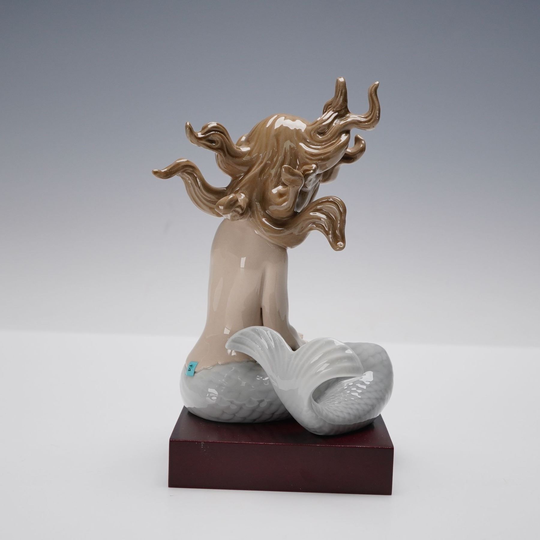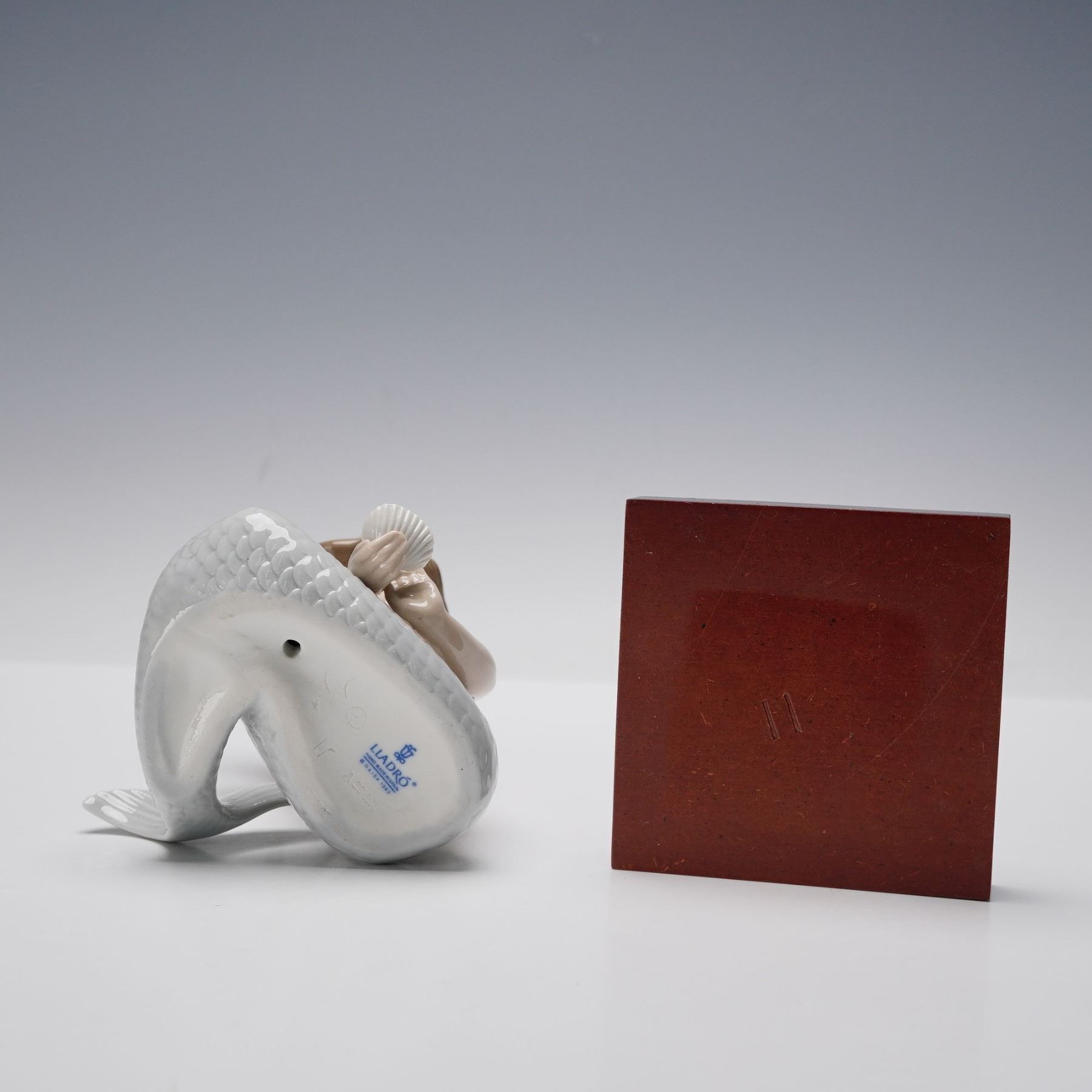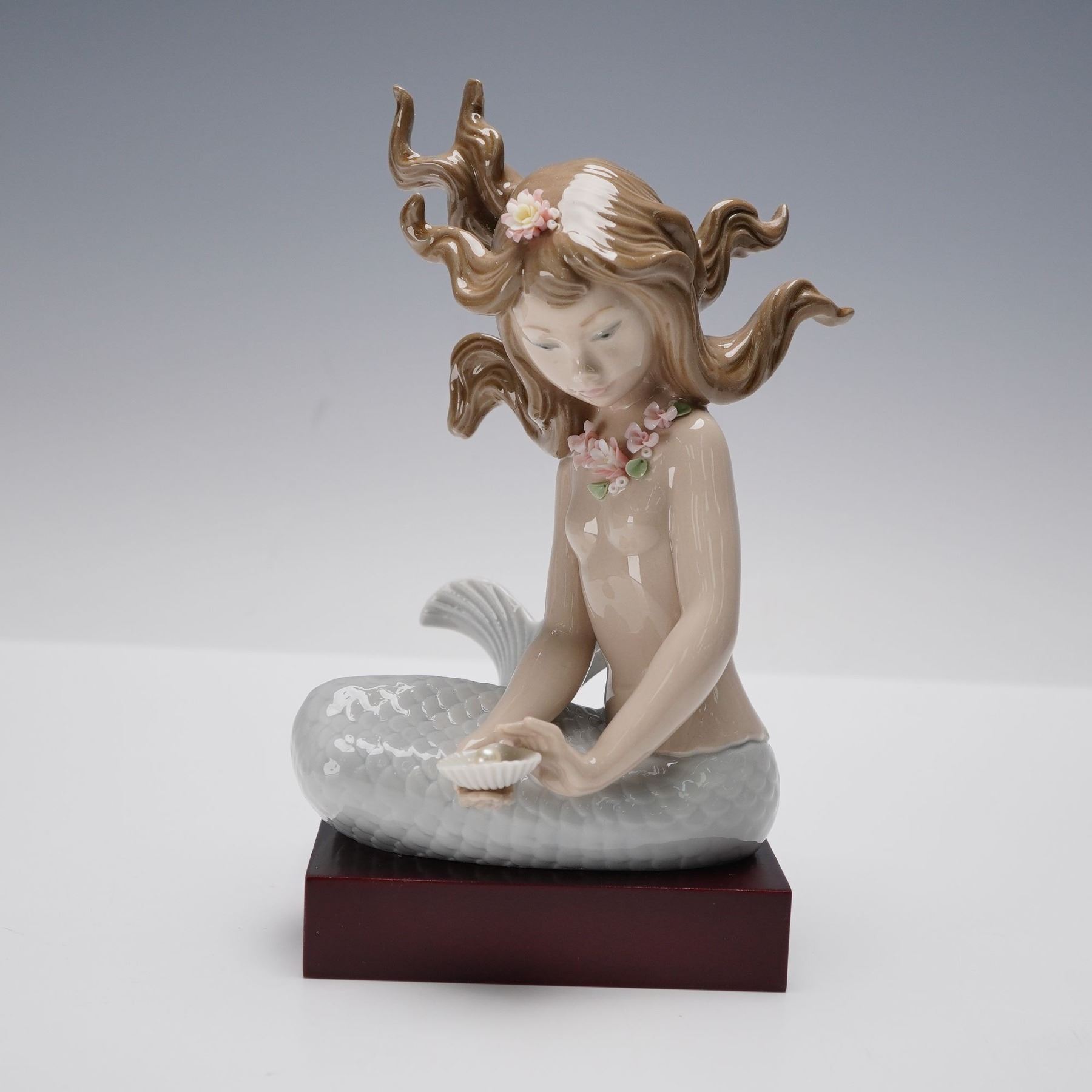 Beautifully crafted porcelain figurine depicting a serene mermaid seated gracefully on a wooden base, delicately holding a seashell in her hand. Her flowing hair adorned with pastel flowers and the detailed scales of her tail exemplify the fine artistry characteristic of the renowned Spanish maker. The piece features soft glazed tones and bears the Lladro hallmark. This item has its original box.