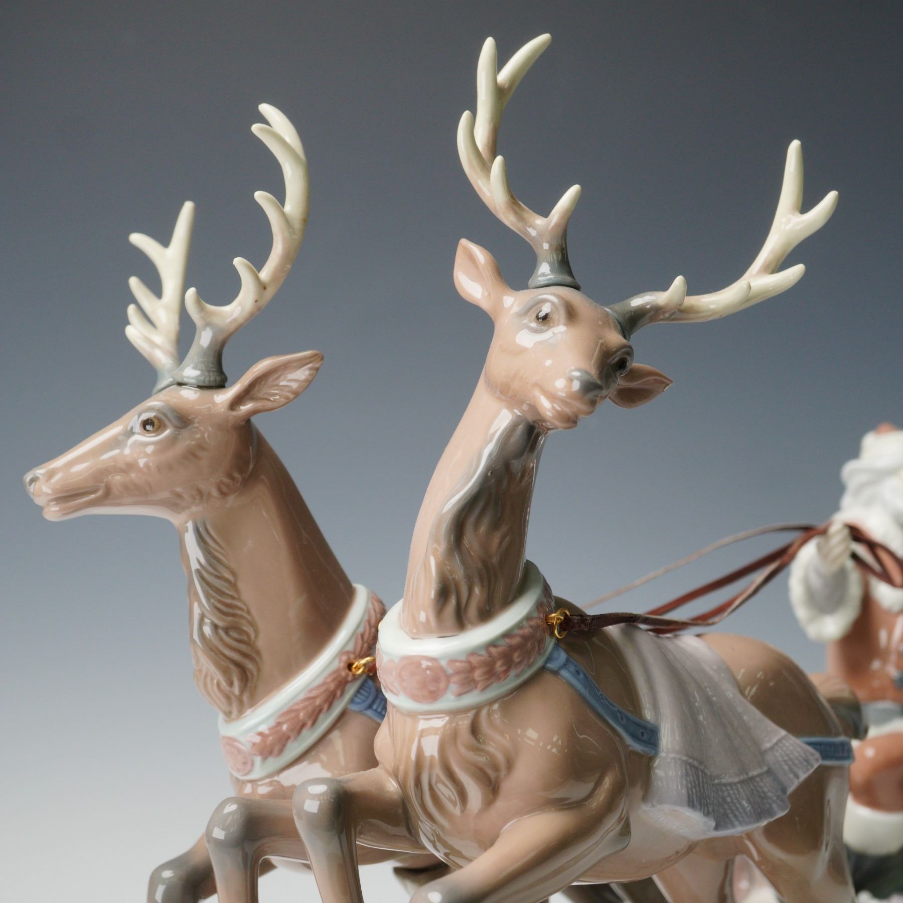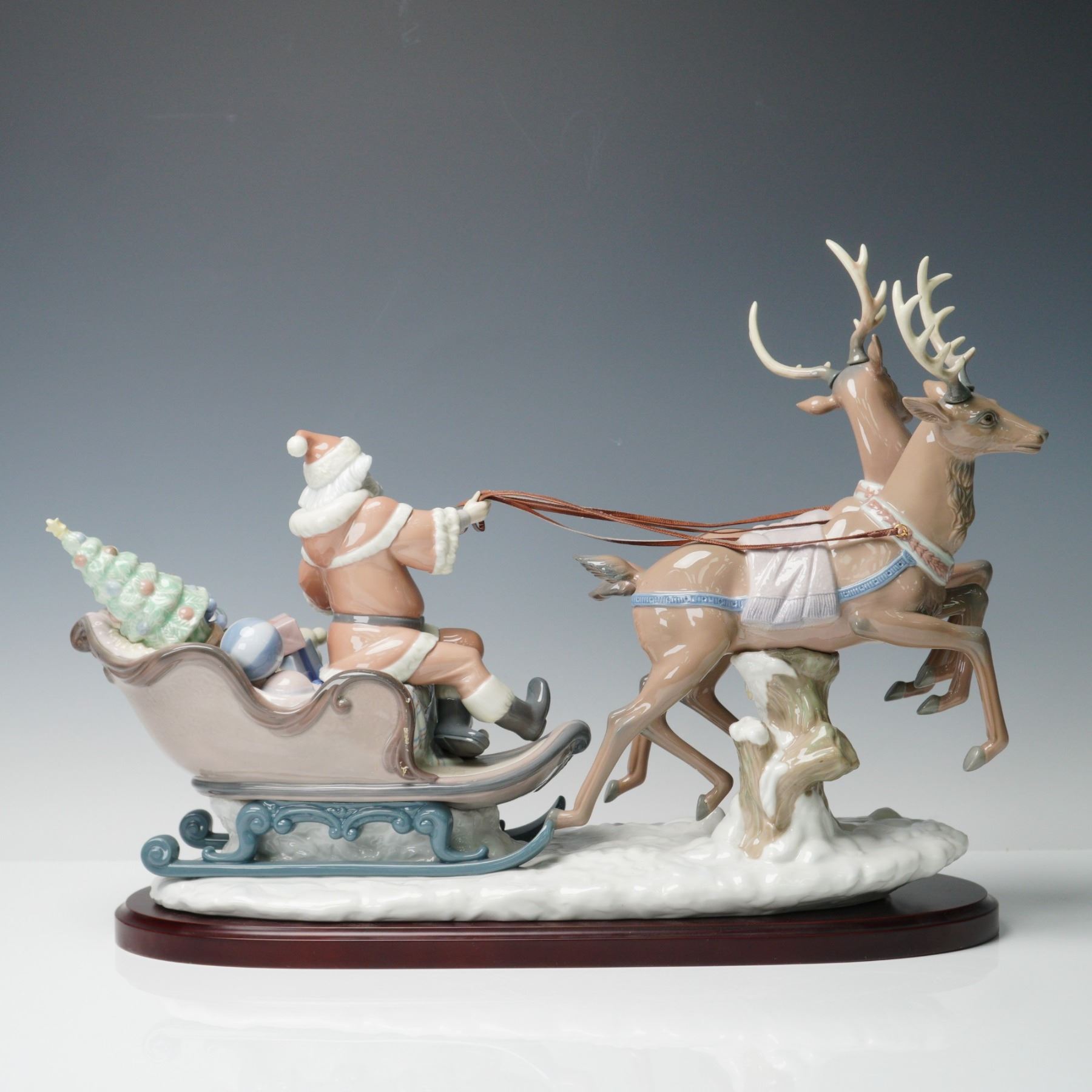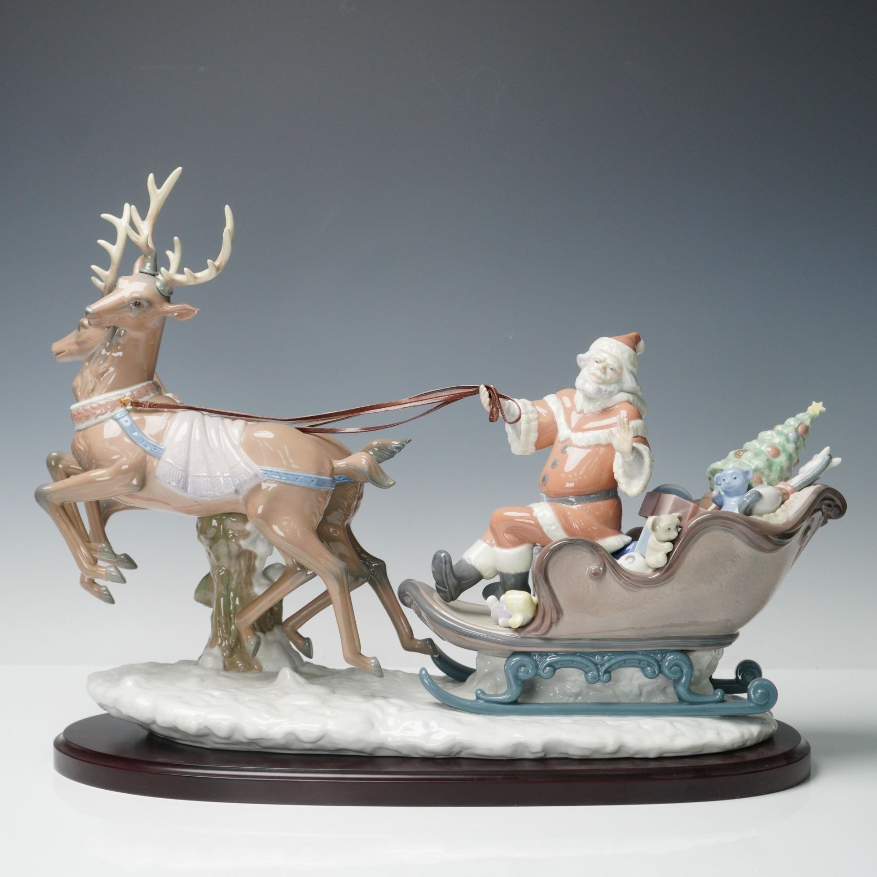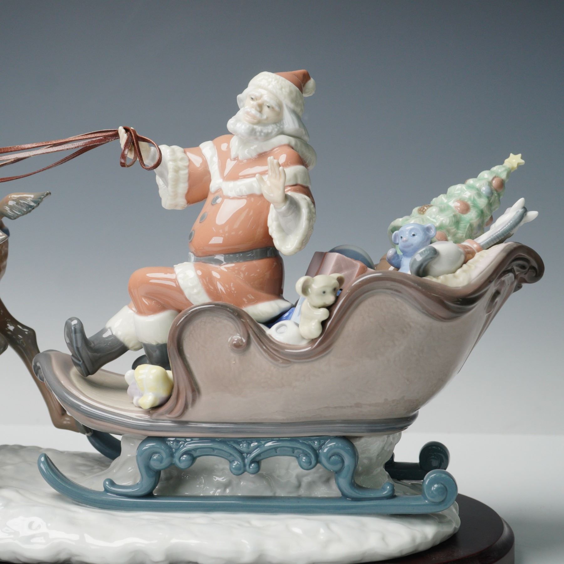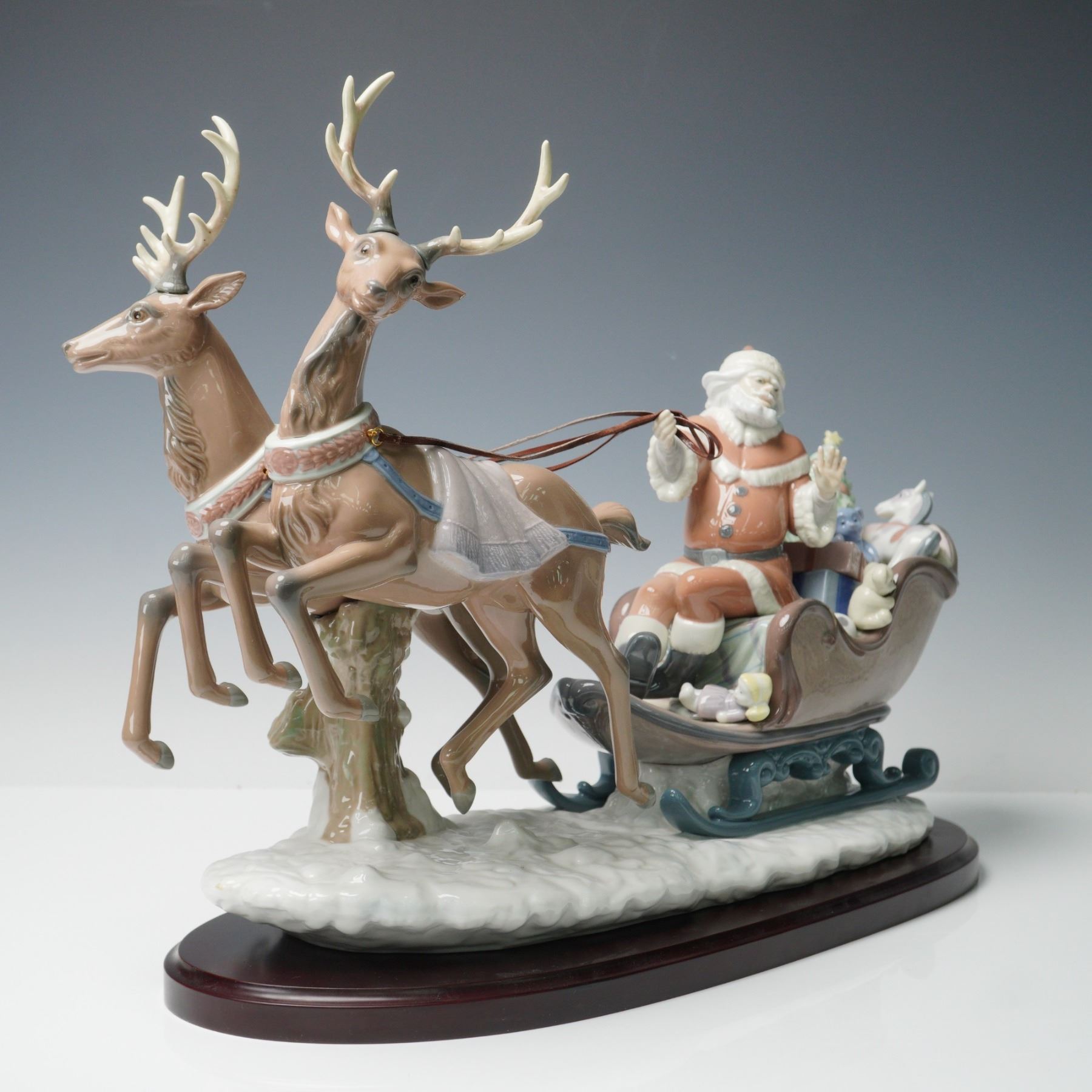 Depicting Santa Claus in a sleigh filled with toys and a decorated Christmas tree, being pulled by two reindeer mid-leap over a snowy base. The detailed hand-painted composition includes Santa holding the reins, various presents including a teddy bear and toy monkey, and finely modeled reindeer with elaborate antlers and harnesses. Lladro backstamp. Base and box included.