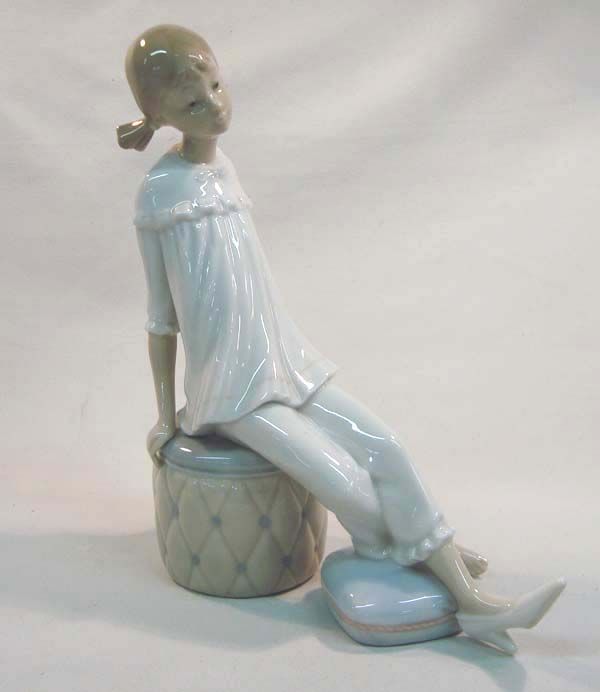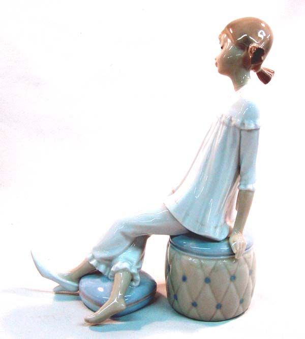 Lladro Porcelain Girl on Stool With High Heeled Shoe. Lovely Lladro figurine of a young girl ''dreaming'' about the day she'll wear high heels. The Lladro trademark is on the bottom. The mold is retired. It is in excellent condition and measures 7.5''H x 6.5''W.