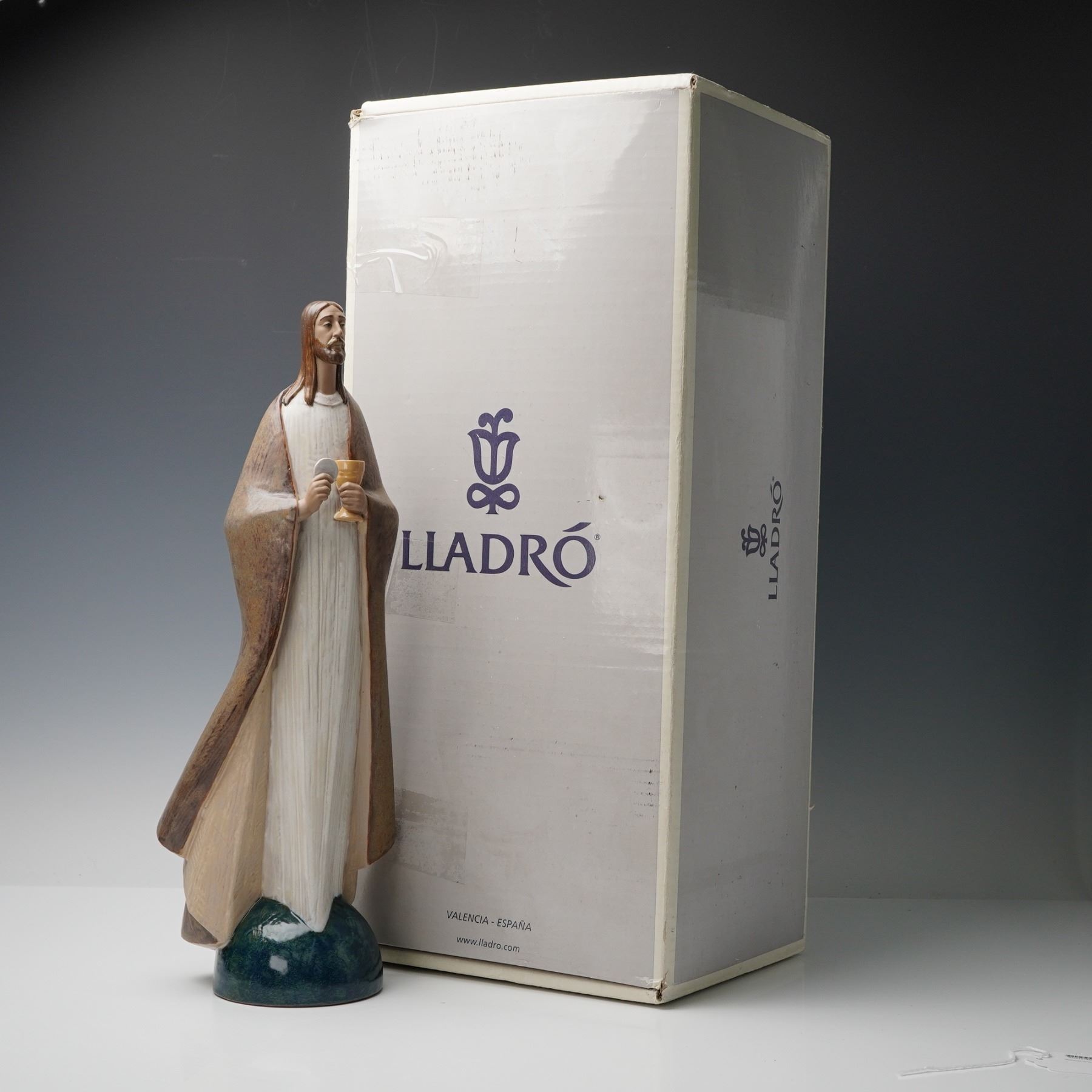 Jesus holding a chalice and host. Designed with a serene expression and long flowing robes in natural earth tones, the piece stands upon a deep green glazed base. The figure bears the Lladro hallmark stamp and the number 2366 on the underside, indicating its authenticity. Model number 01012366, signed with the Lladro logo. This item has its original box.