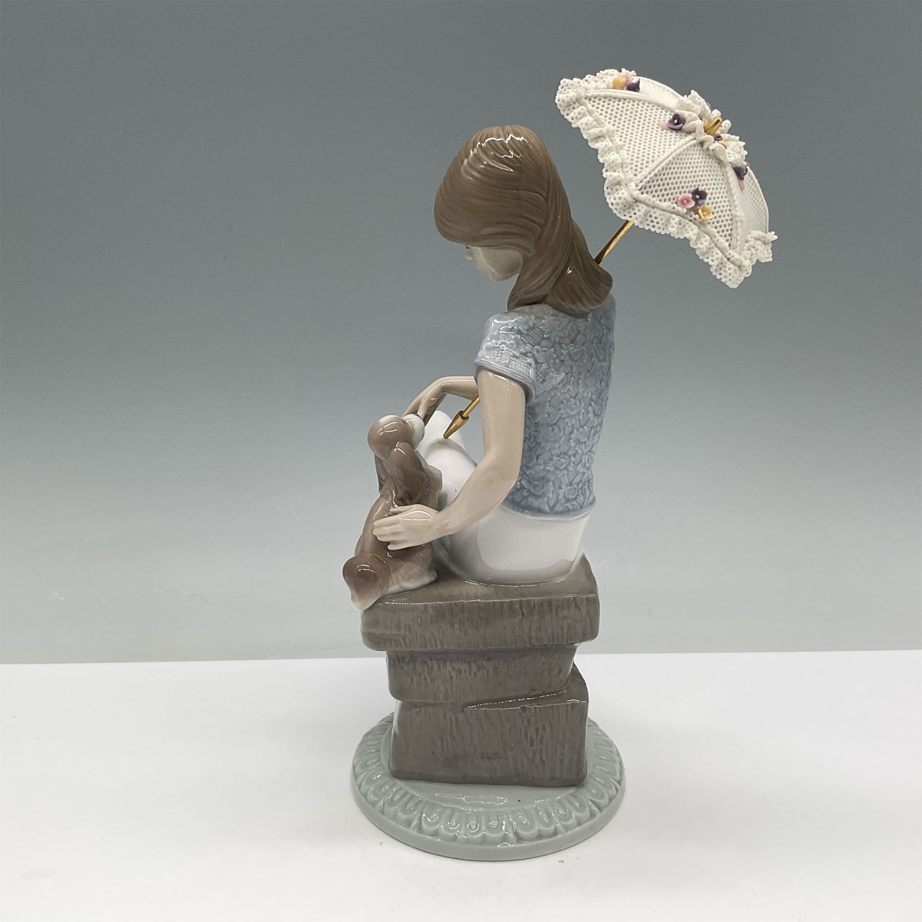 Lladro porcelain figurine titled Picture Perfect, model number 01007612, sculpted by Juan Huerta. This elegant piece features a young girl seated on a stone bench, playfully interacting with a puppy. She holds a delicate parasol with intricate lace-like detailing and floral accents. The figurine showcases soft pastel tones and textured patterns, highlighting Lladro signature craftsmanship and attention to detail. The base is marked with the Lladro backstamp and production details, confirming its authenticity.