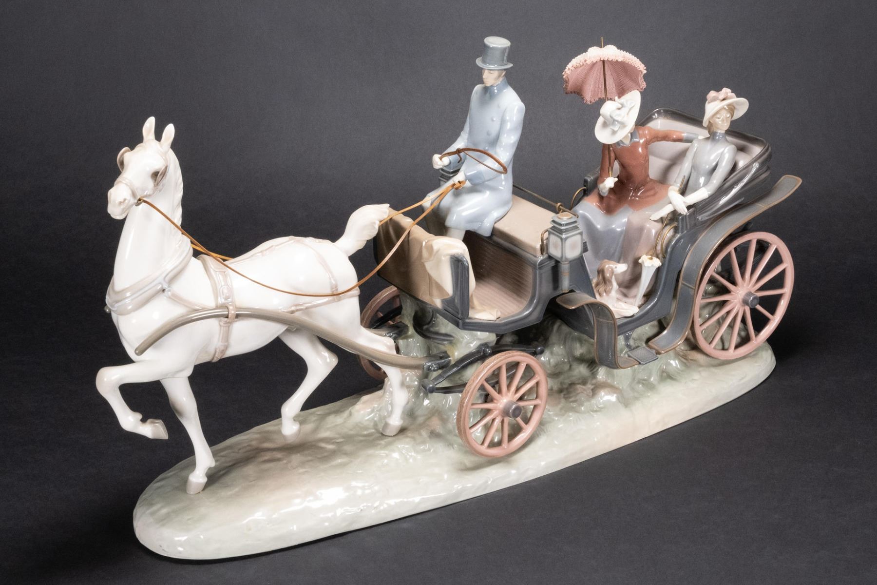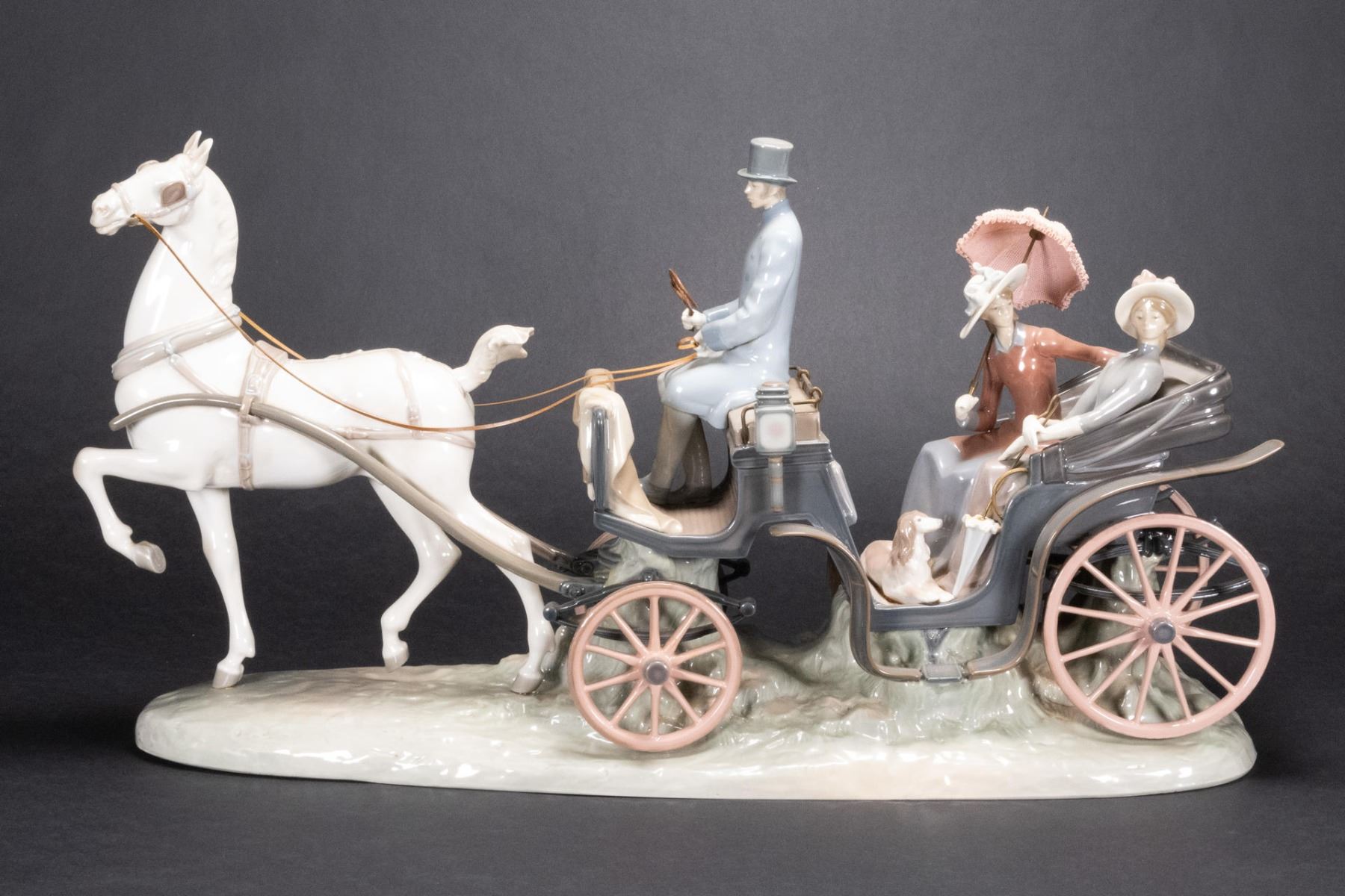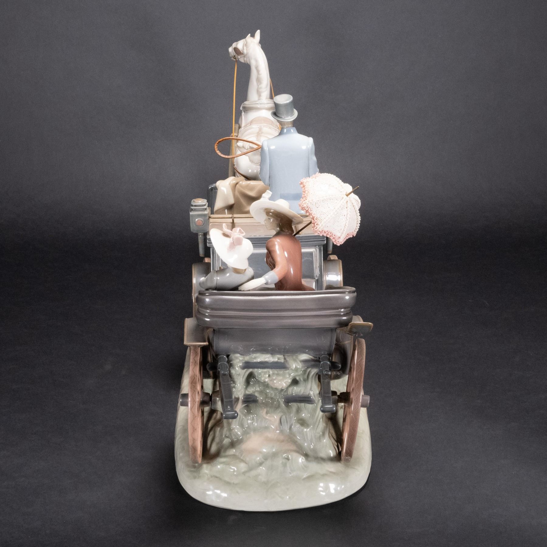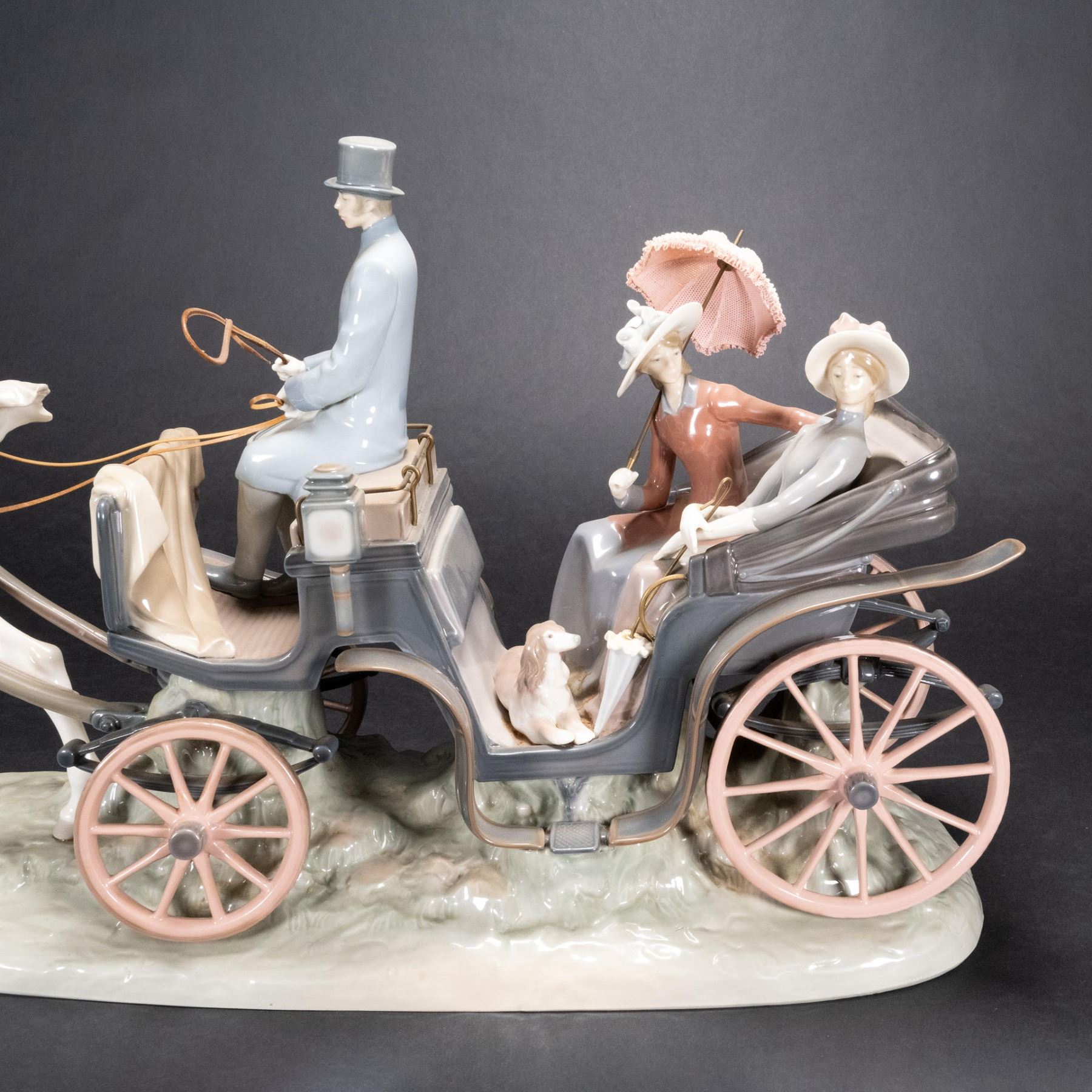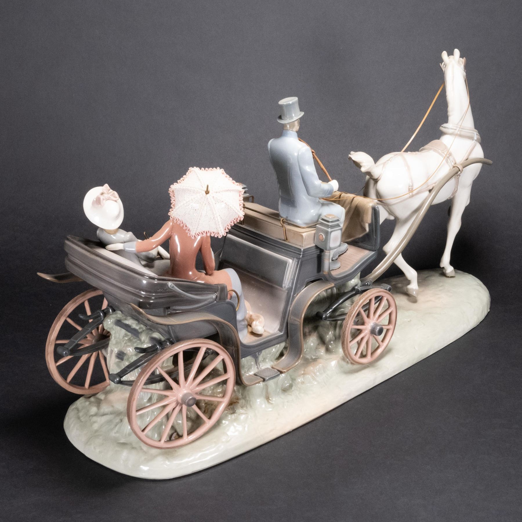 A detailed sculpture depicting a traditional horse-drawn carriage scene. The piece features a driver in a top hat guiding a white horse, with two elegantly dressed female passengers seated in the carriage, one holding a pink parasol and a small dog resting at their feet. The carriage is rendered with brown and black tones, red-rimmed wheels, and lifelike motion details in the horse's stance and reins. Lladro marked on the underside. Includes Certificate of Authenticity.